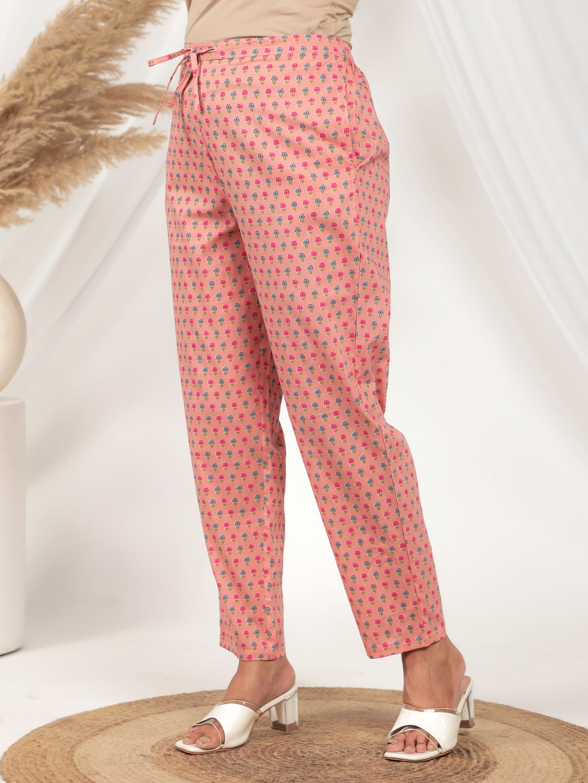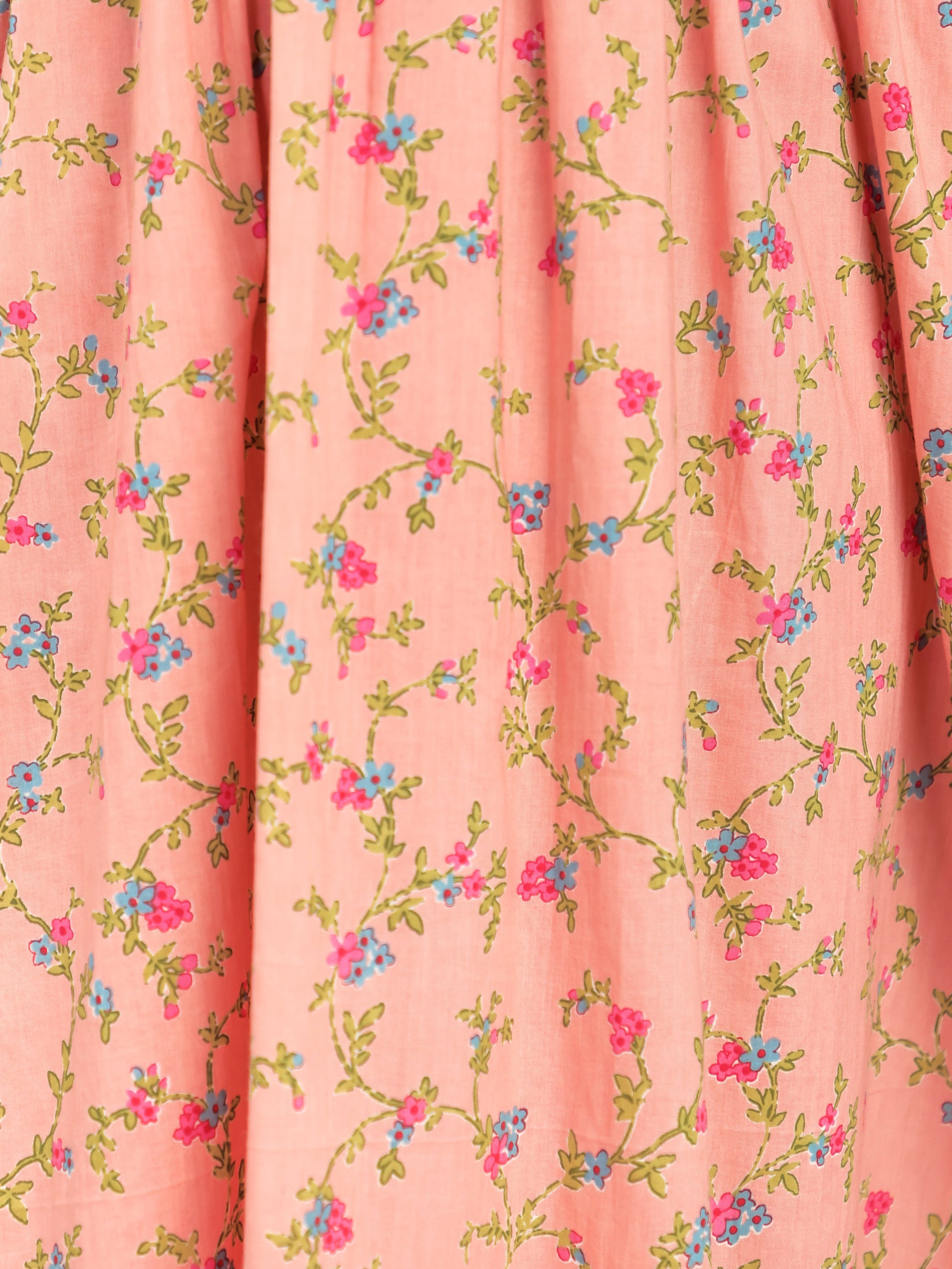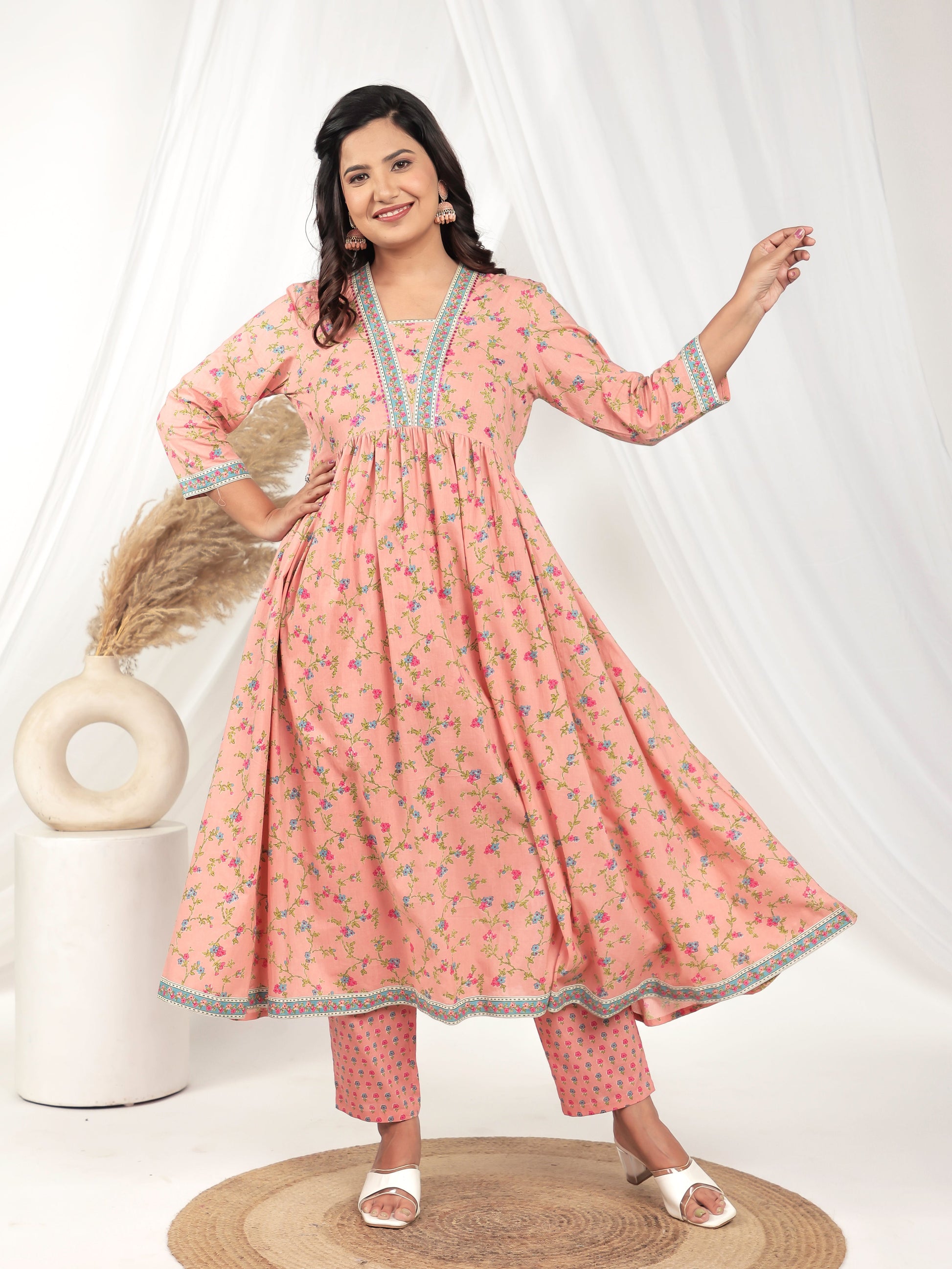 Add a touch of sophistication to your collection with this peach soft cotton floral kurta. The beautiful floral pattern complements the elegant v neckline. Delicate patch detailing elevates this piece to a statement wardrobe essential. Designed with a gathered cut that drapes beautifully. The calf length paired with 3/4 sleeves creates a proportioned silhouette. Perfect for everyday elegance or casual settings, with simple hand wash only requirements.