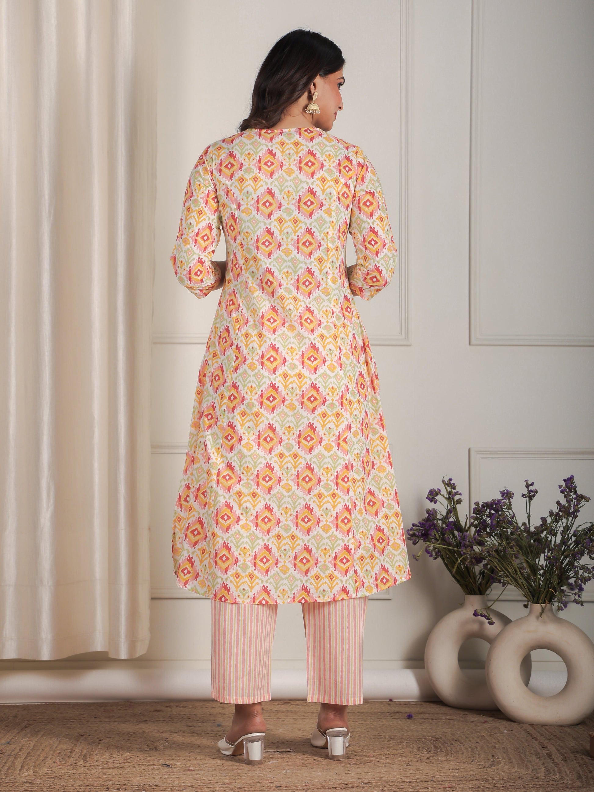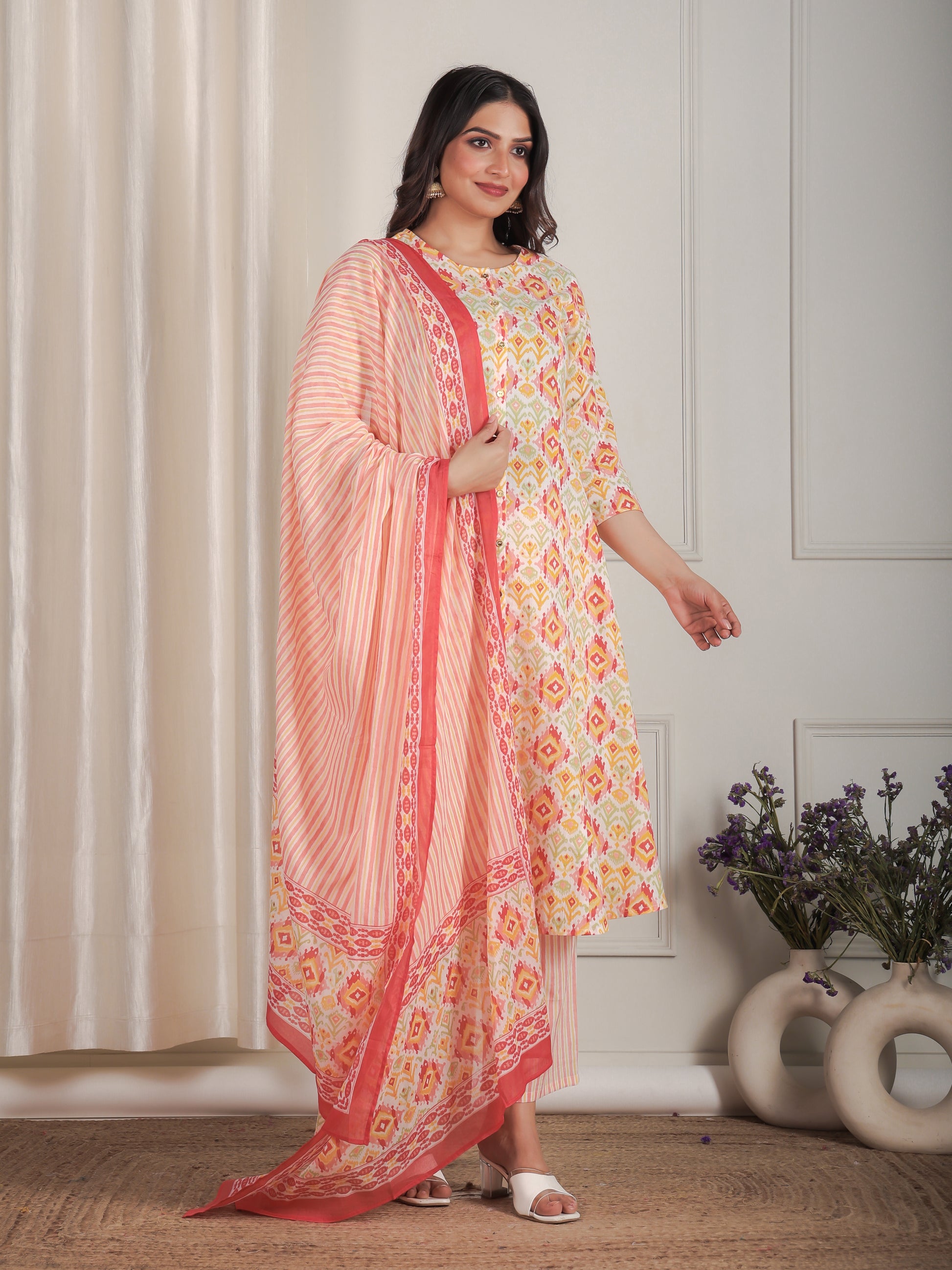 Elevate your ethnic wardrobe with this Soft Cotton kurta in a stunning Peach hue. Featuring an elegant A-line fit and striking Ikat accents, it’s perfect for festive celebrations or family gatherings. The Round neckline and 3/4 Sleeve provide all-day comfort. Team with gold-toned accessories for an effortlessly chic vibe. Maintain its charm by following proper care instructions.