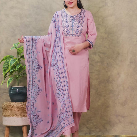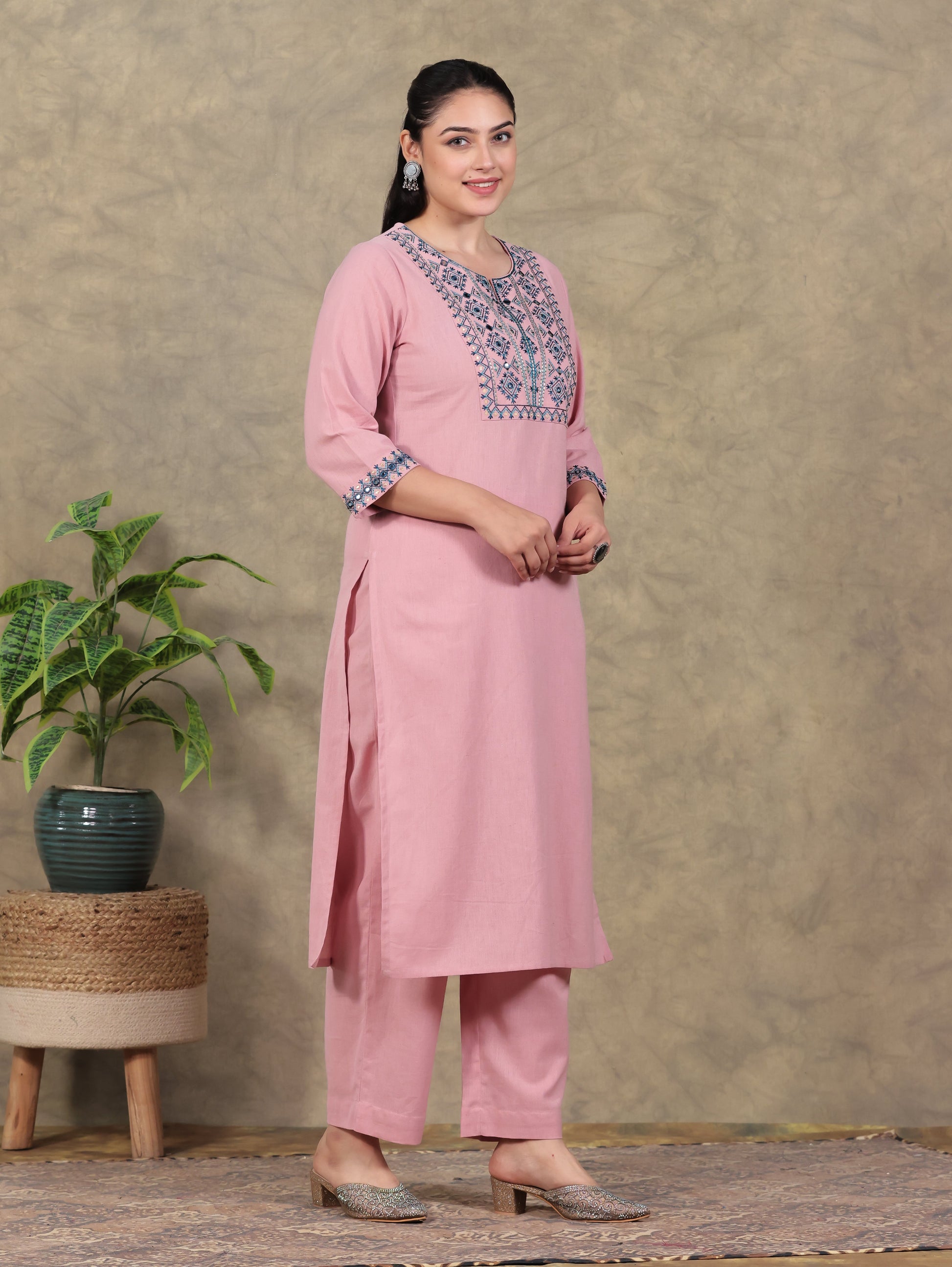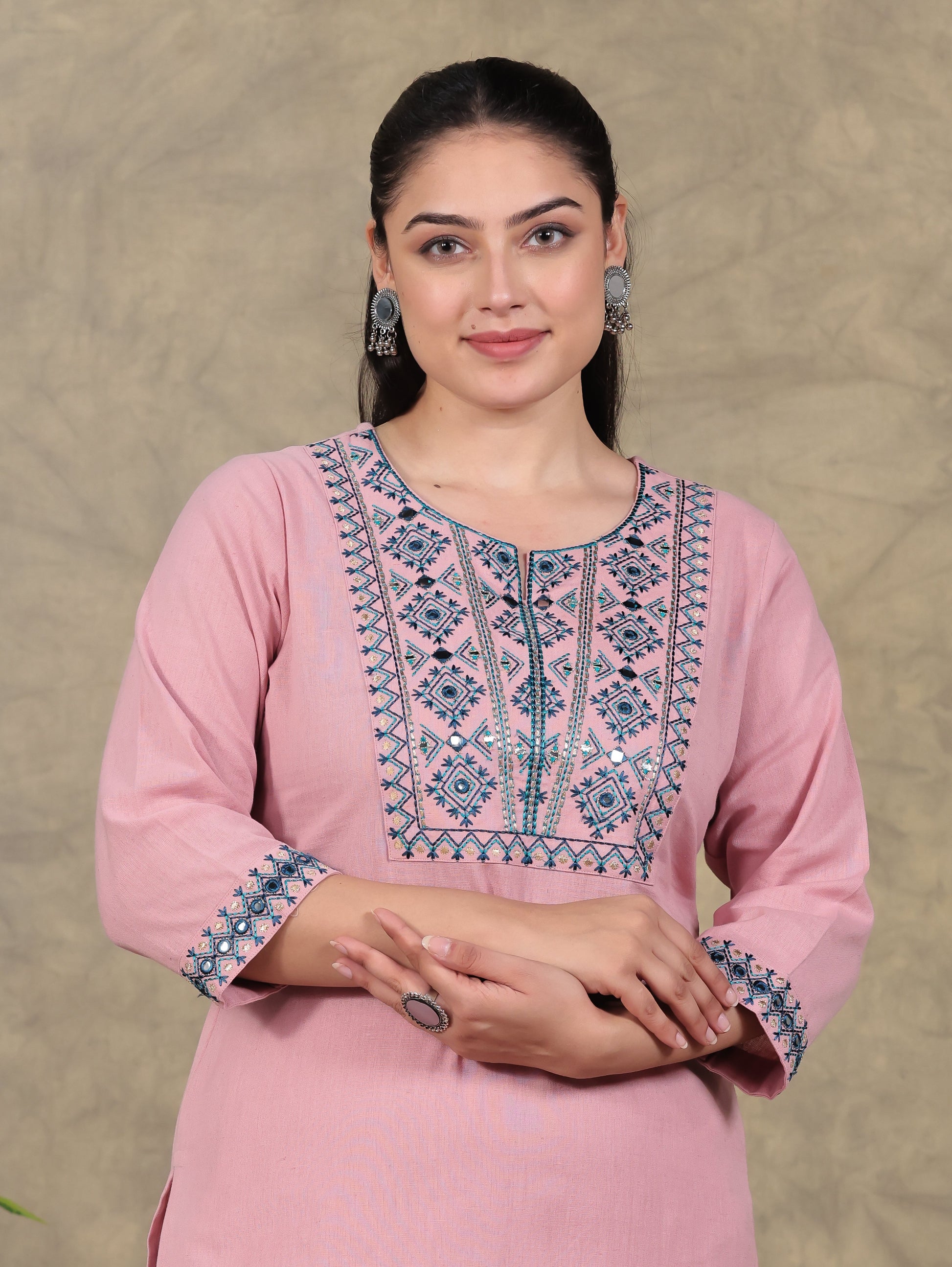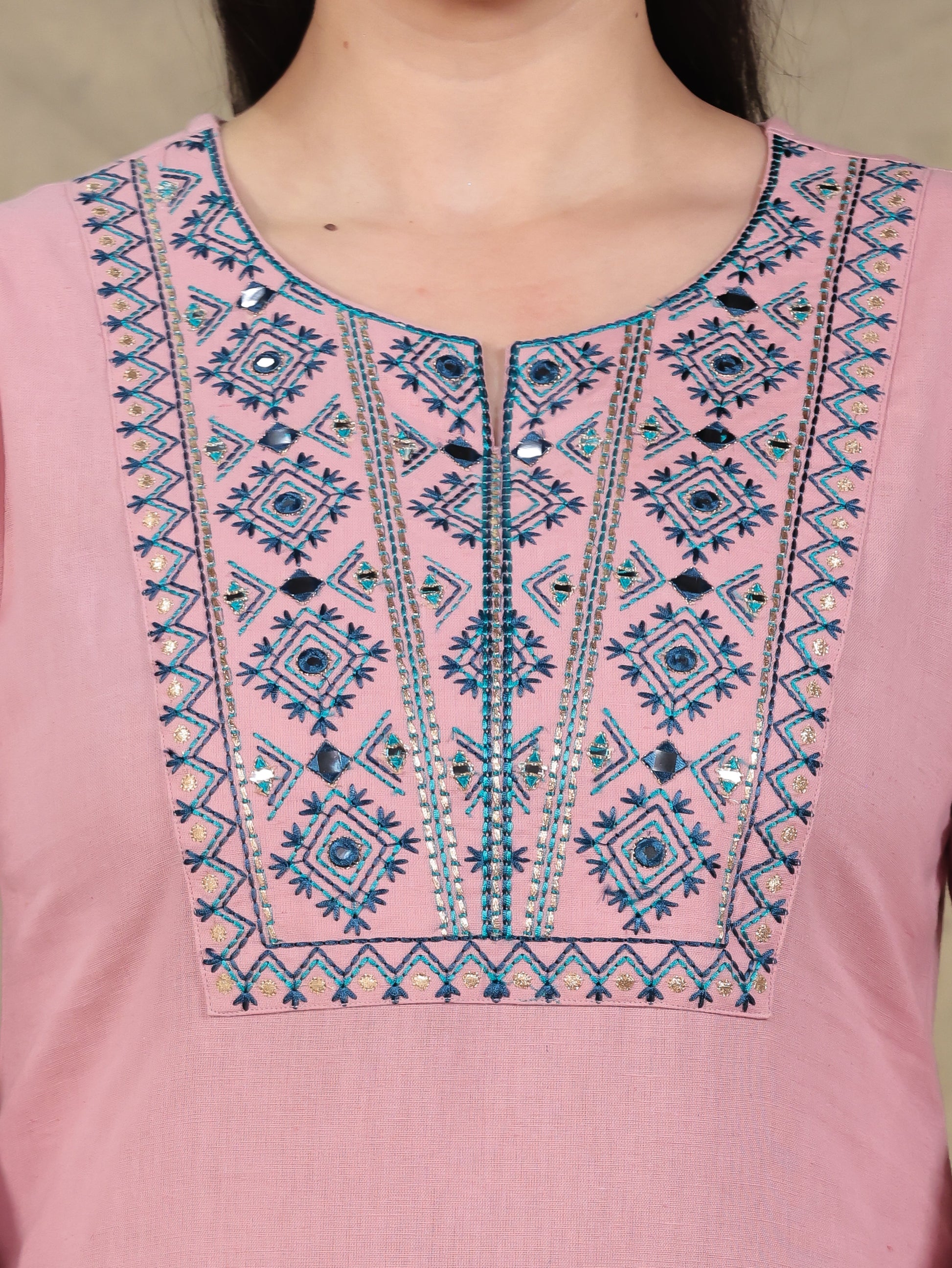 Embroidered Linen Cotton Solid Straight Peach Kurta