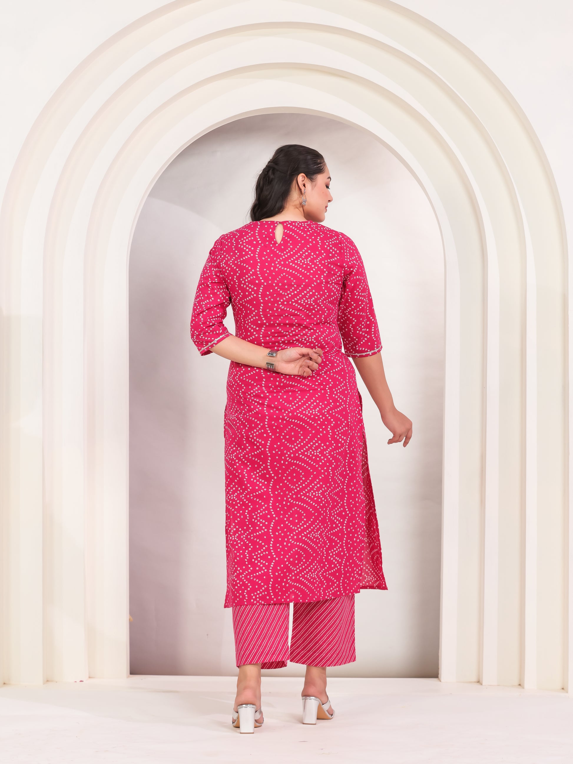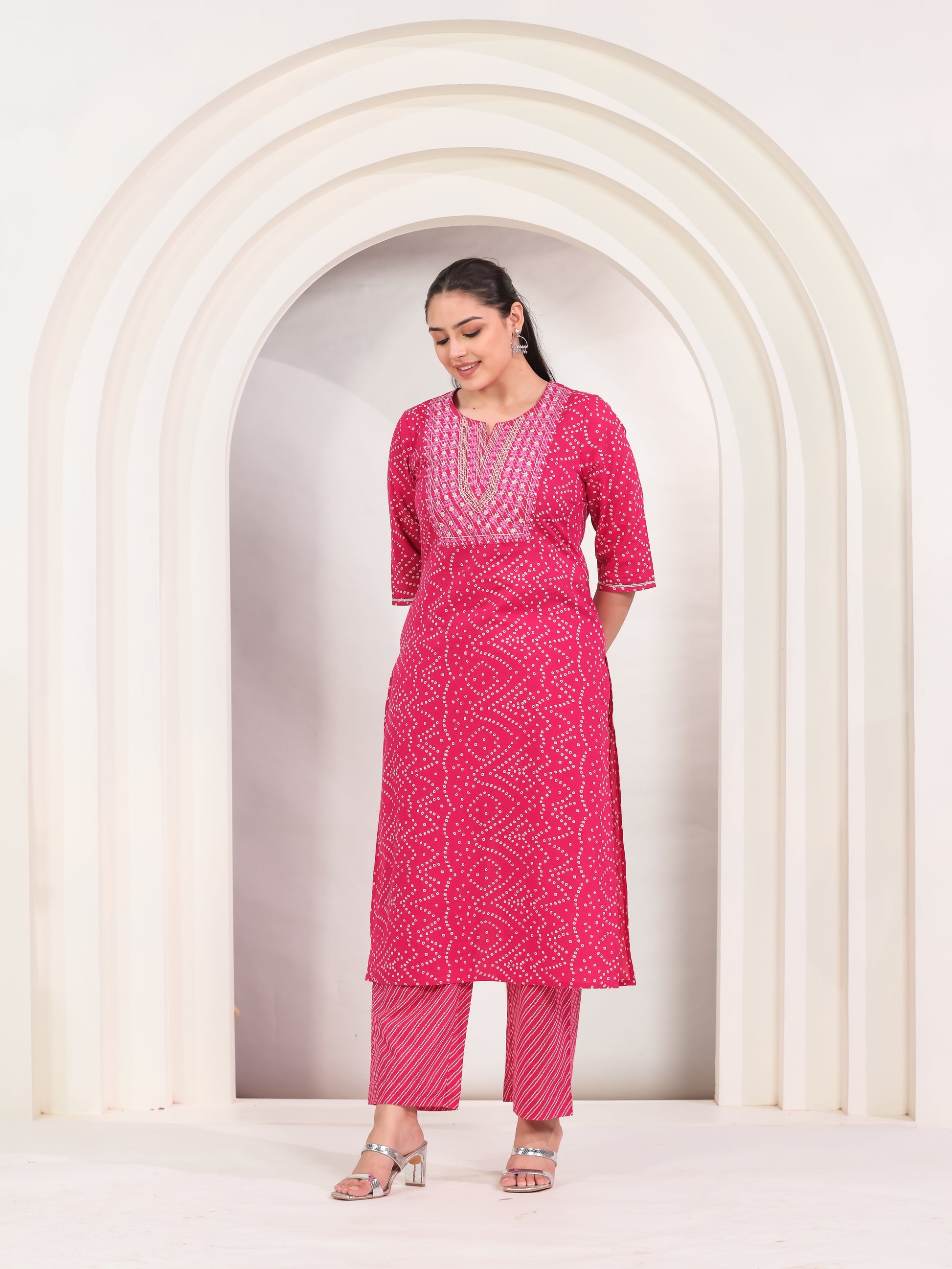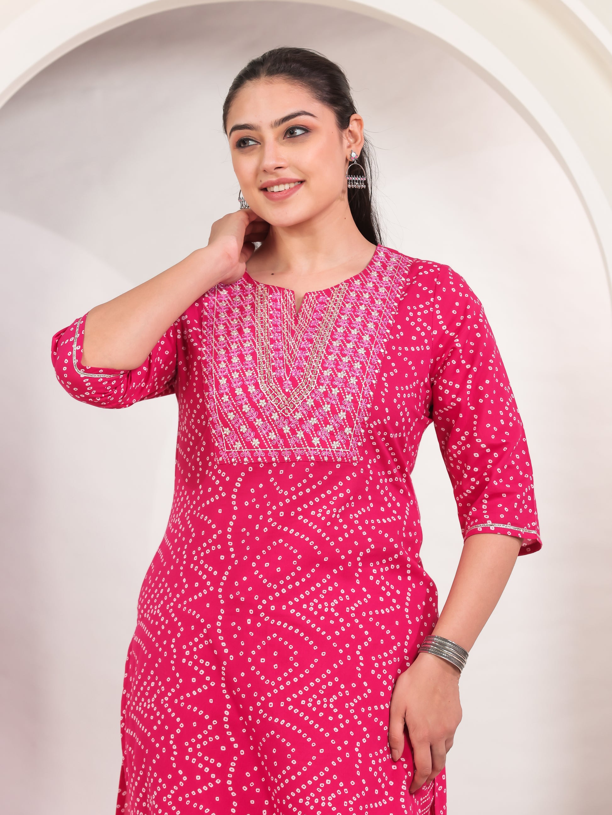 Embroidered Soft Cotton Bandhani Straight Pink Kurta