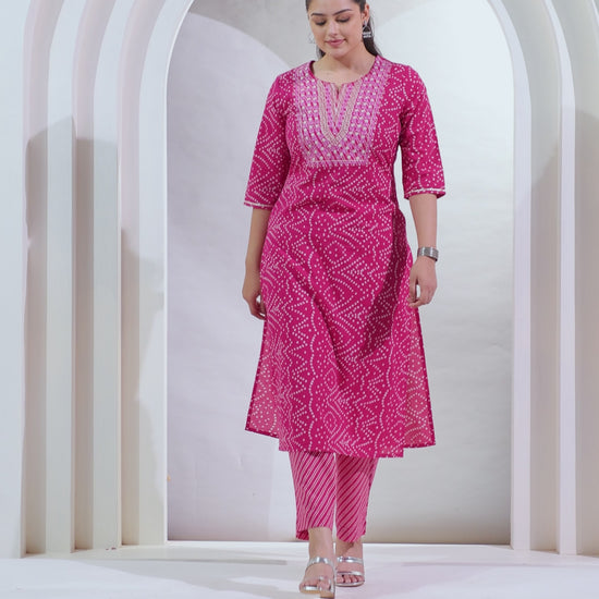 Embroidered Soft Cotton Bandhani Straight Pink Kurta