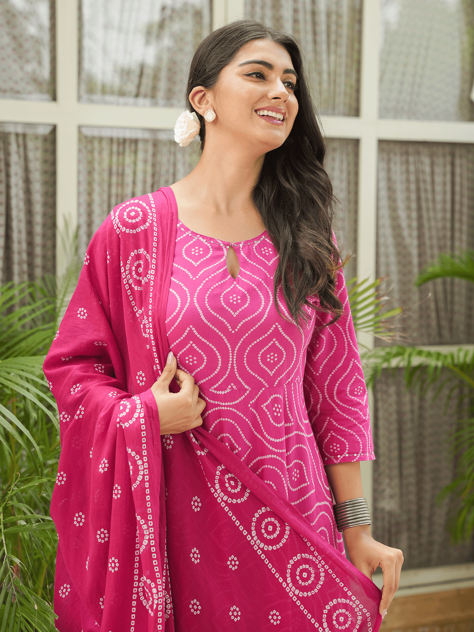 Elevate your ethnic wardrobe with this Soft Cotton kurta in a stunning Pink hue. Featuring an elegant Anarkali fit and striking Bandhani accents, it’s perfect for festive celebrations or family gatherings. The Round neckline and 3/4 Sleeve provide all-day comfort. Team with gold-toned accessories for an effortlessly chic vibe. Maintain its charm by following proper care instructions.