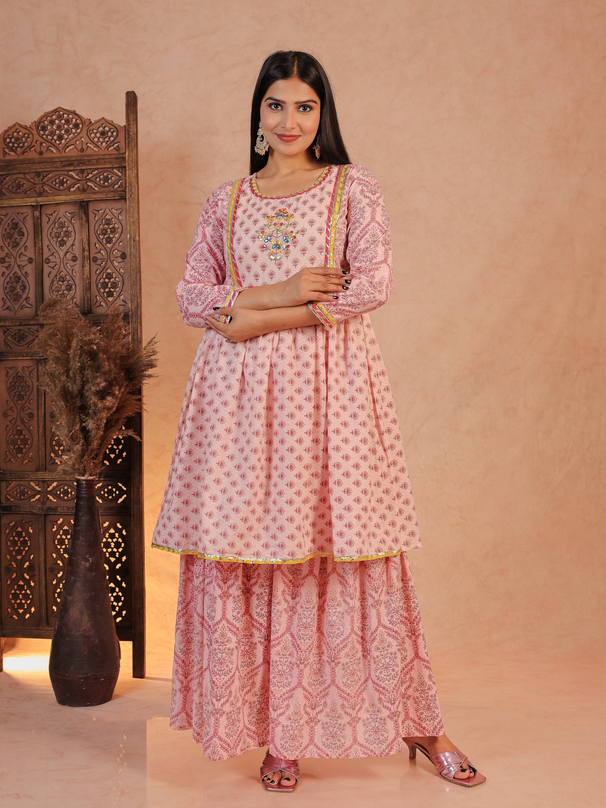 This Pink Flared kurta in soft Soft Cotton is a timeless pick for festive and casual wear. Designed with a Round neckline and Full Sleeve sleeves, its graceful Knee Length cut flatters all body types. The delicate Floral detailing adds a touch of sophistication. Pair it with statement earrings and juttis for a polished look. Maintain its pristine look by following proper care instructions.