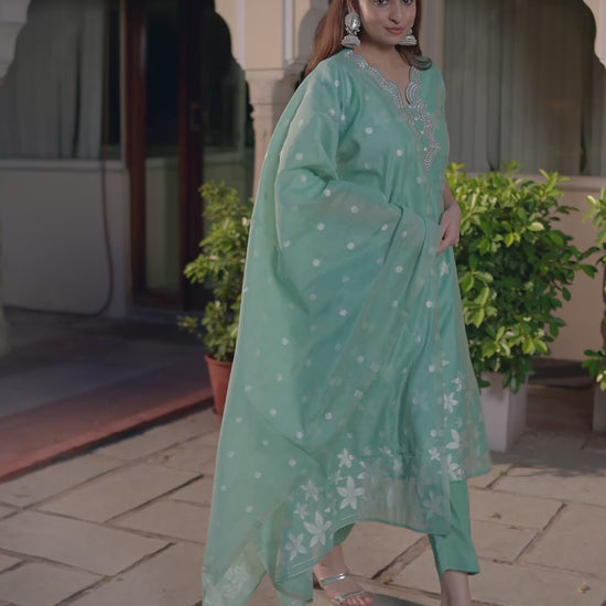This Green Chanderi kurta with a Straight flare is designed for comfort and style. Featuring a V neckline, 3/4 Sleeve sleeves, and a graceful Calf Length hemline, it’s perfect for festive wear or semi-formal gatherings. The Floral highlights add depth and texture, making it a standout piece. Accessorise with a contrasting dupatta and keep it pristine by following proper care instructions.