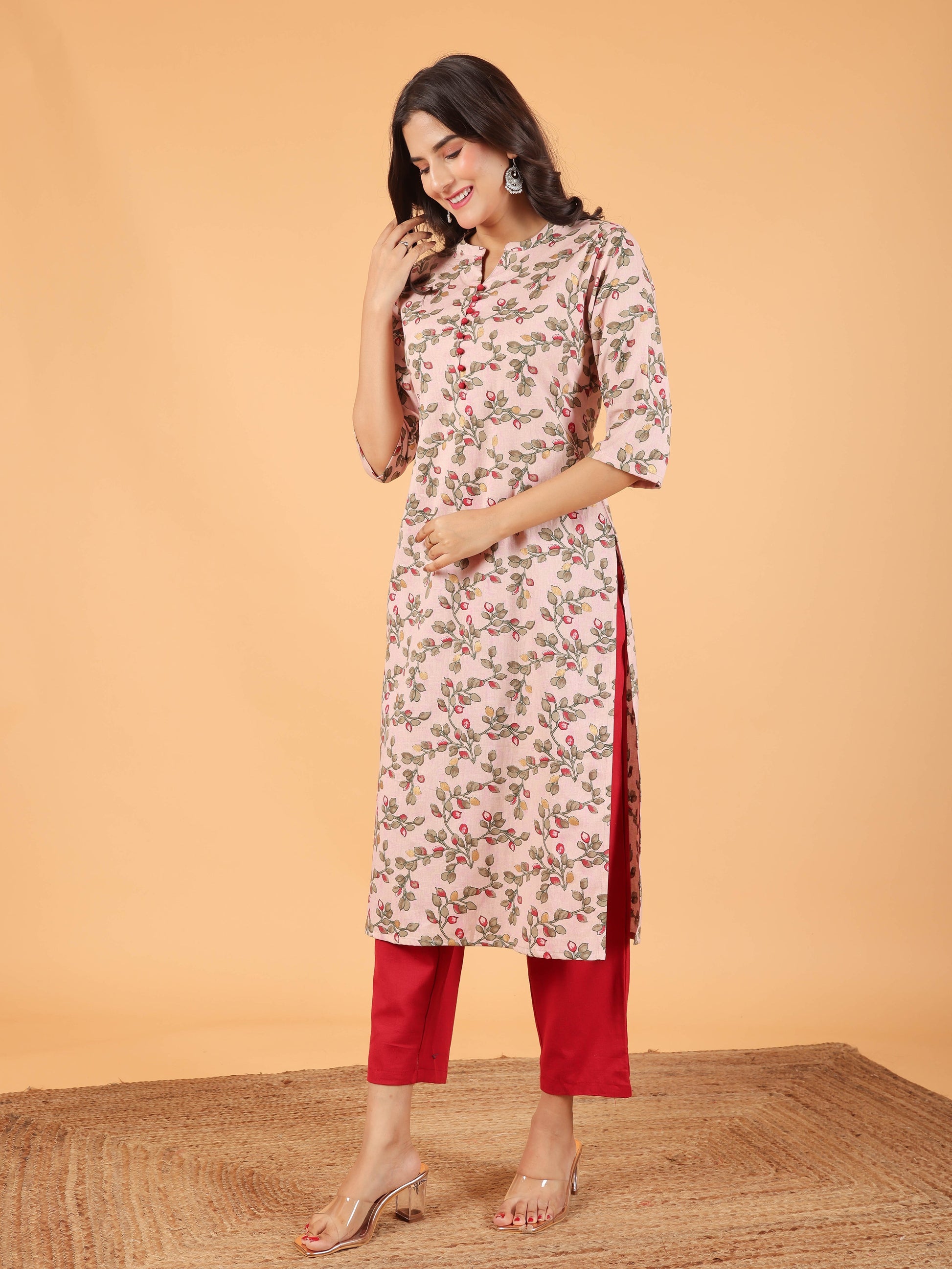Crafted from breathable Linen Cotton, this Straight kurta in Pink blends traditional design with everyday comfort. The Floral finish adds artisanal charm, while the Calf Length silhouette ensures effortless elegance. Style with palazzos or leggings for versatile looks, from workdays to weekend outings. Designed for easy care, this kurta stays beautiful with simple care instructions.