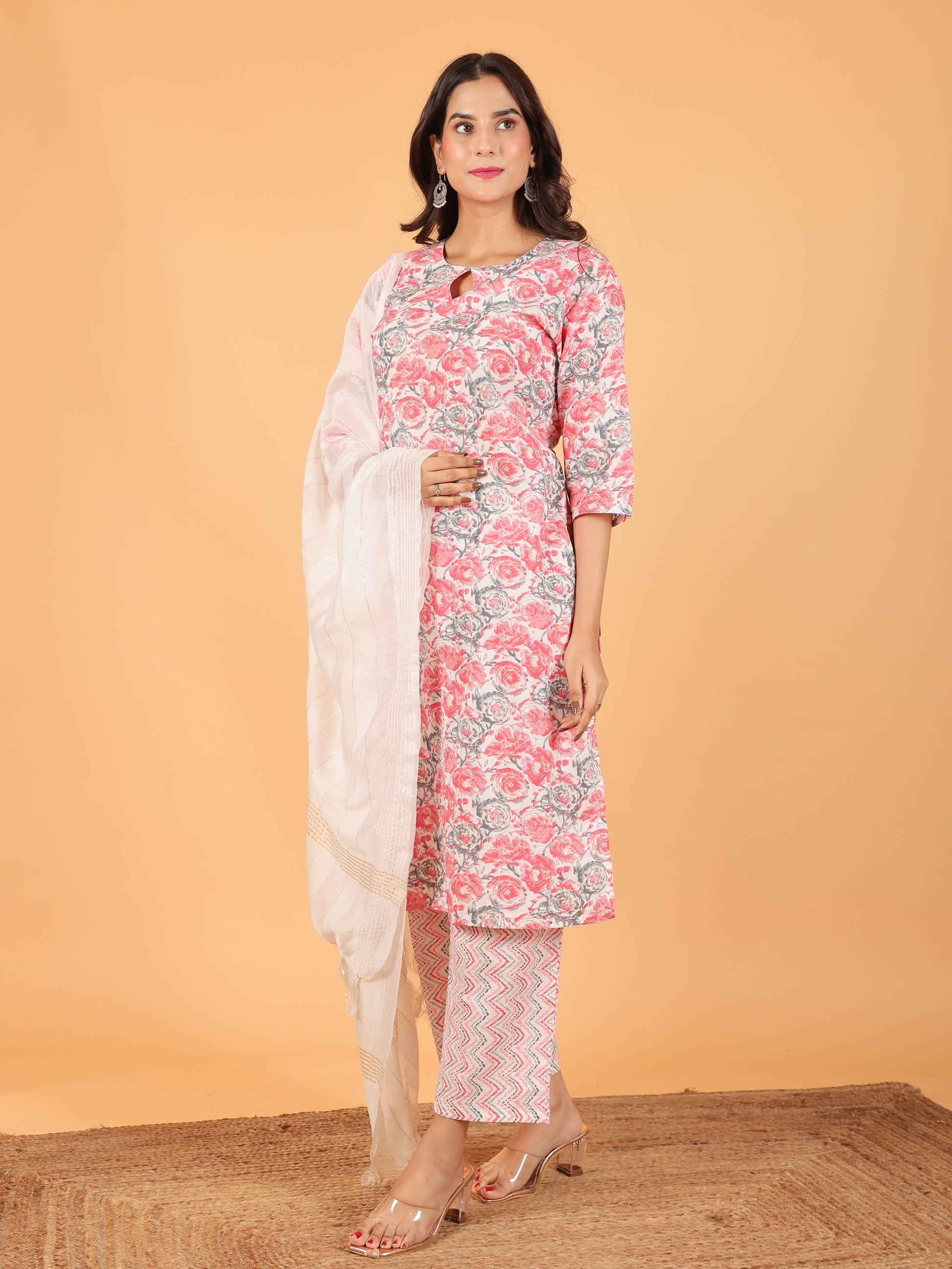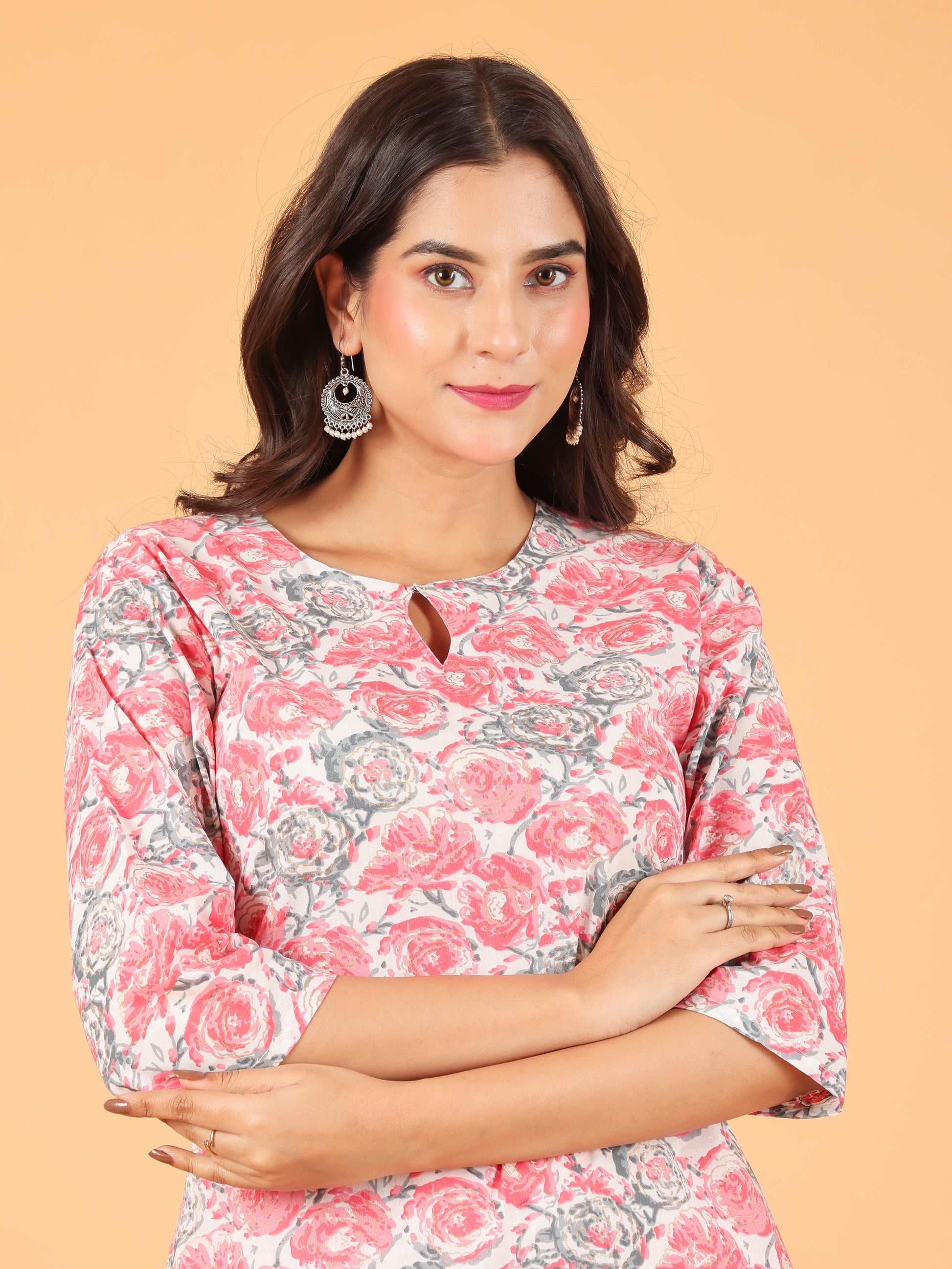 This Pink Straight kurta in soft Soft Cotton is a timeless pick for festive and casual wear. Designed with a Keyhole neckline and 3/4 Sleeve sleeves, its graceful Calf Length cut flatters all body types. The delicate Floral detailing adds a touch of sophistication. Pair it with statement earrings and juttis for a polished look. Maintain its pristine look by following proper care instructions.