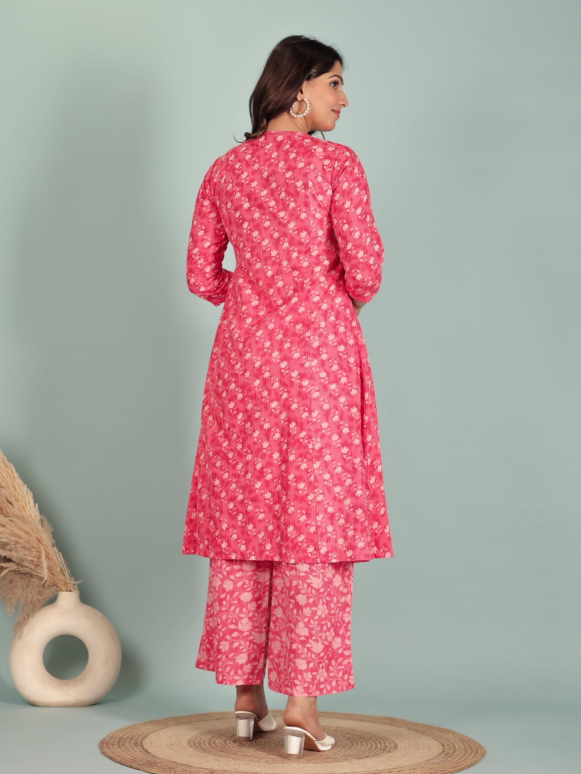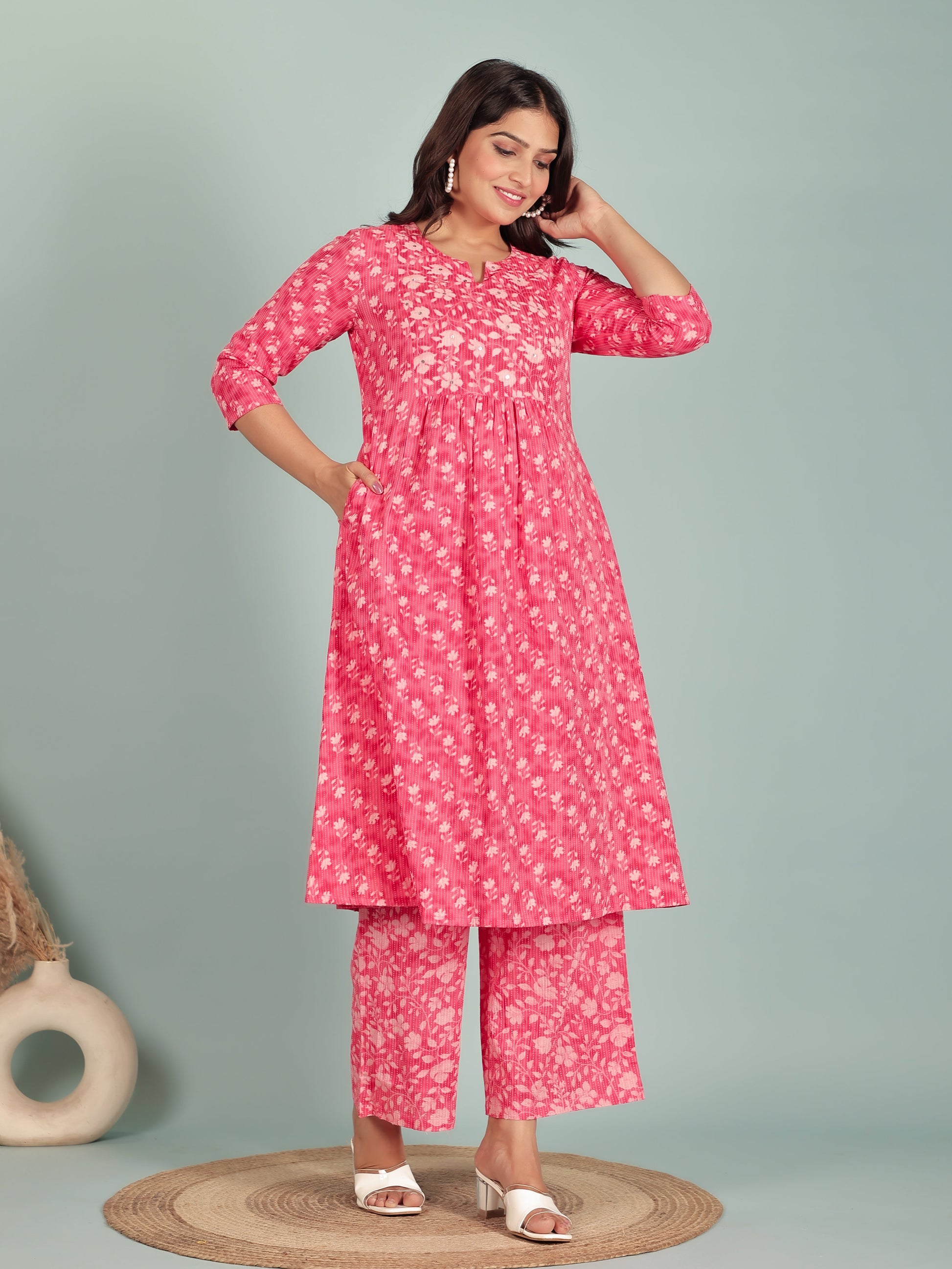 Crafted from breathable Kantha Cotton, this Panelled kurta in Pink blends traditional design with everyday comfort. The Floral finish adds artisanal charm, while the Calf Length silhouette ensures effortless elegance. Style with palazzos or leggings for versatile looks, from workdays to weekend outings. Designed for easy care, this kurta stays beautiful with simple care instructions.
