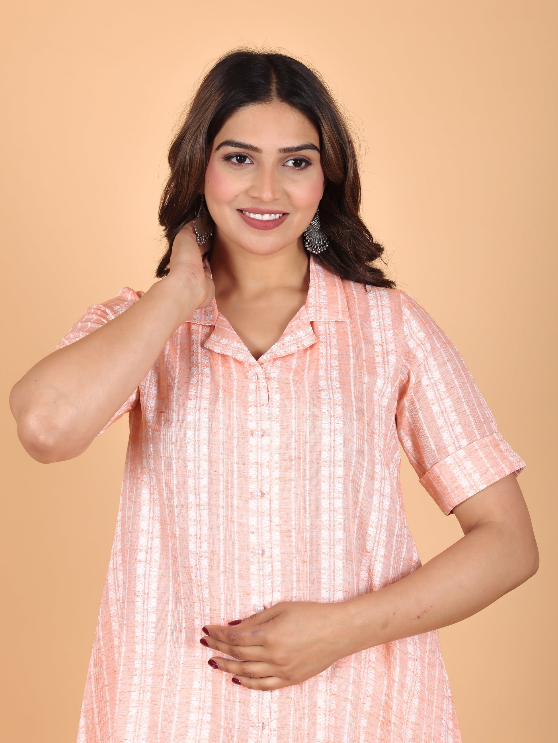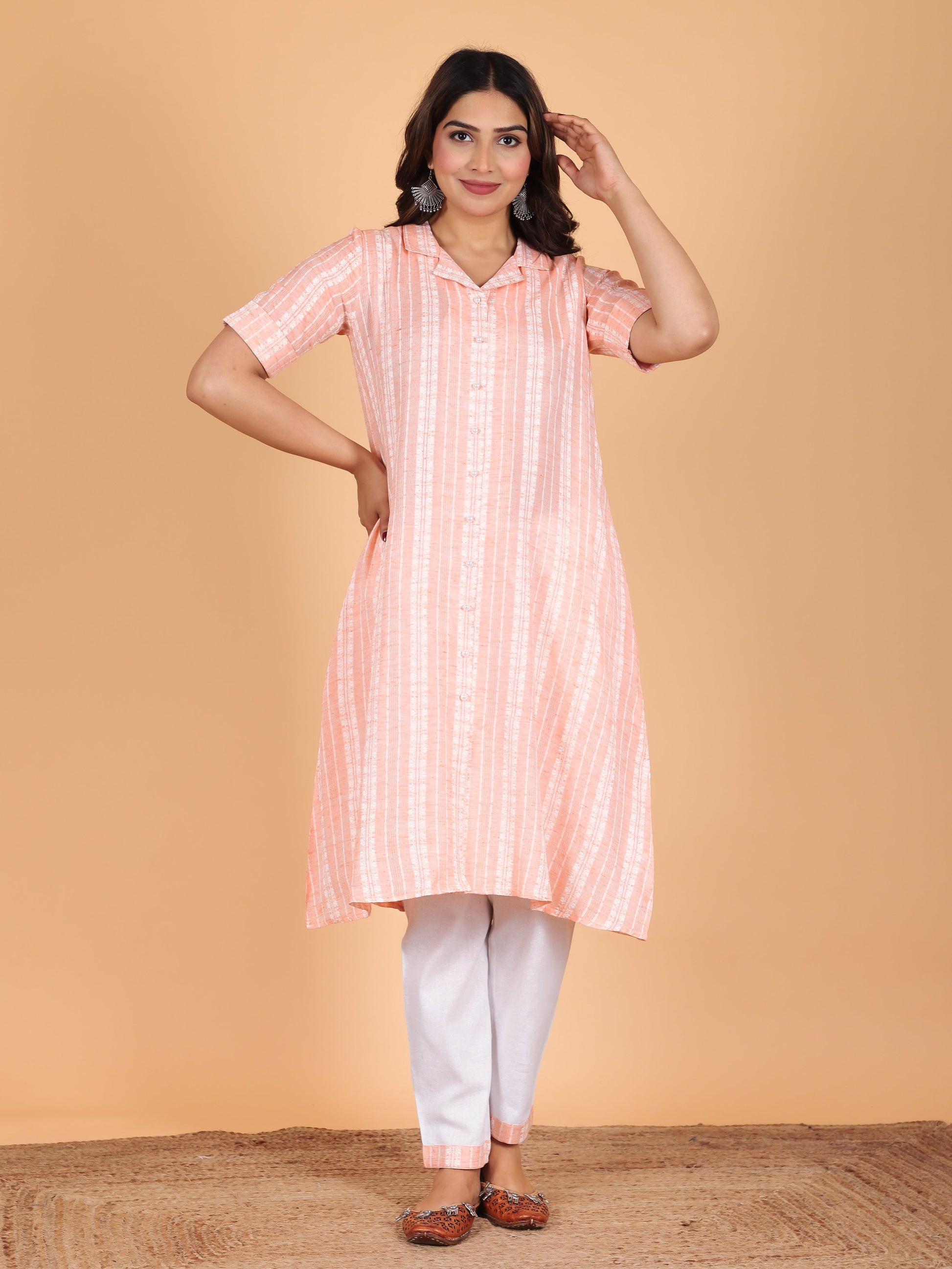 This Pink A-line kurta in soft Blend Cotton is a timeless pick for festive and casual wear. Designed with a Collared neckline and Elbow Length Sleeve sleeves, its graceful Calf Length cut flatters all body types. The delicate Self Design detailing adds a touch of sophistication. Pair it with statement earrings and juttis for a polished look. Maintain its pristine look by following proper care instructions.