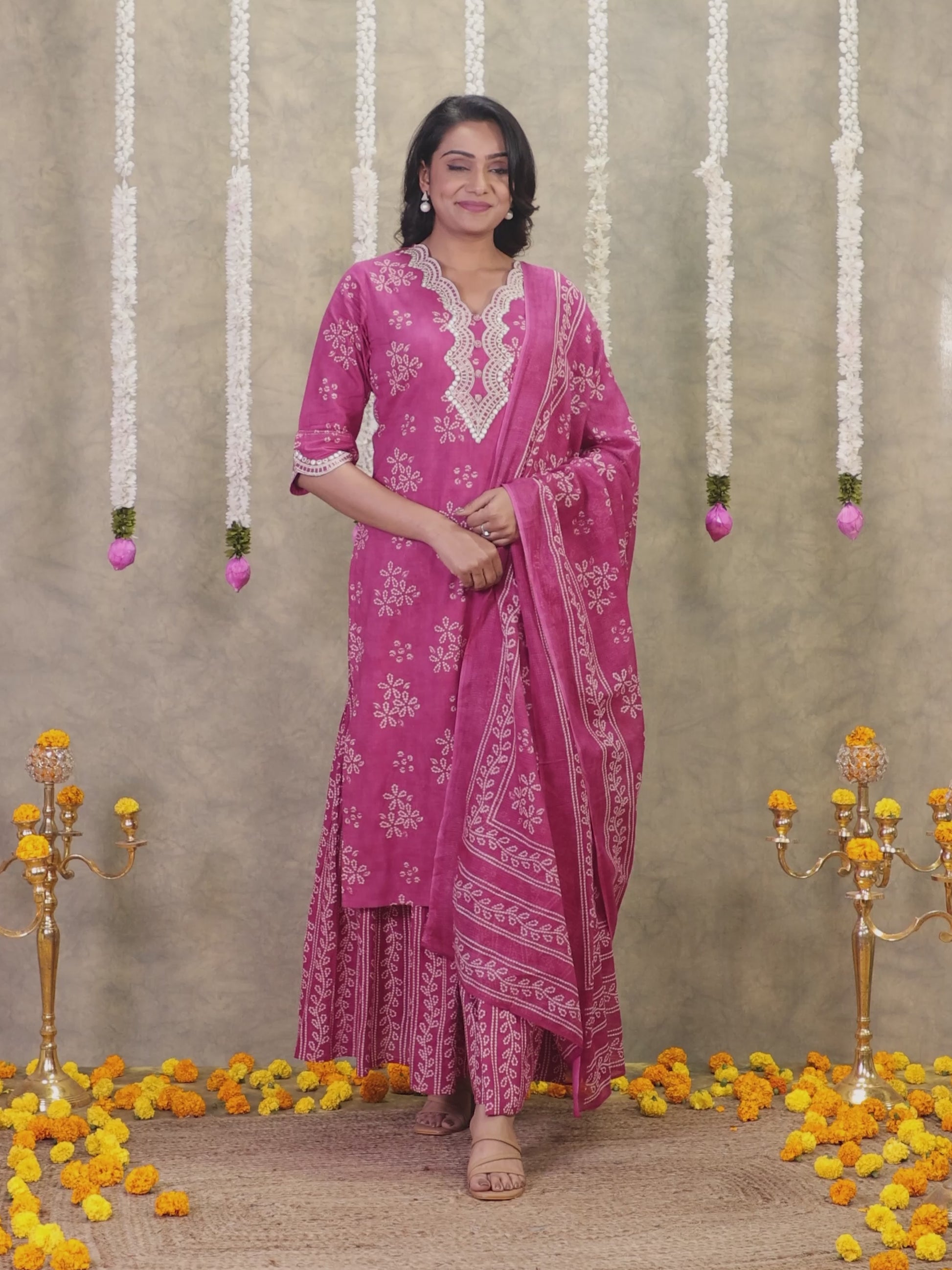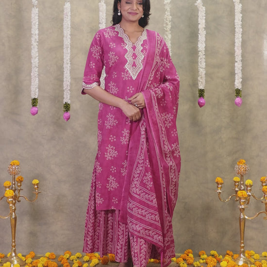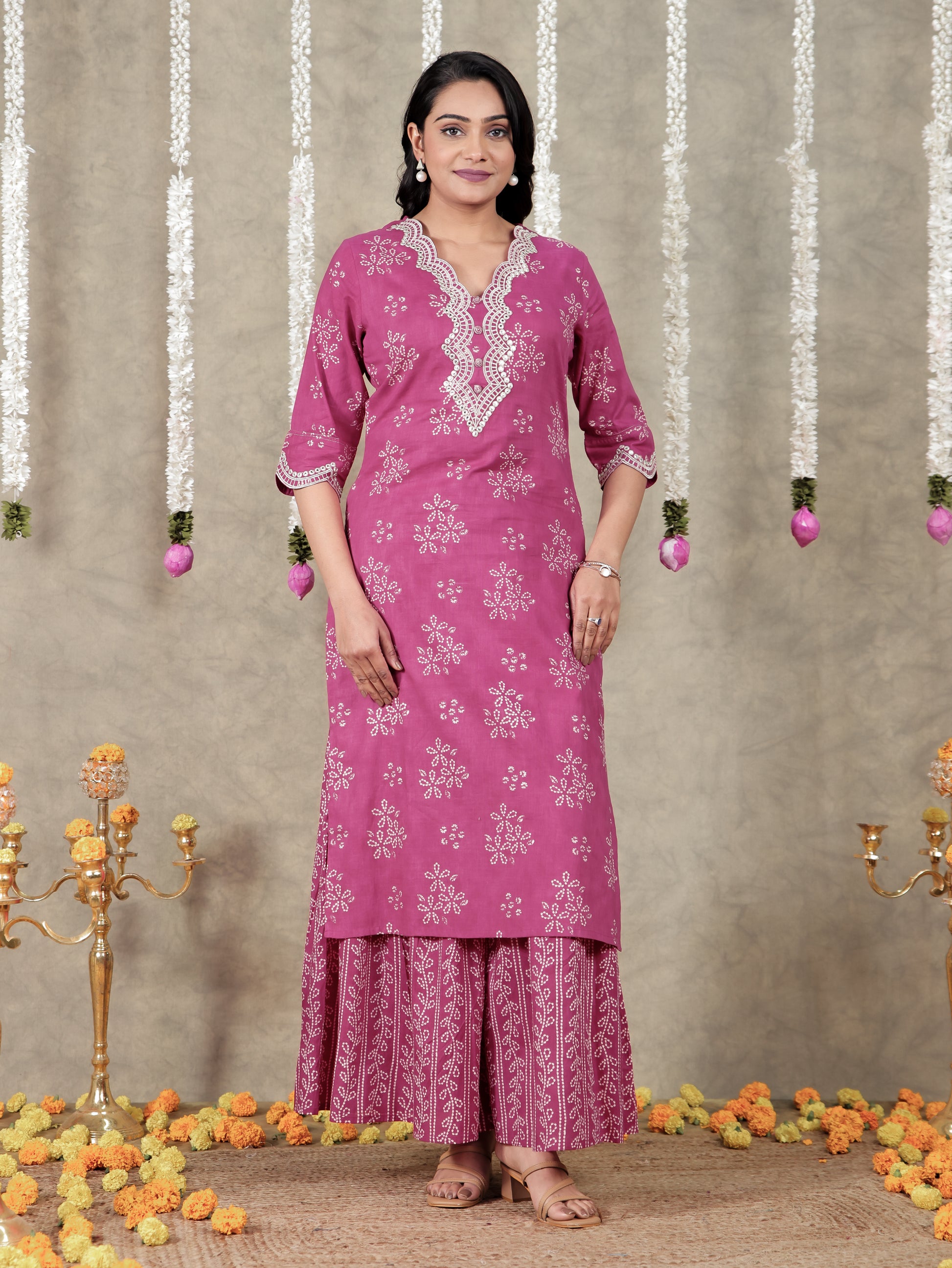This Pink Straight kurta in soft Soft Cotton is a timeless pick for festive and casual wear. Designed with a V neckline and 3/4 Sleeve sleeves, its graceful Calf Length cut flatters all body types. The delicate Floral detailing adds a touch of sophistication. Pair it with statement earrings and juttis for a polished look. Maintain its pristine look by following proper care instructions.