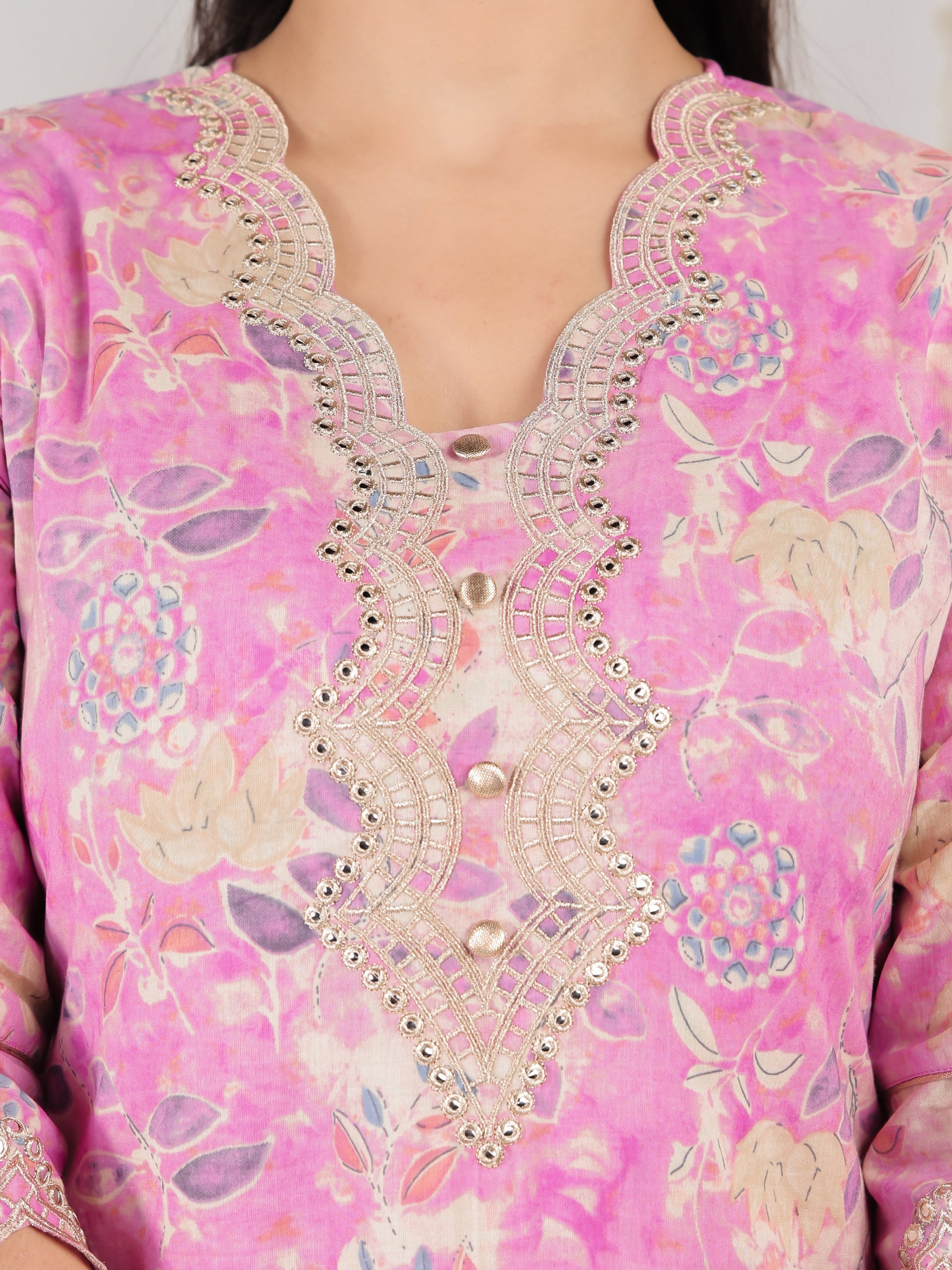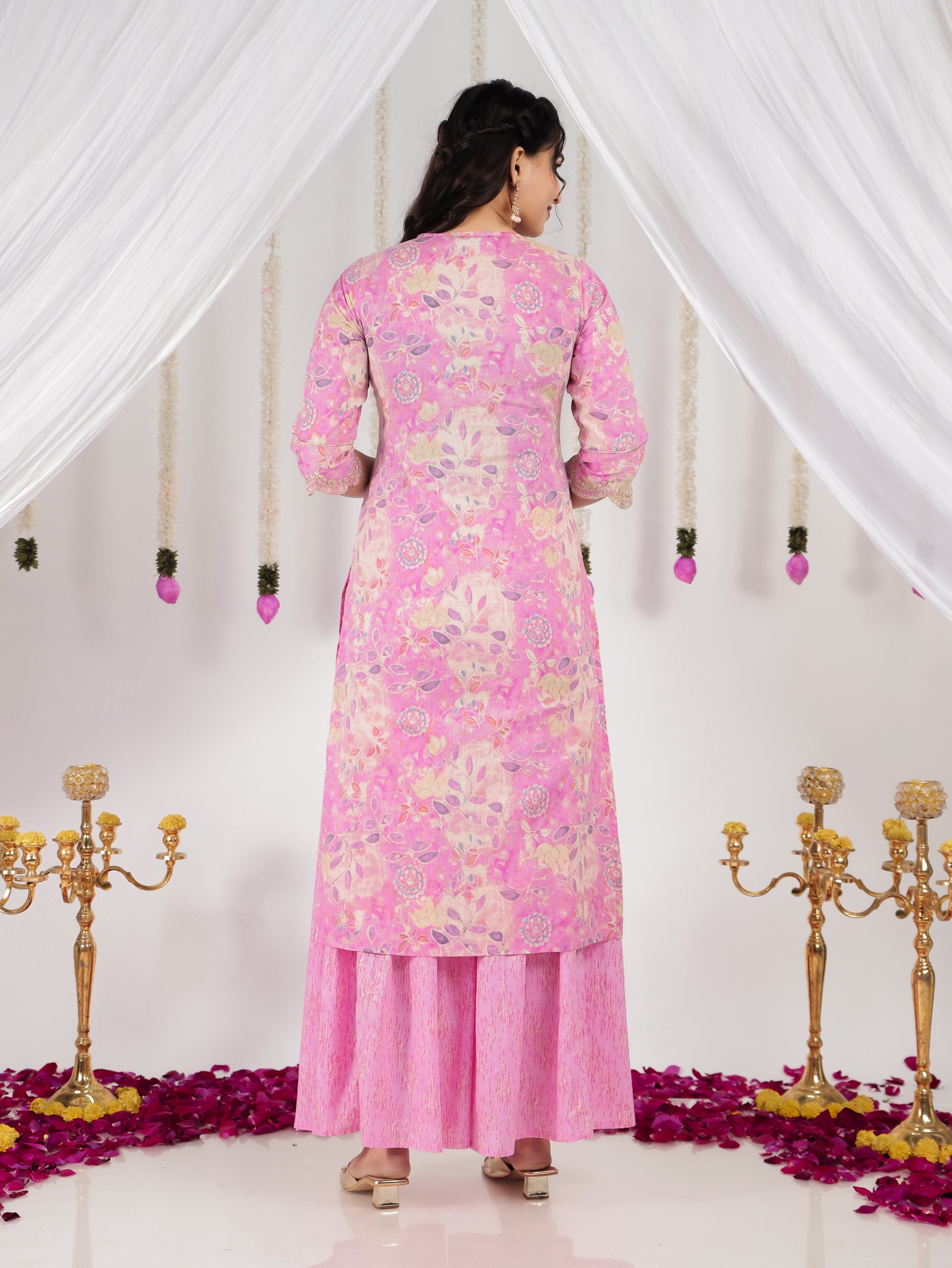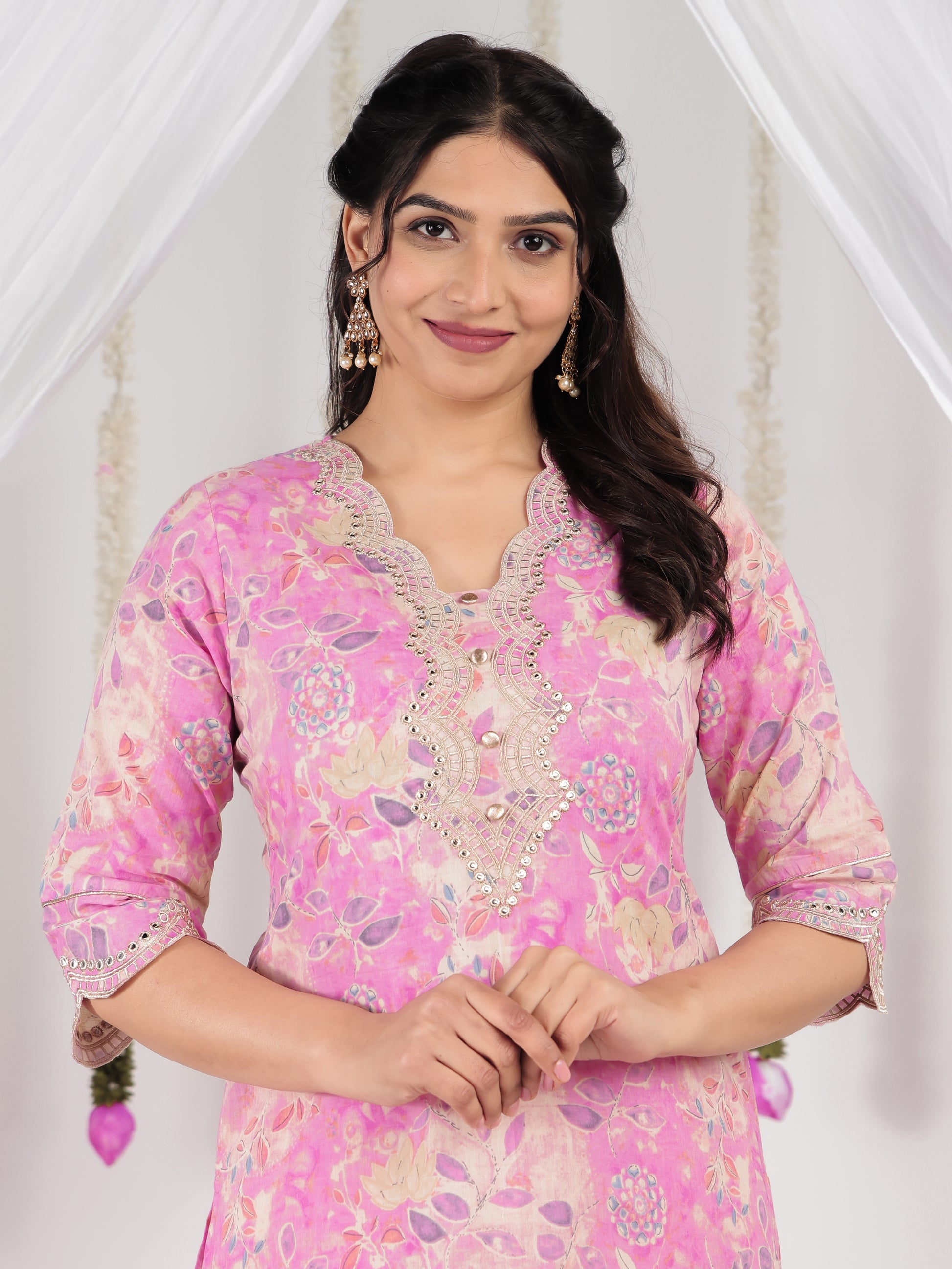 This Pink Straight kurta in soft Soft Cotton is a timeless pick for festive and casual wear. Designed with a V neckline and 3/4 Sleeve sleeves, its graceful Calf Length cut flatters all body types. The delicate Floral detailing adds a touch of sophistication. Pair it with statement earrings and juttis for a polished look. Maintain its pristine look by following proper care instructions.