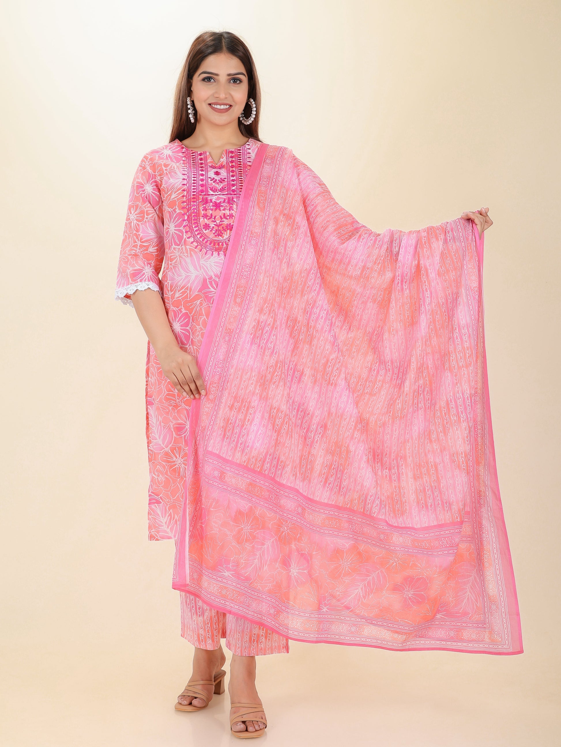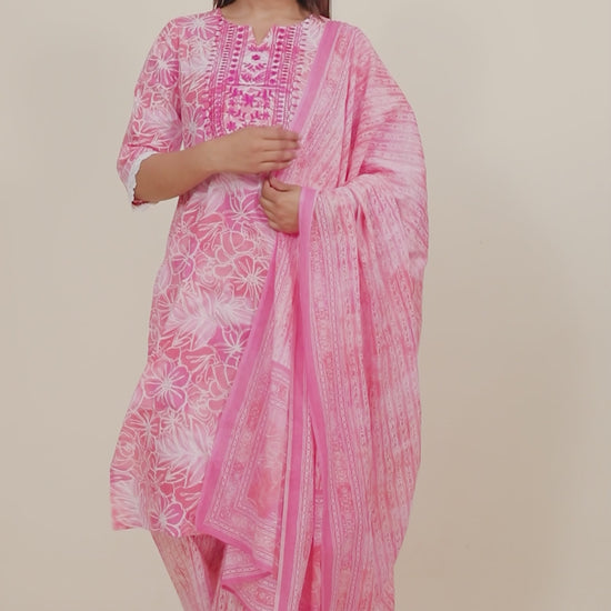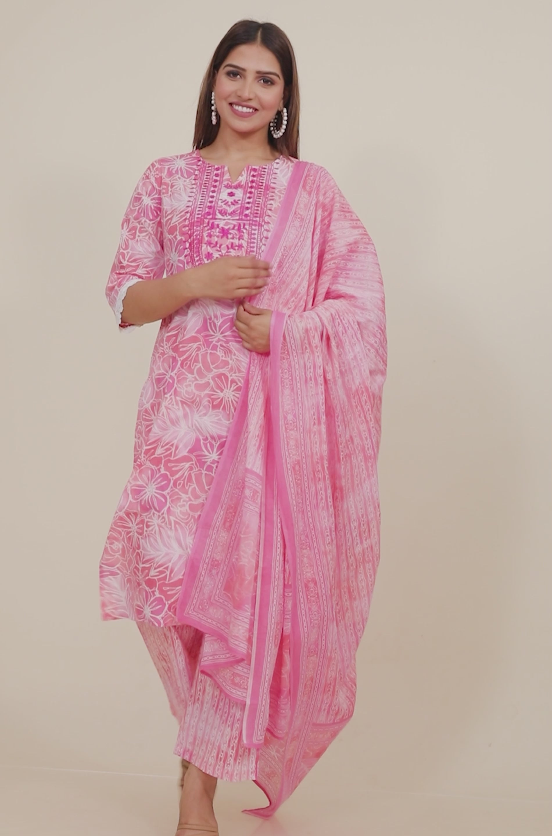 Embroidered Soft Cotton Floral Straight Pink Kurta
