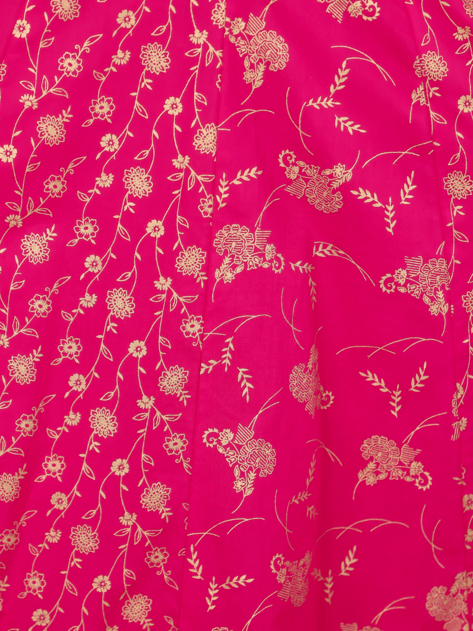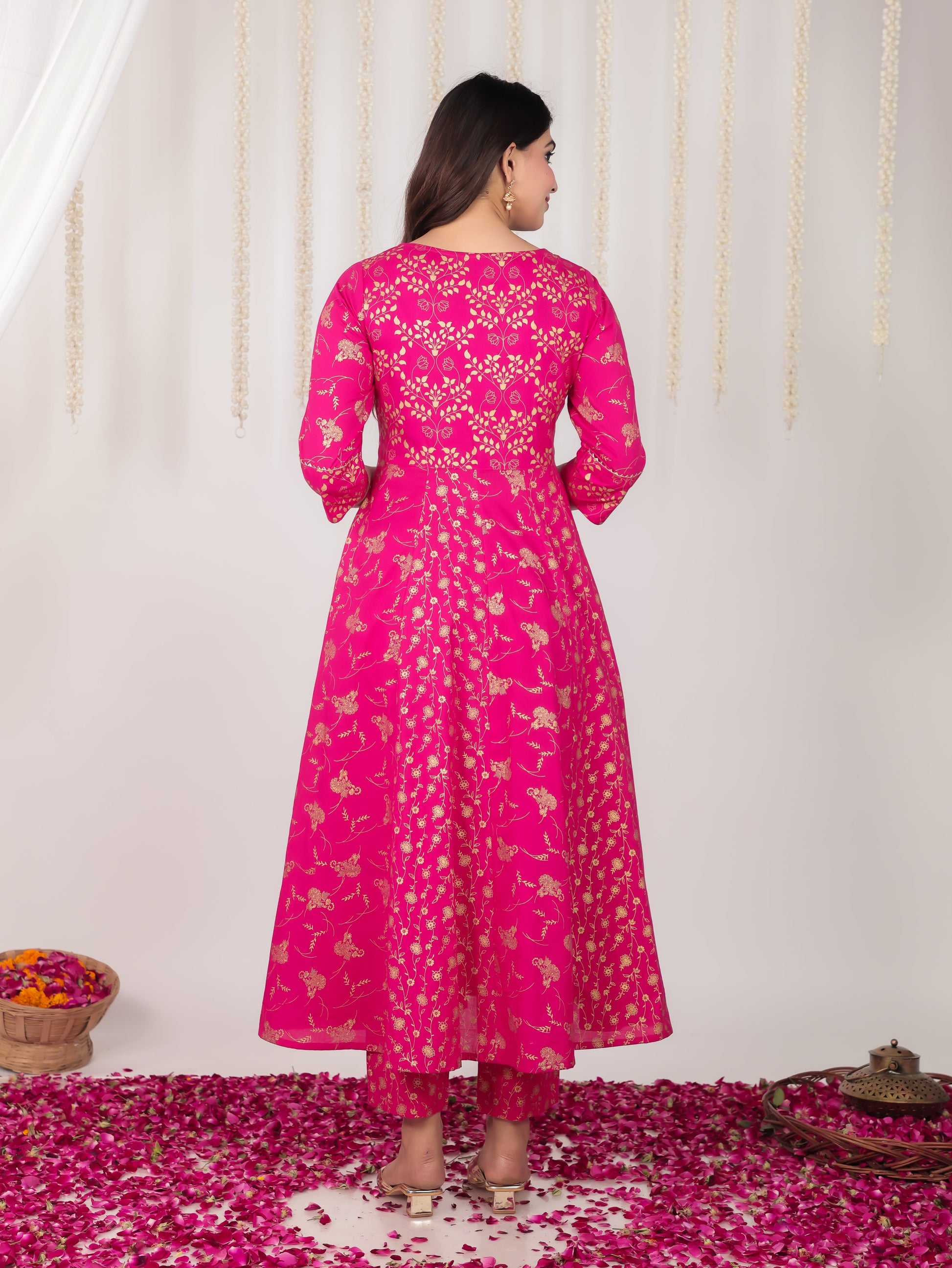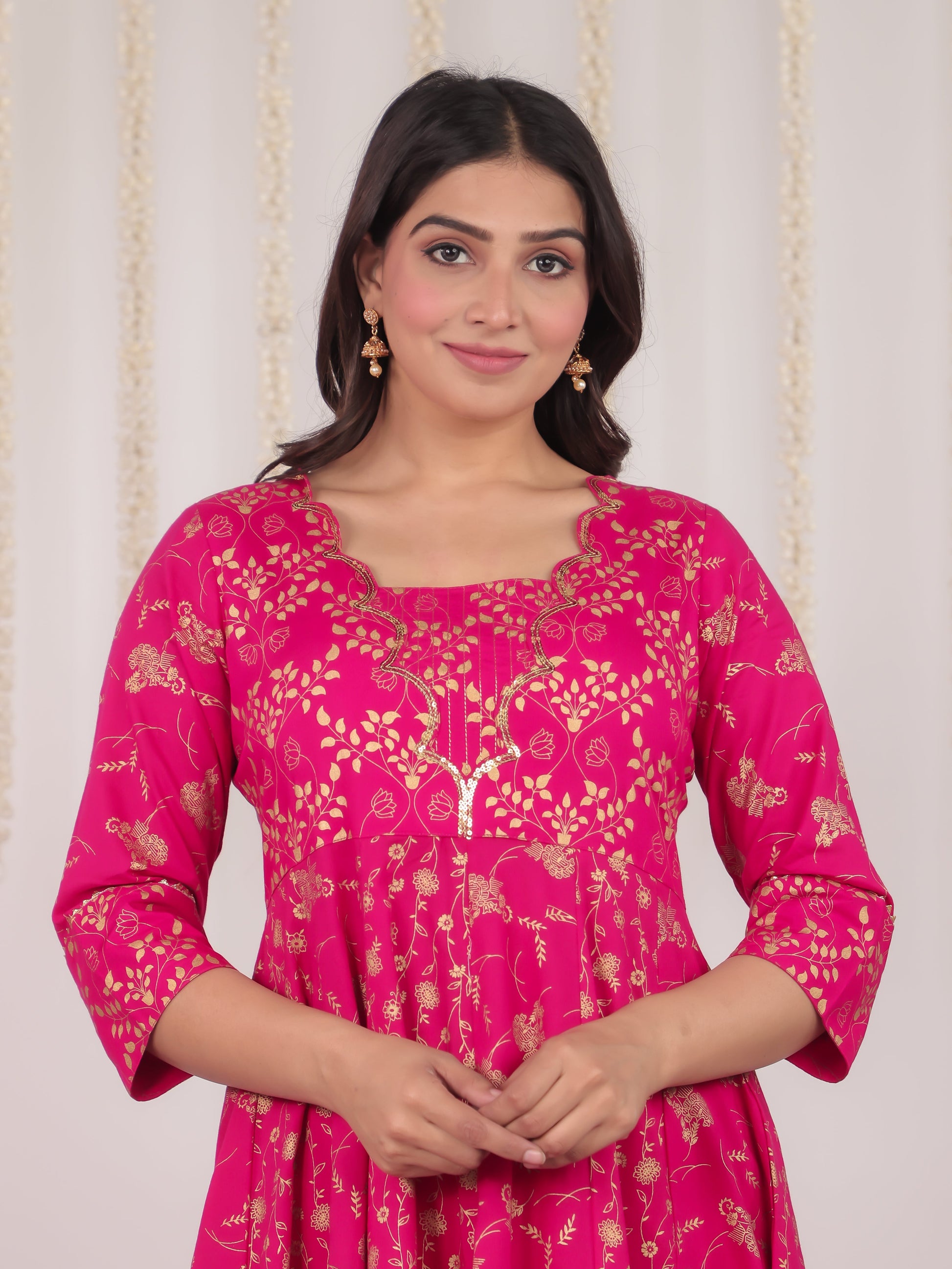 Embroidered Rayon Gold foil Flared Pink Kurta