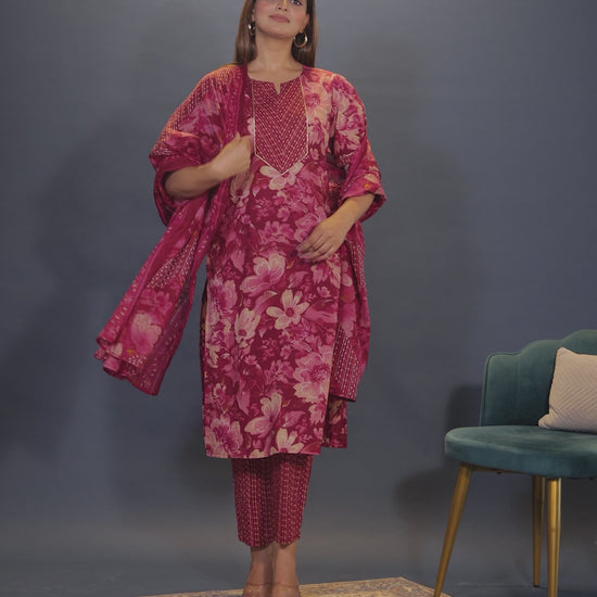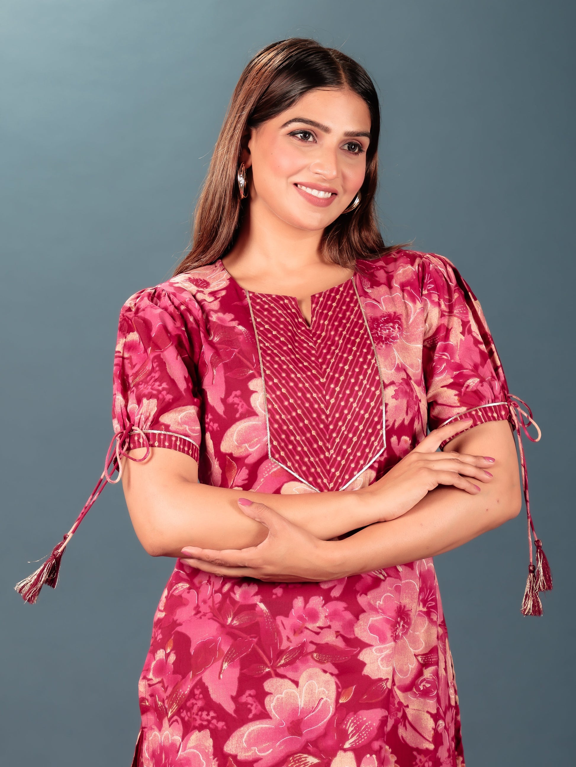 This Pink Soft Cotton kurta with a Straight flare is designed for comfort and style. Featuring a Round neckline, Elbow Length Sleeve sleeves, and a graceful Calf Length hemline, it’s perfect for festive wear or semi-formal gatherings. The Floral highlights add depth and texture, making it a standout piece. Accessorise with a contrasting dupatta and keep it pristine by following proper care instructions.