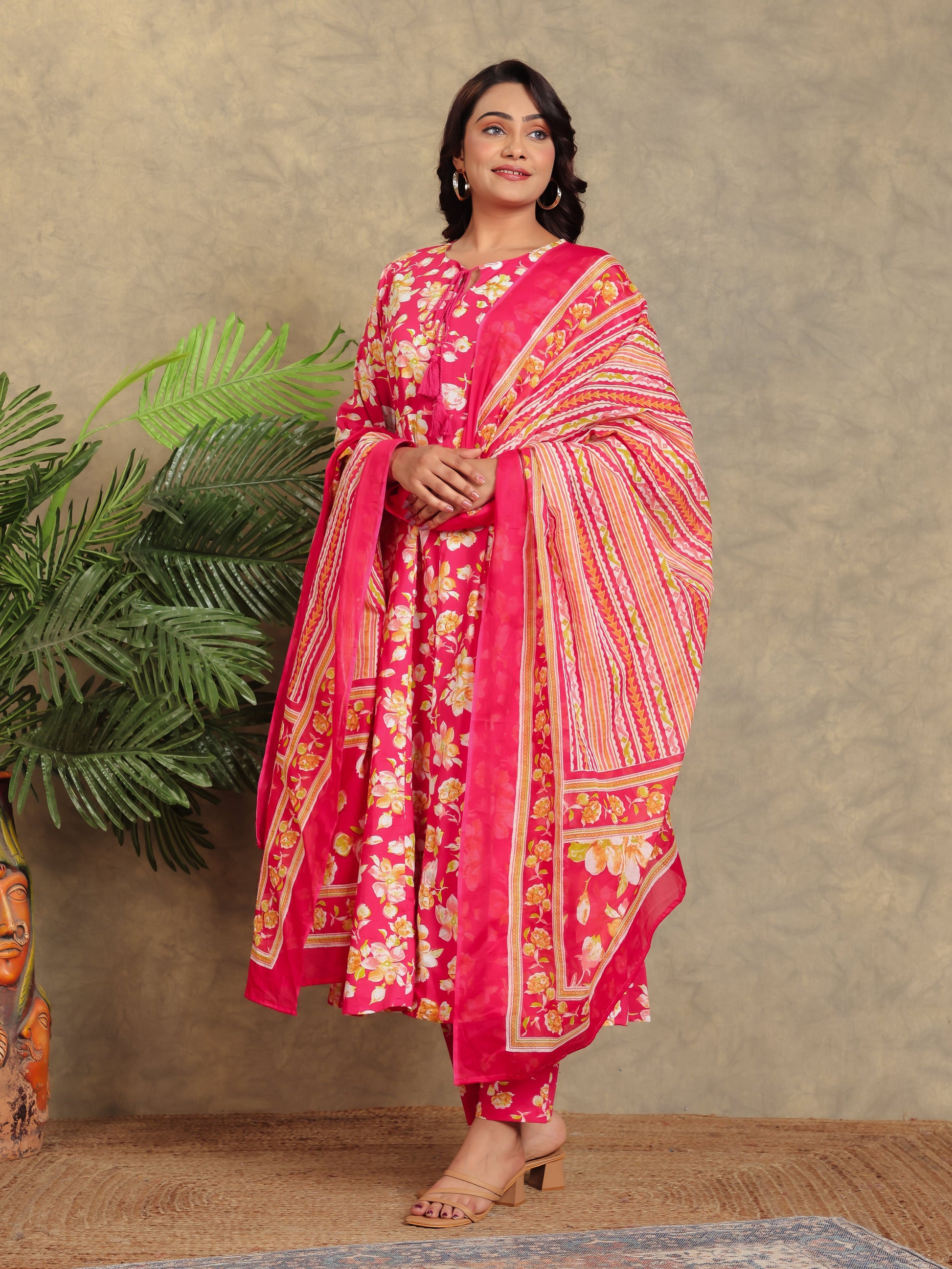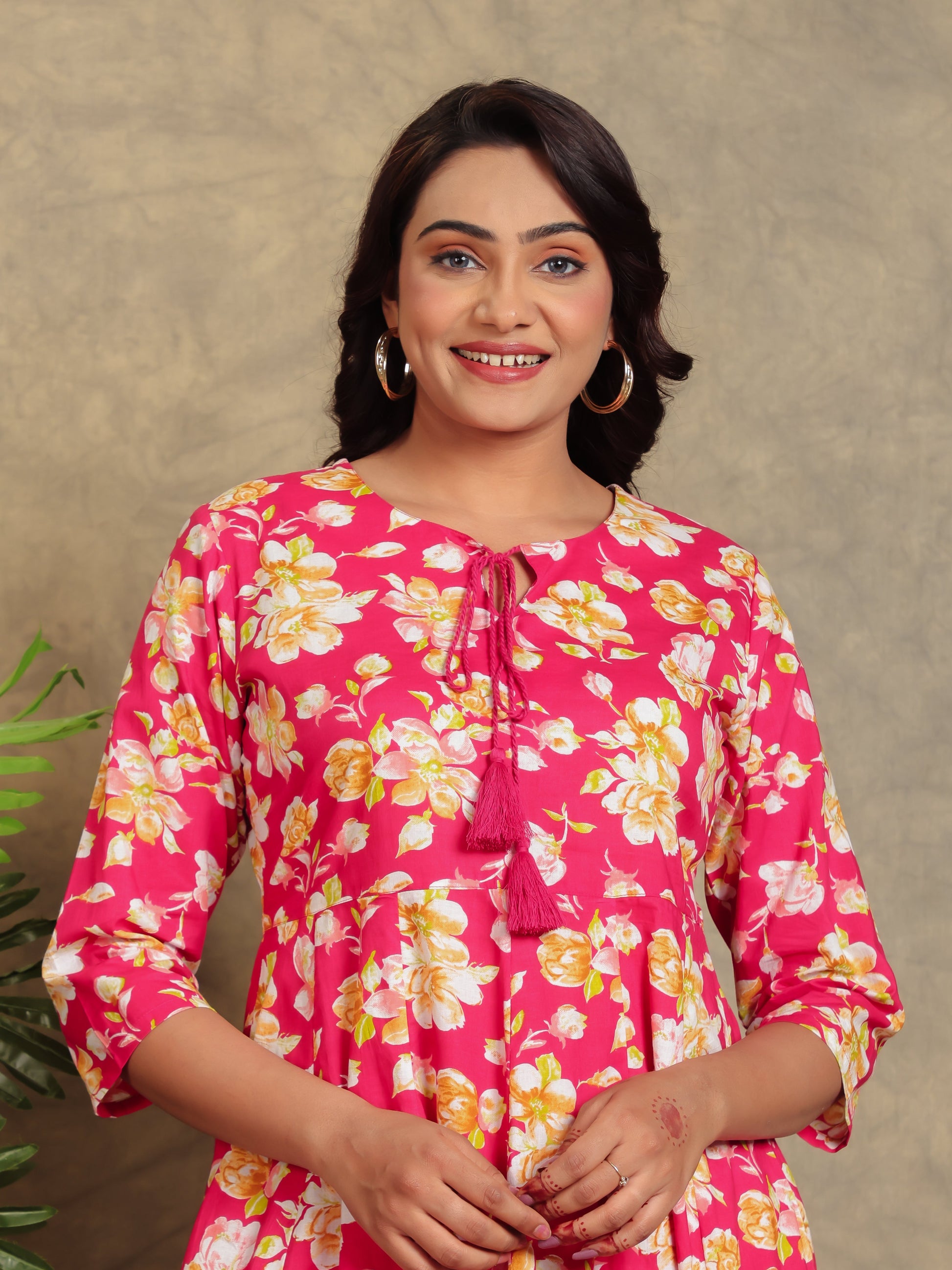 This Pink Flared kurta in soft Soft Cotton is a timeless pick for festive and casual wear. Designed with a Keyhole neckline and 3/4 Sleeve sleeves, its graceful Calf Length cut flatters all body types. The delicate Floral detailing adds a touch of sophistication. Pair it with statement earrings and juttis for a polished look. Maintain its pristine look by following proper care instructions.