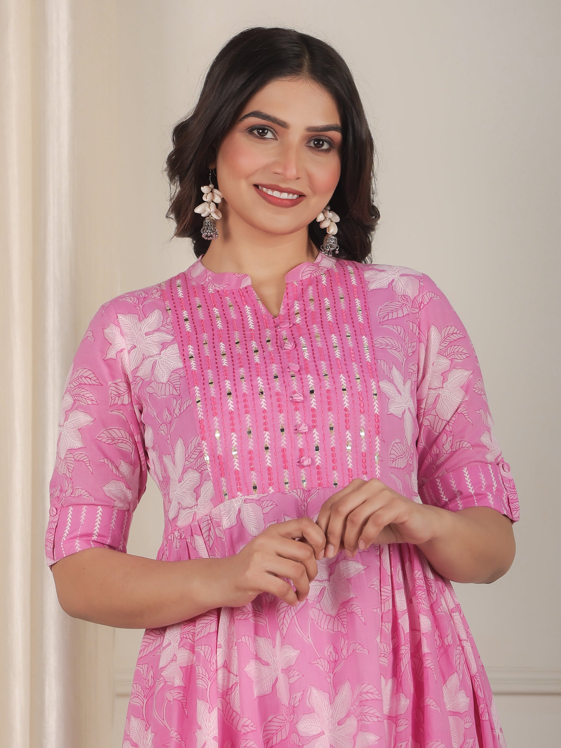 Crafted from breathable Soft Cotton, this Panelled kurta in Pink blends traditional design with everyday comfort. The Floral finish adds artisanal charm, while the Calf Length silhouette ensures effortless elegance. Style with palazzos or leggings for versatile looks, from workdays to weekend outings. Designed for easy care, this kurta stays beautiful with simple care instructions.