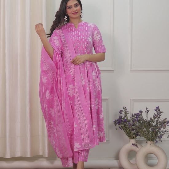 Embroidered Soft Cotton Floral Panelled Pink Kurta