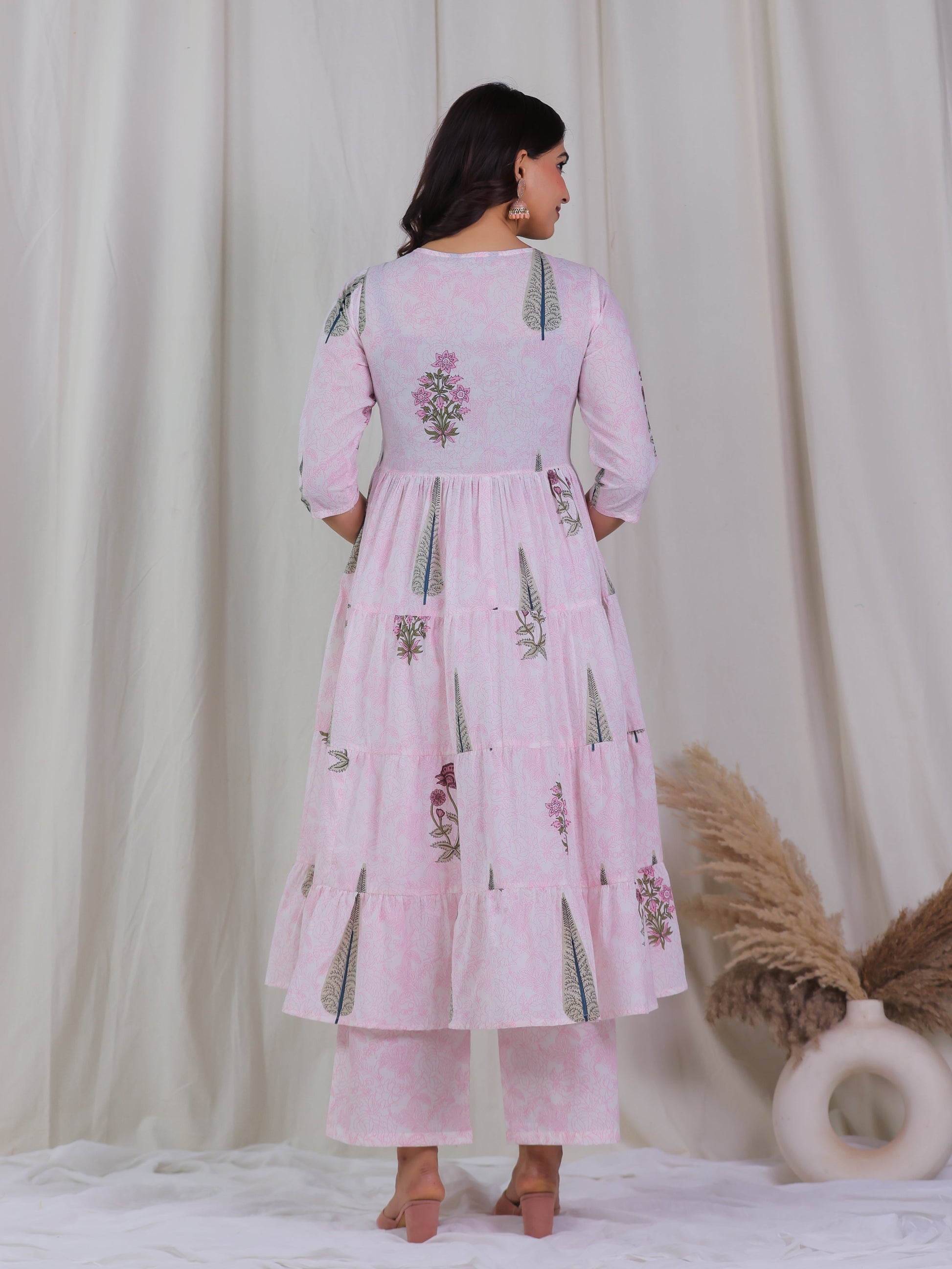 Embroidered Soft Cotton Floral Anarkali Pink Kurta