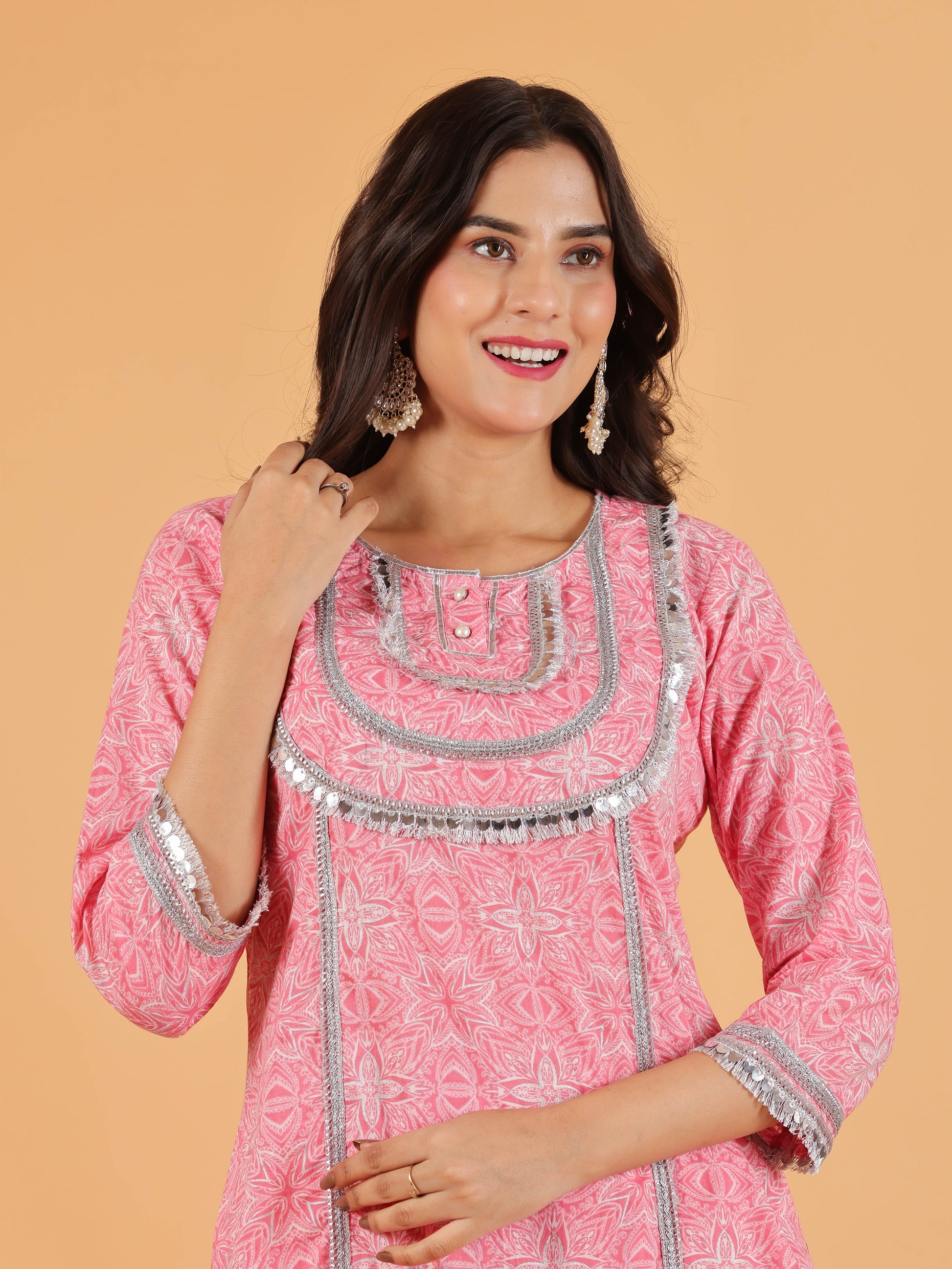 This Pink Straight kurta in soft Soft Cotton is a timeless pick for festive and casual wear. Designed with a Round neckline and 3/4 Sleeve sleeves, its graceful Calf Length cut flatters all body types. The delicate Geometric detailing adds a touch of sophistication. Pair it with statement earrings and juttis for a polished look. Maintain its pristine look by following proper care instructions.