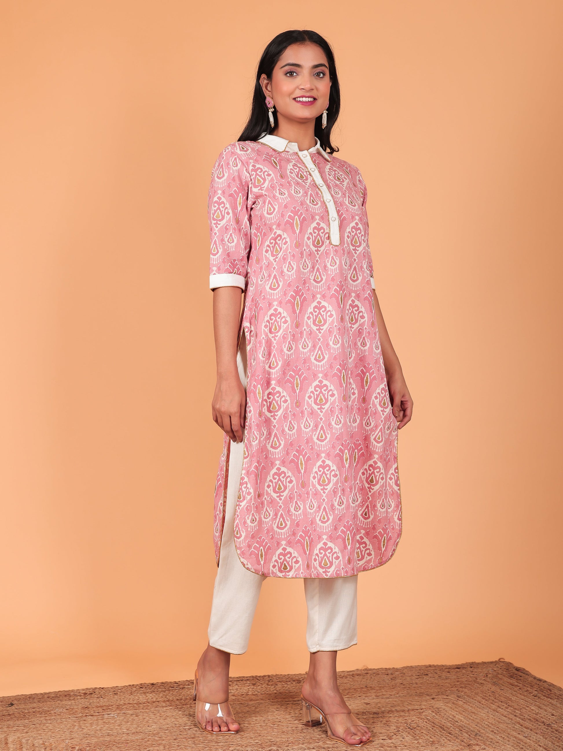 Elevate your ethnic wardrobe with this Linen Cotton kurta in a stunning Pink hue. Featuring an elegant Pathani fit and striking Ikat accents, it’s perfect for festive celebrations or family gatherings. The Collared neckline and Elbow Length Sleeve provide all-day comfort. Team with gold-toned accessories for an effortlessly chic vibe. Maintain its charm by following proper care instructions.