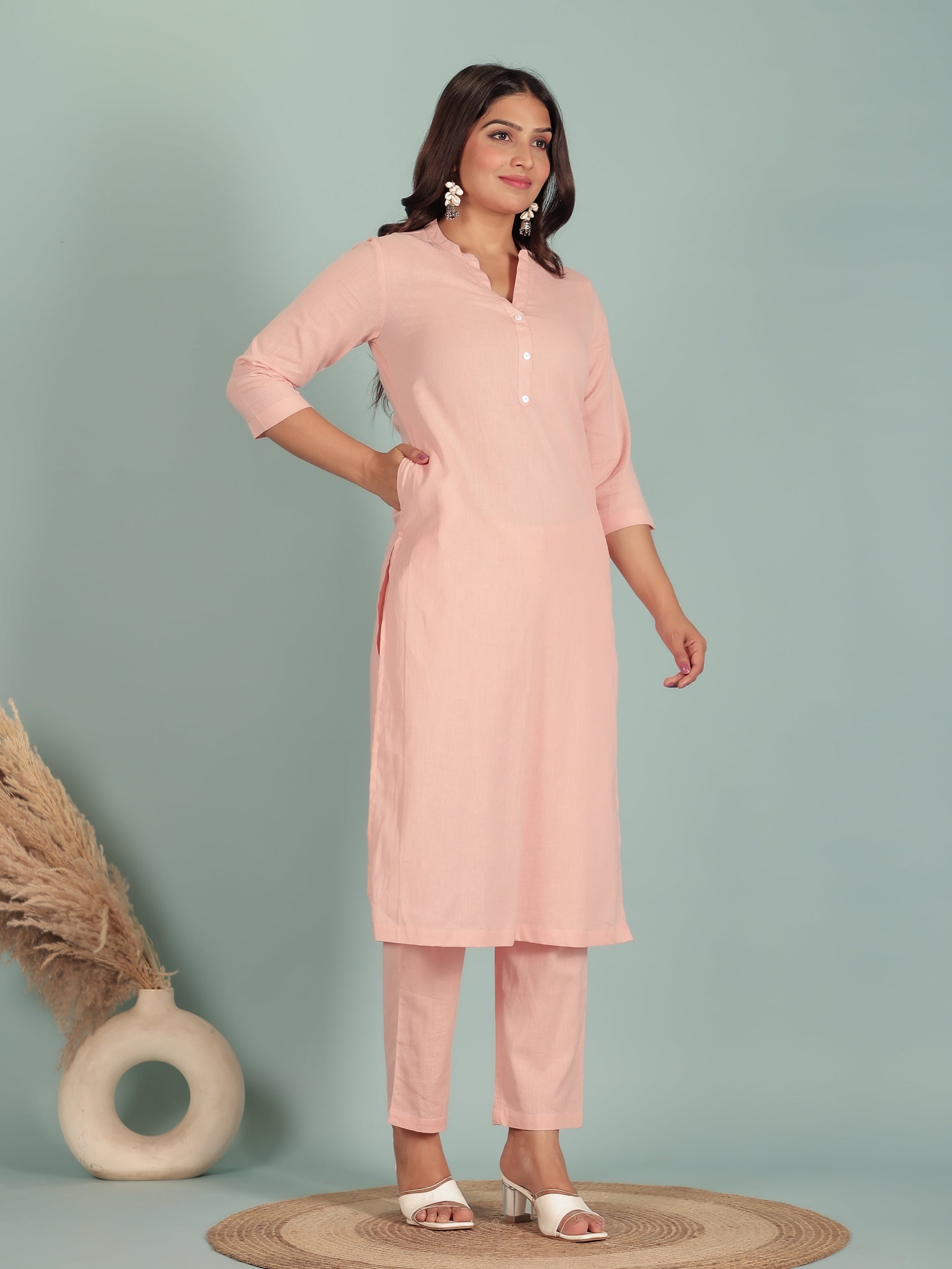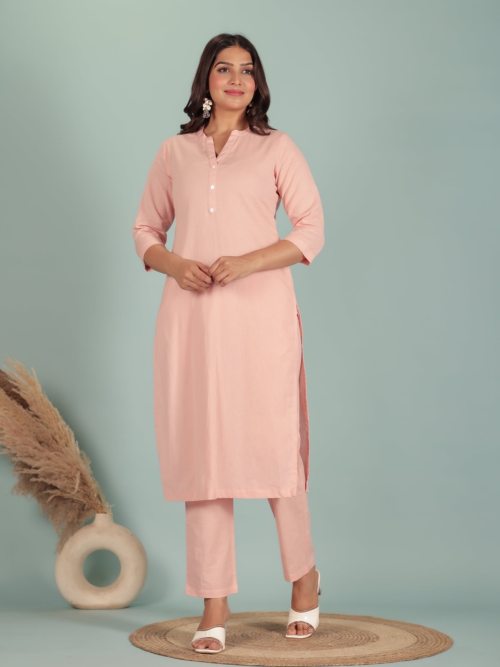 Crafted from breathable Linen Cotton, this Straight kurta in Peach blends traditional design with everyday comfort. The Solid finish adds artisanal charm, while the Calf Length silhouette ensures effortless elegance. Style with palazzos or leggings for versatile looks, from workdays to weekend outings. Designed for easy care, this kurta stays beautiful with simple care instructions.