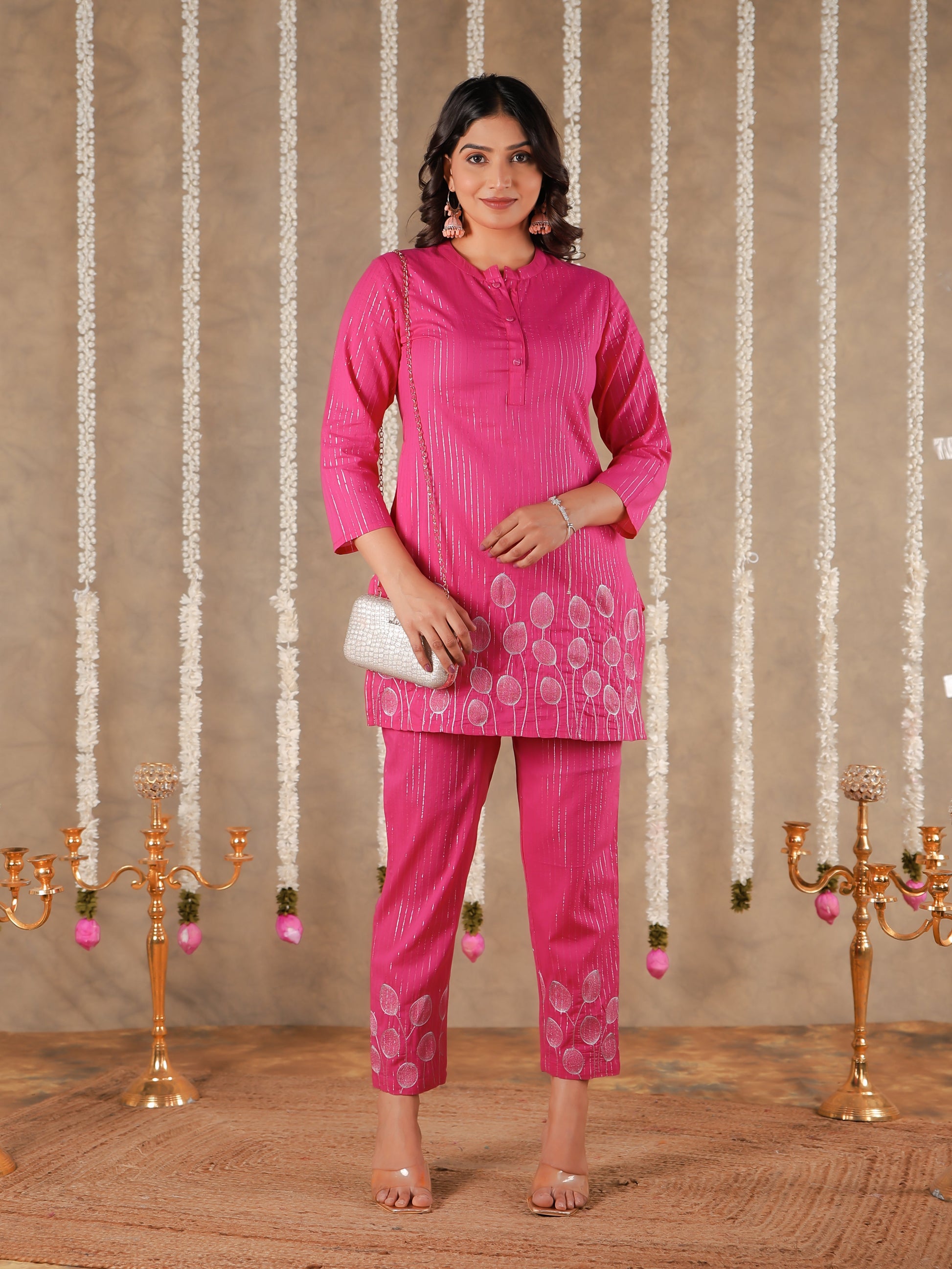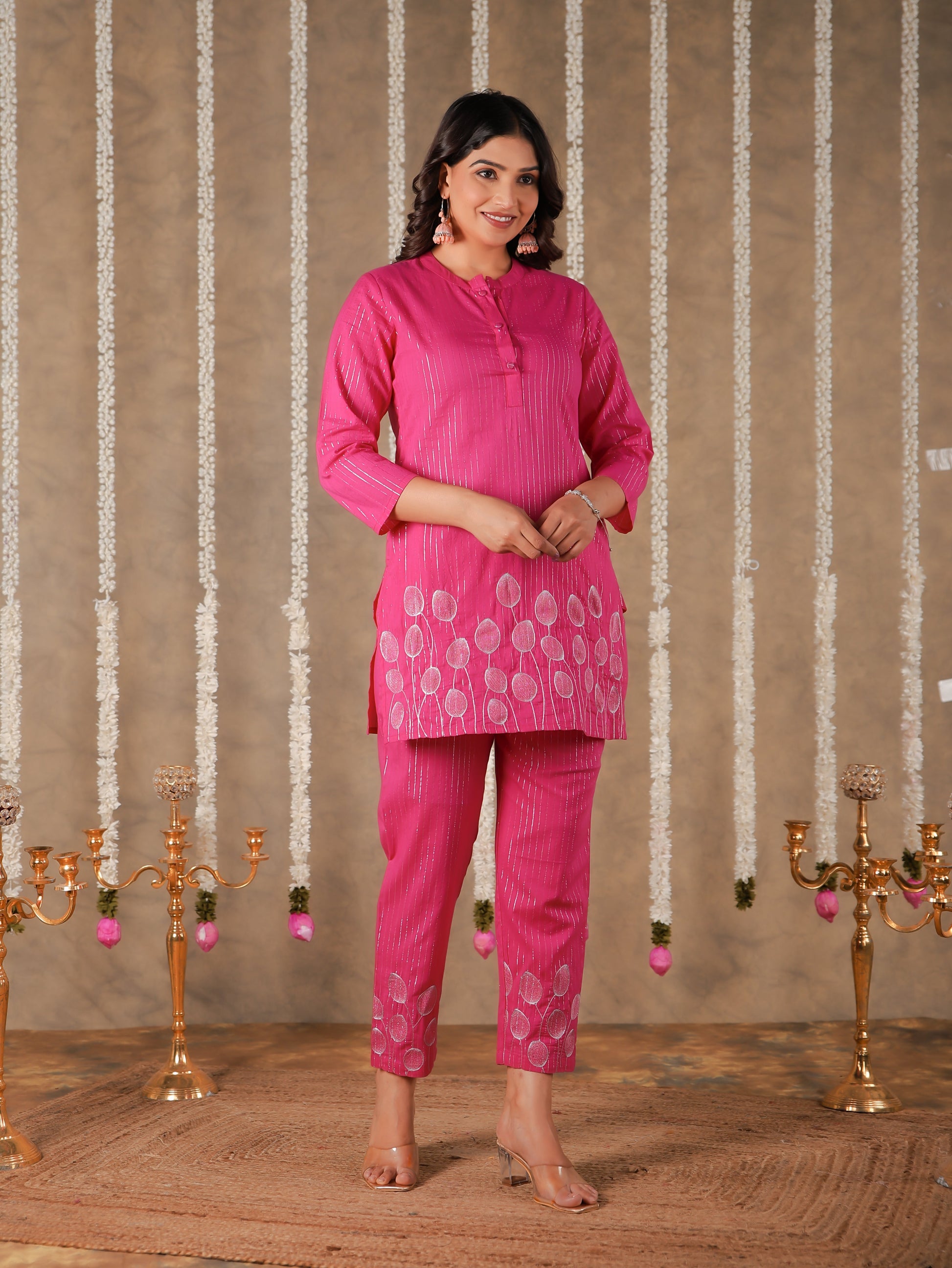 Elevate your ethnic wardrobe with this Lurex Cotton kurta in a stunning Pink hue. Featuring an elegant Straight fit and striking Solid accents, it’s perfect for festive celebrations or family gatherings. The Collared neckline and 3/4 Sleeve provide all-day comfort. Team with gold-toned accessories for an effortlessly chic vibe. Maintain its charm by following proper care instructions.