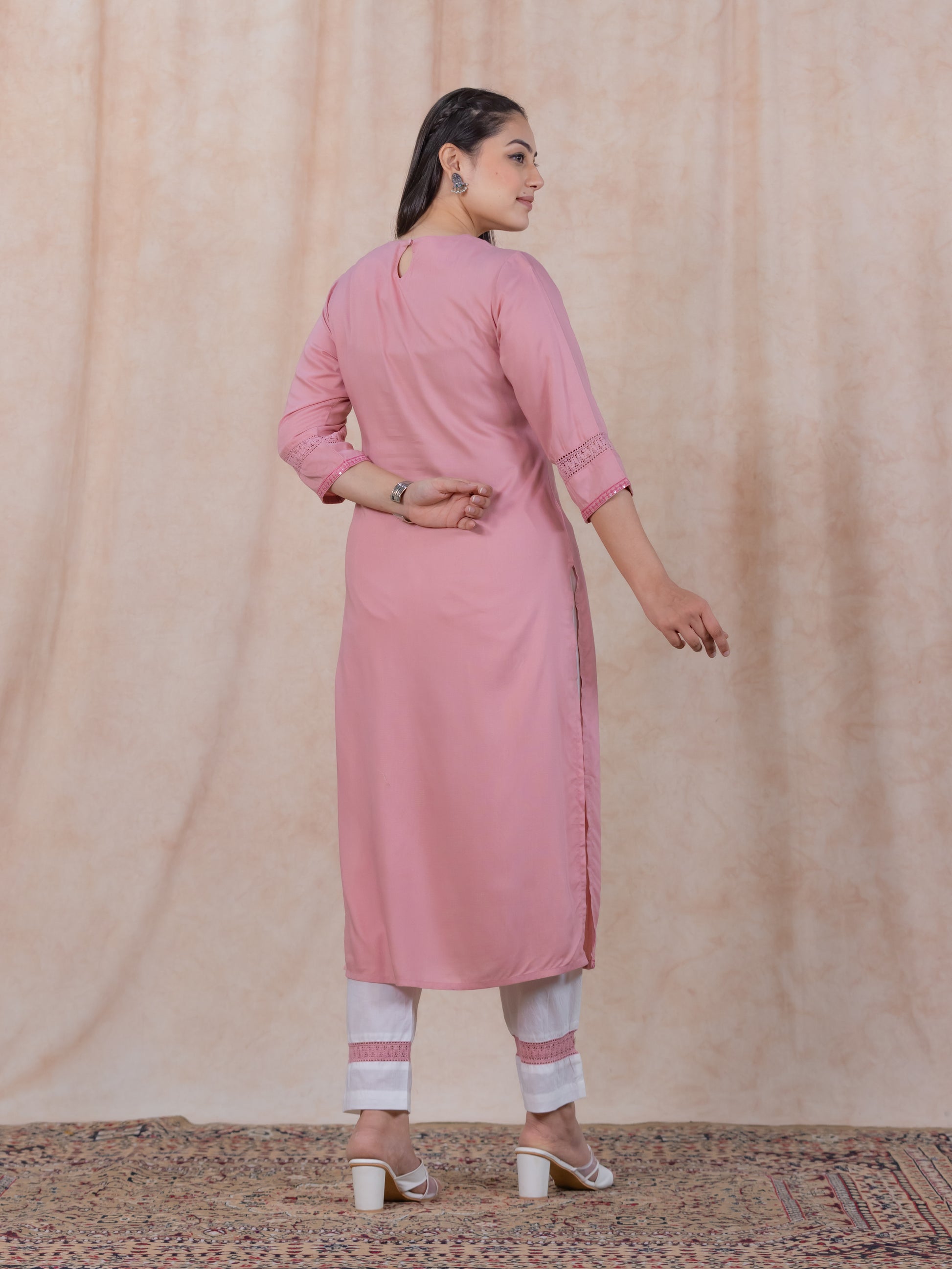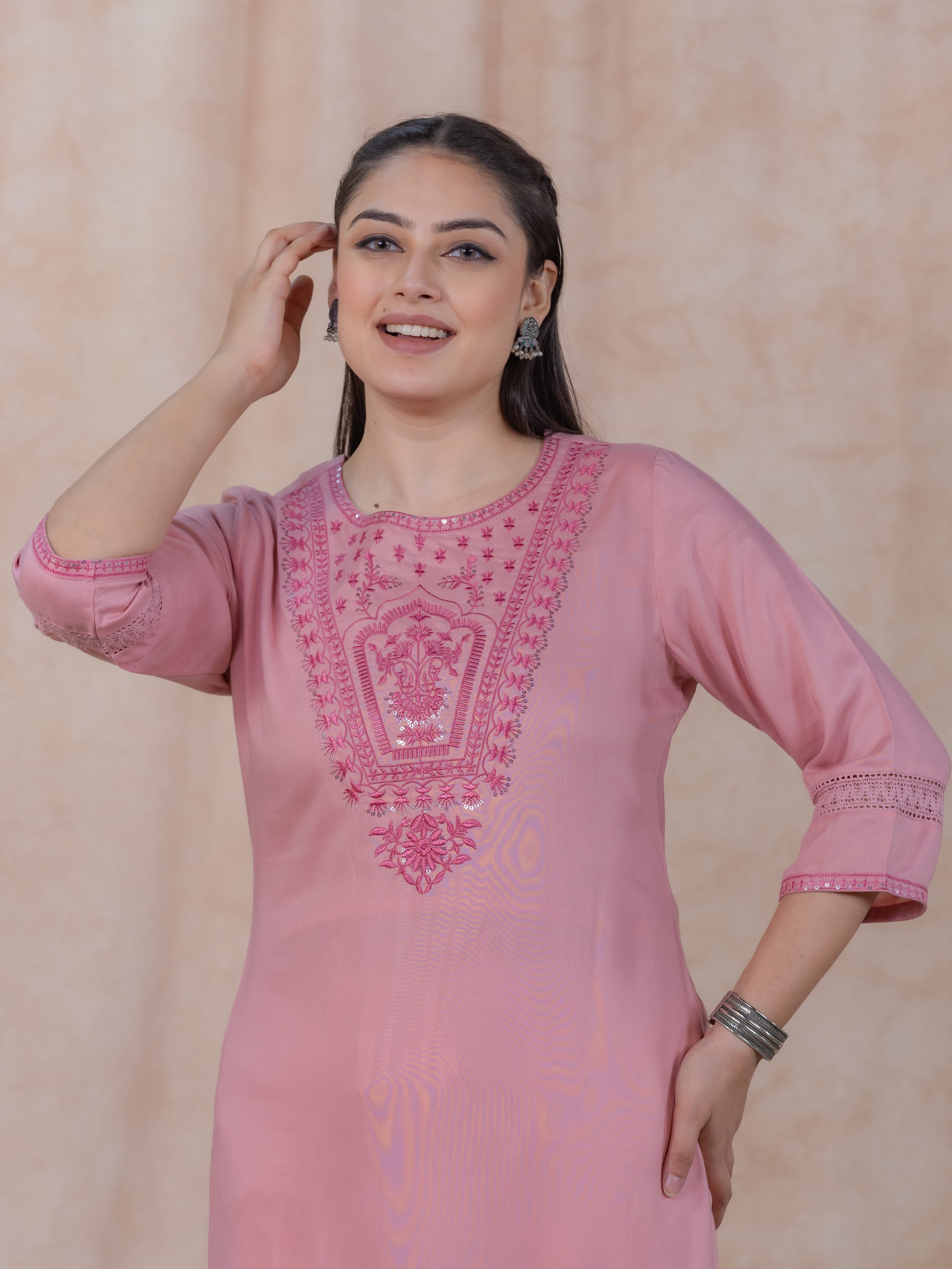 Elevate your ethnic wardrobe with this Viscose kurta in a stunning Pink hue. Featuring an elegant Straight fit and striking Solid accents, it’s perfect for festive celebrations or family gatherings. The Keyhole neckline and 3/4 Sleeve provide all-day comfort. Team with gold-toned accessories for an effortlessly chic vibe. Maintain its charm by following proper care instructions.