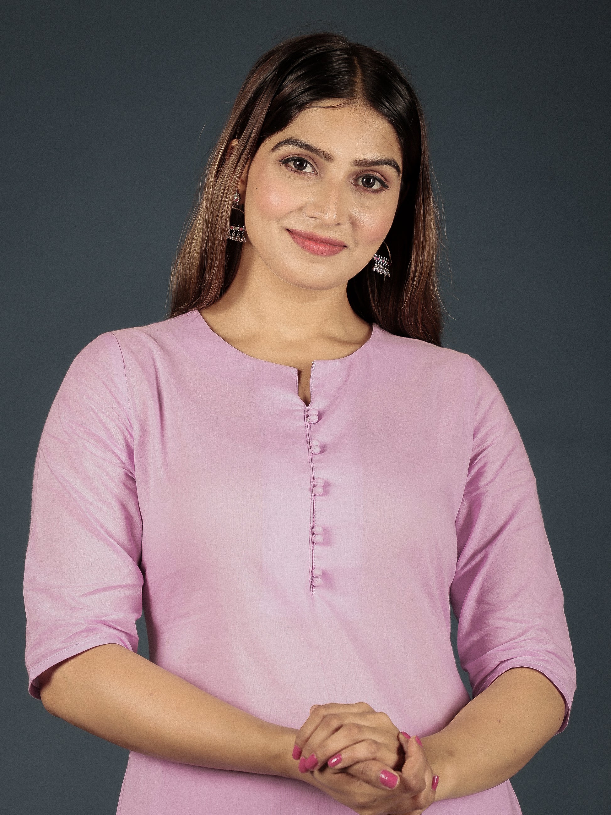 This Mauve A-line kurta in soft Soft Cotton is a timeless pick for festive and casual wear. Designed with a Round neckline and 3/4 Sleeve sleeves, its graceful Calf Length cut flatters all body types. The delicate Solid detailing adds a touch of sophistication. Pair it with statement earrings and juttis for a polished look. Maintain its pristine look by following proper care instructions.
