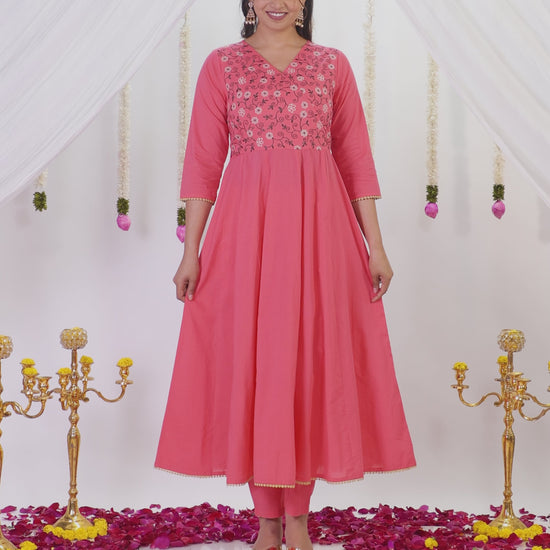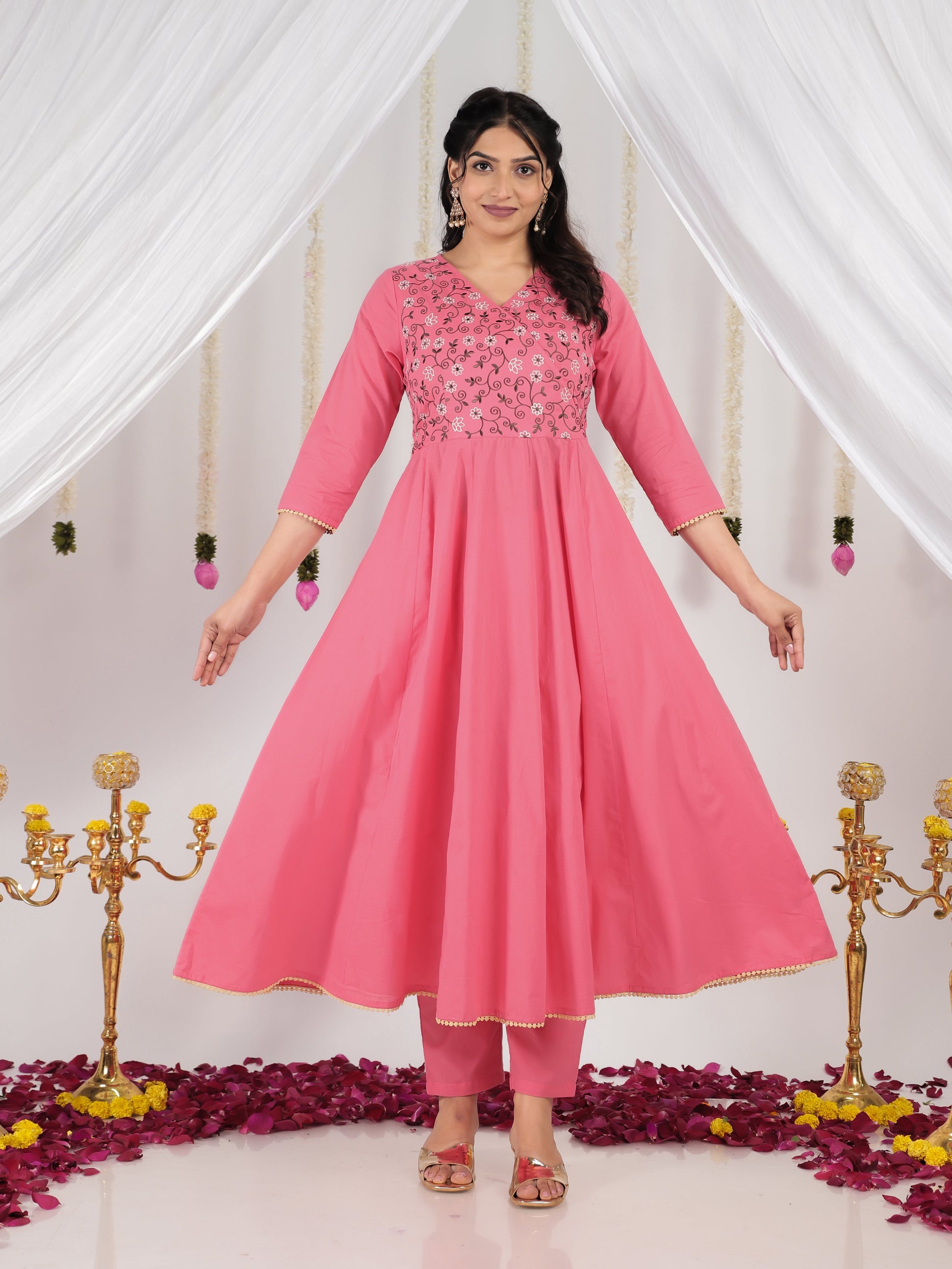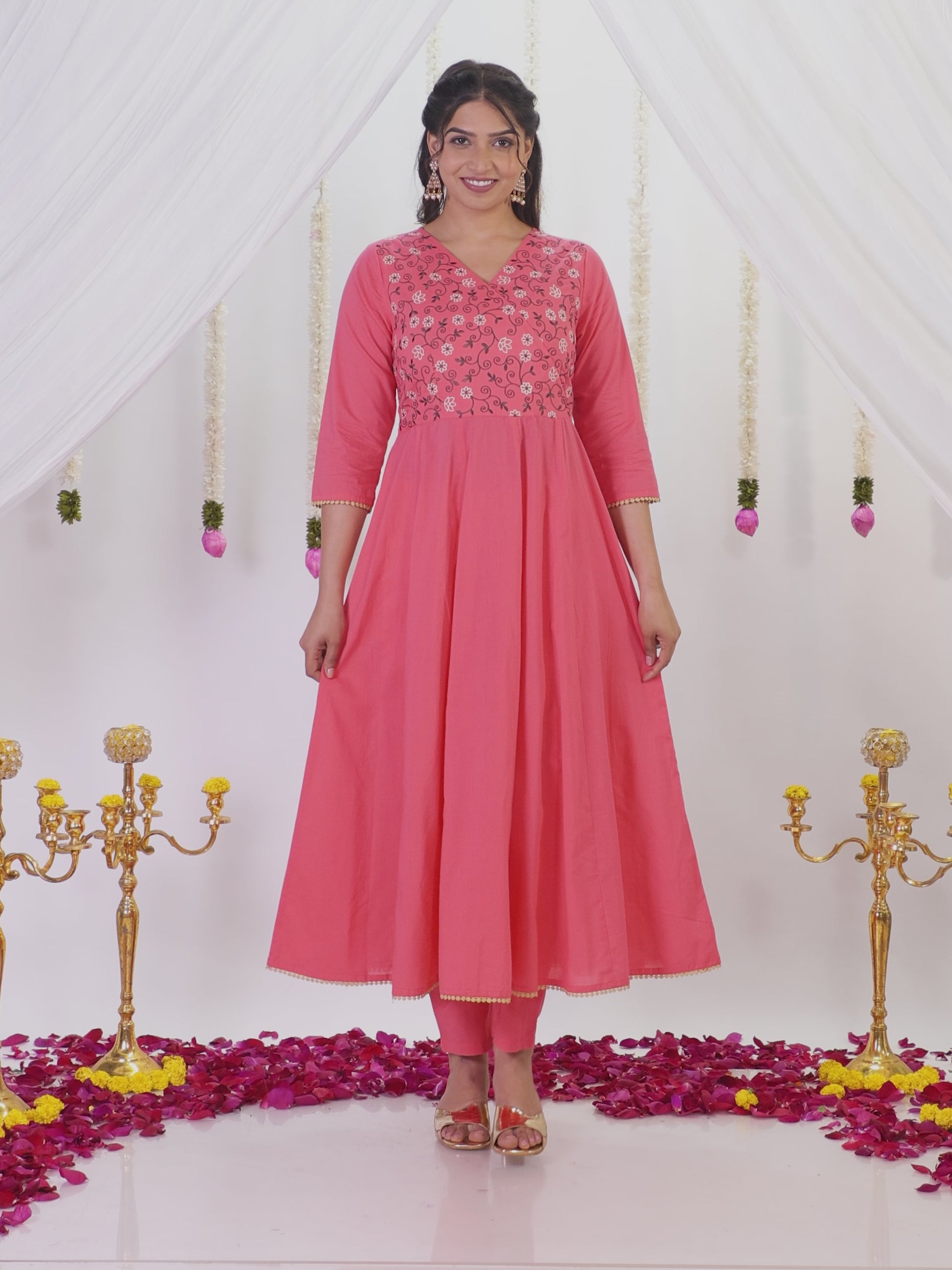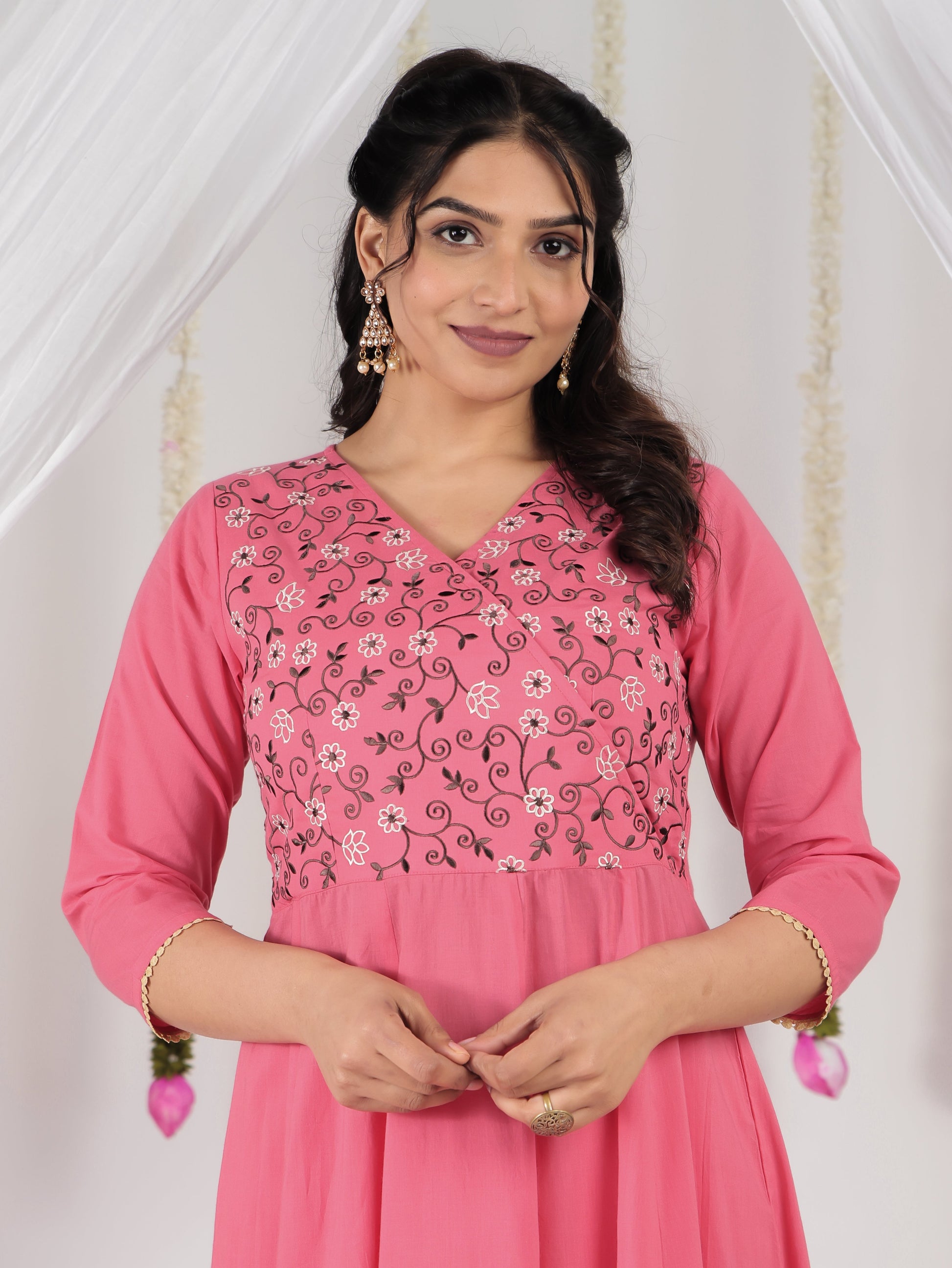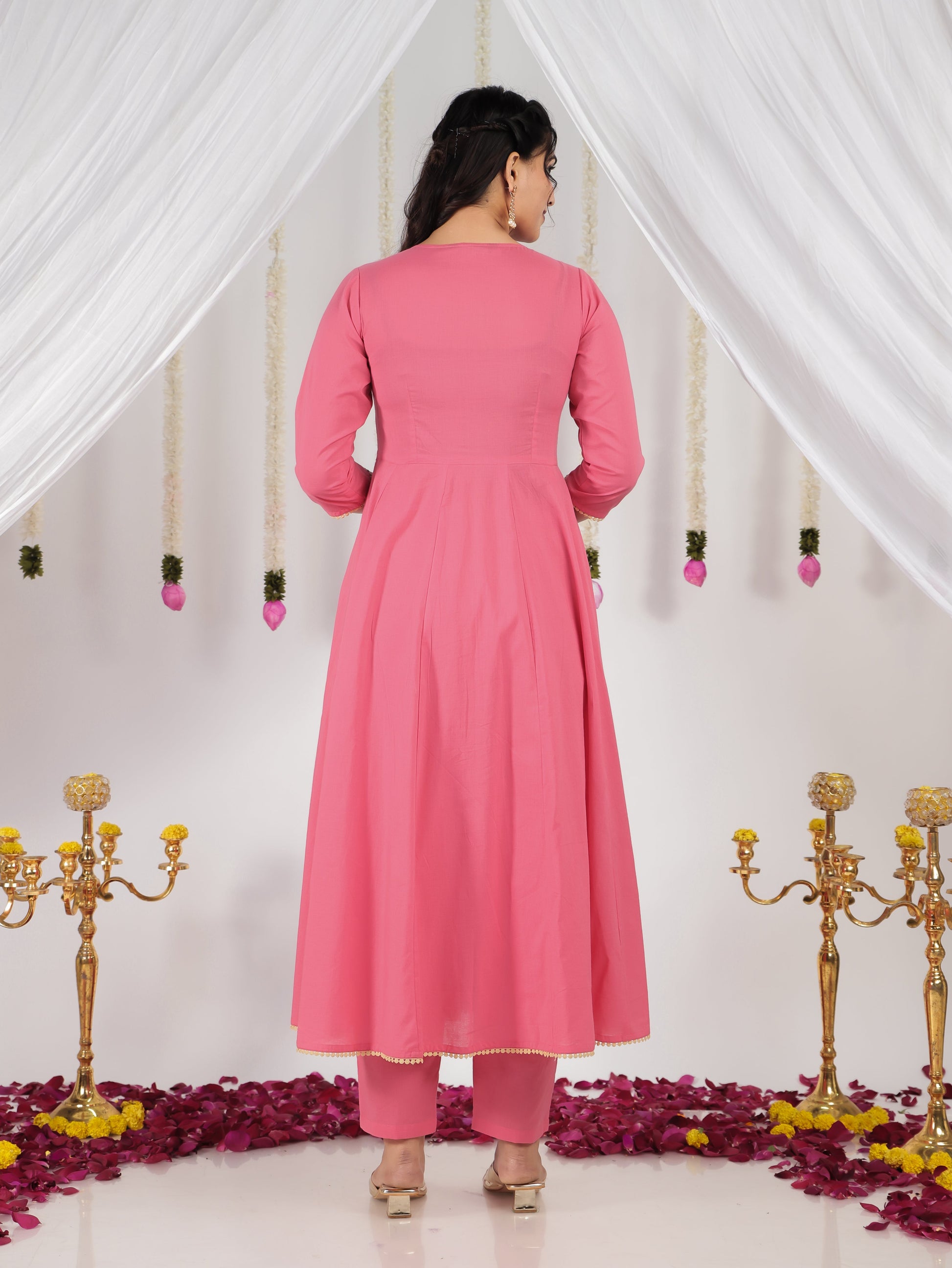 Embroidered Soft Cotton Solid Angrakha Pink Kurta