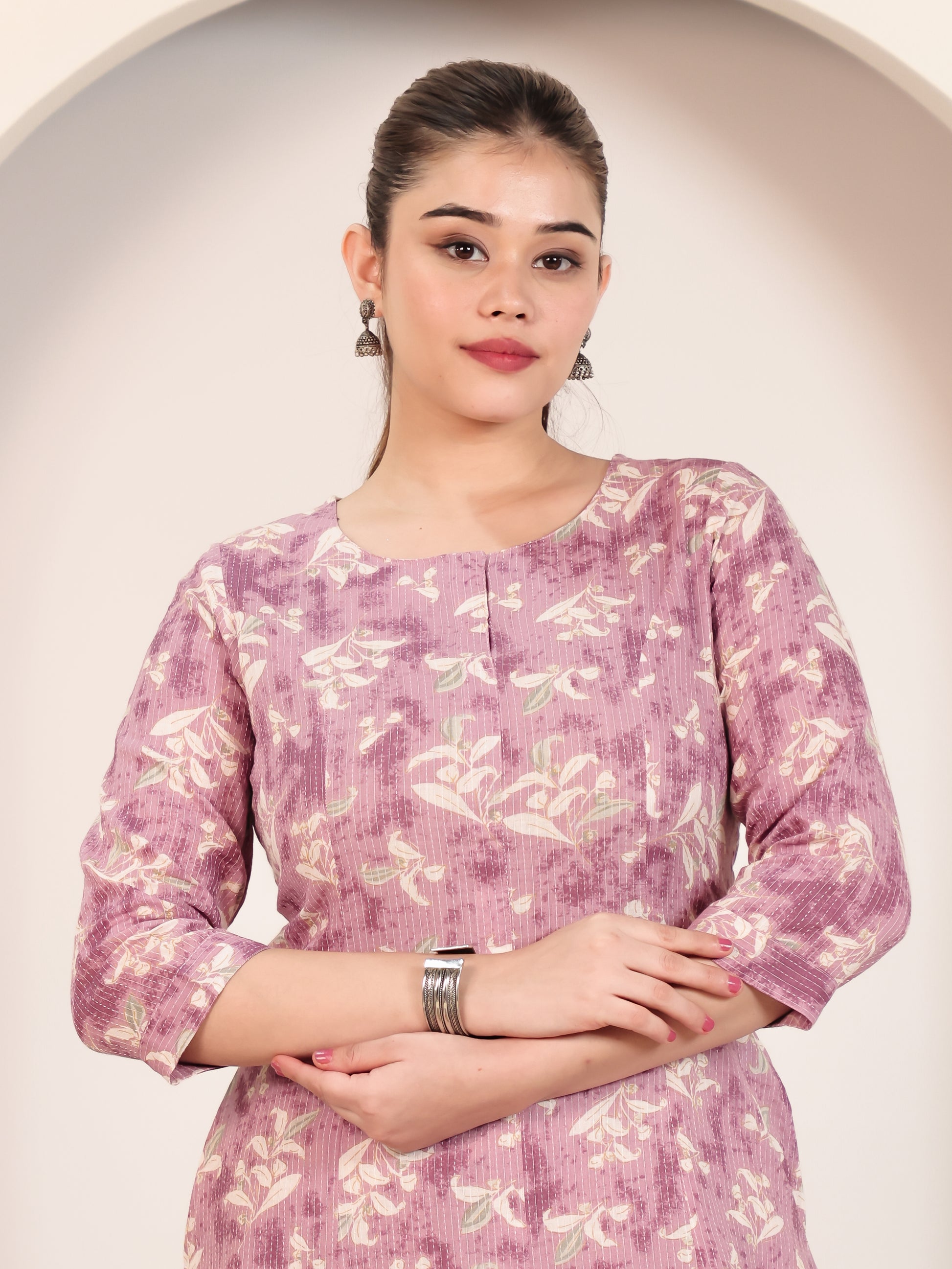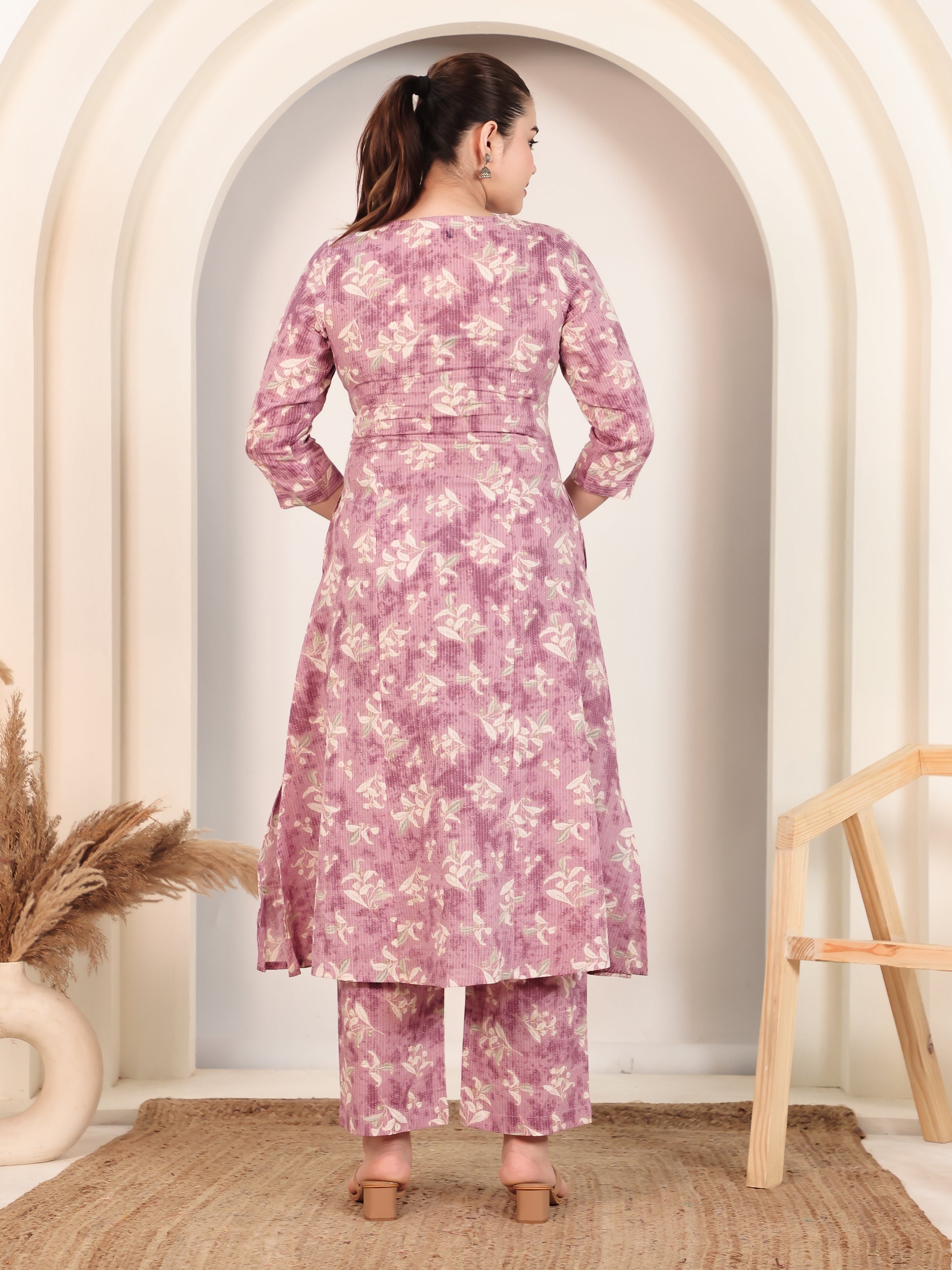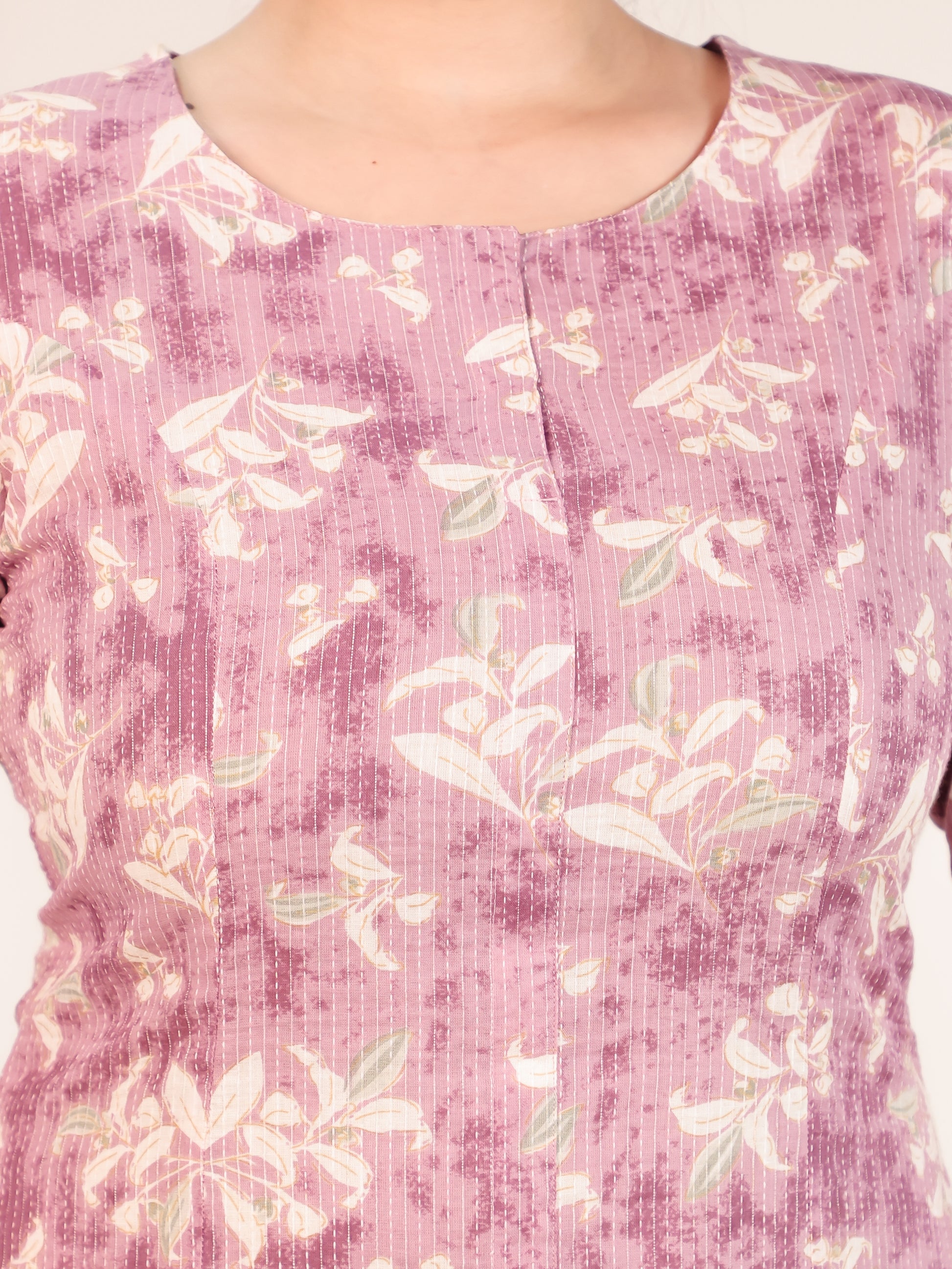 This Mauve A-line kurta in soft Kantha Cotton is a timeless pick for festive and casual wear. Designed with a Round neckline and 3/4 Sleeve sleeves, its graceful Calf Length cut flatters all body types. The delicate Floral detailing adds a touch of sophistication. Pair it with statement earrings and juttis for a polished look. Maintain its pristine look by following proper care instructions.