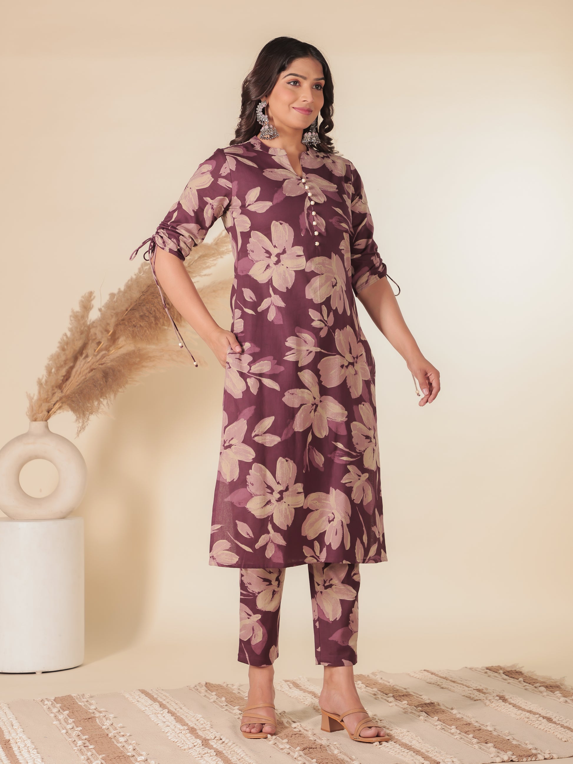 Elevate your ethnic wardrobe with this Linen Cotton kurta in a stunning Purple hue. Featuring an elegant Straight fit and striking Floral accents, it’s perfect for festive celebrations or family gatherings. The Mandarin/Chinese neckline and 3/4 Sleeve provide all-day comfort. Team with gold-toned accessories for an effortlessly chic vibe. Maintain its charm by following proper care instructions.