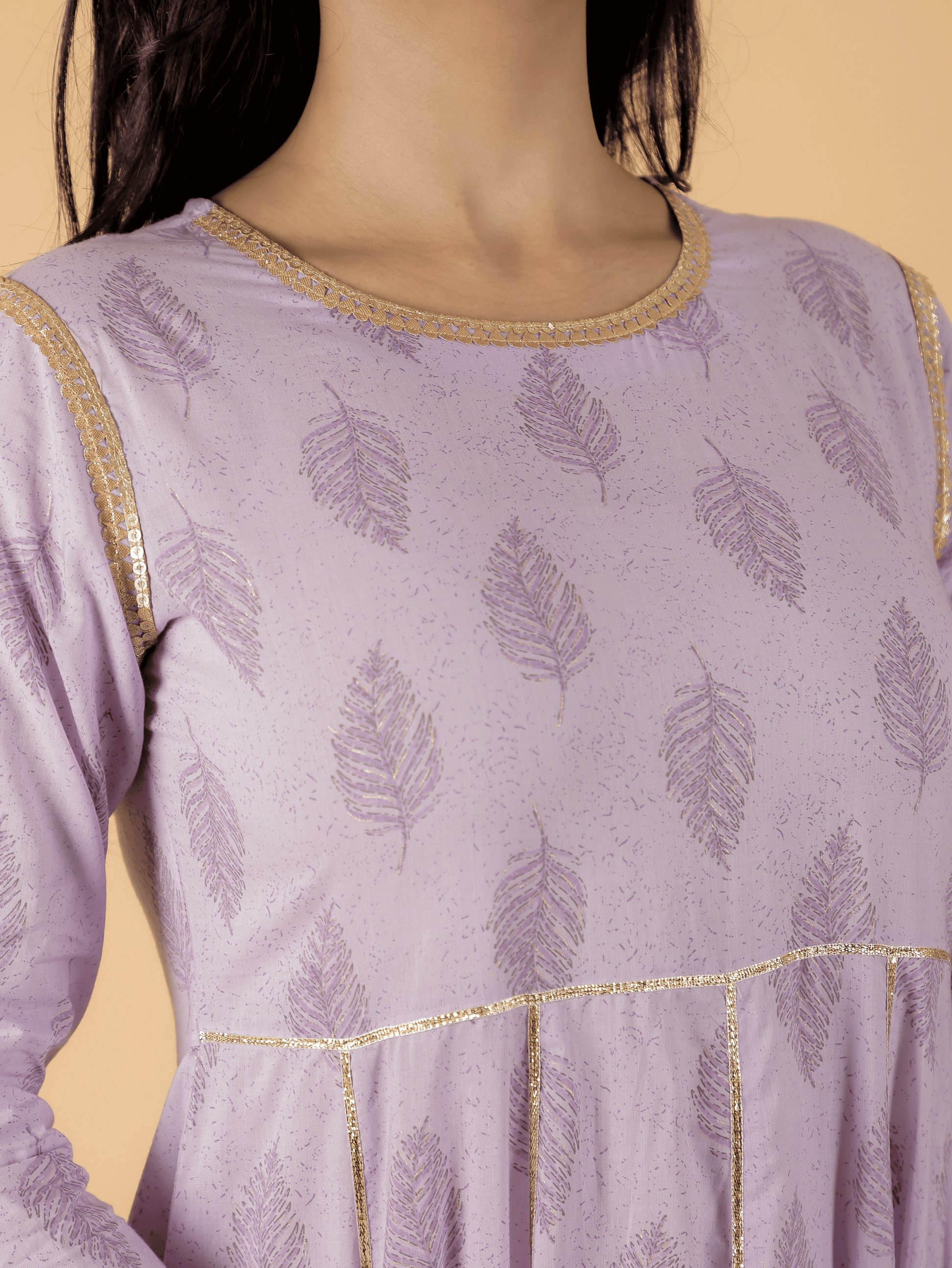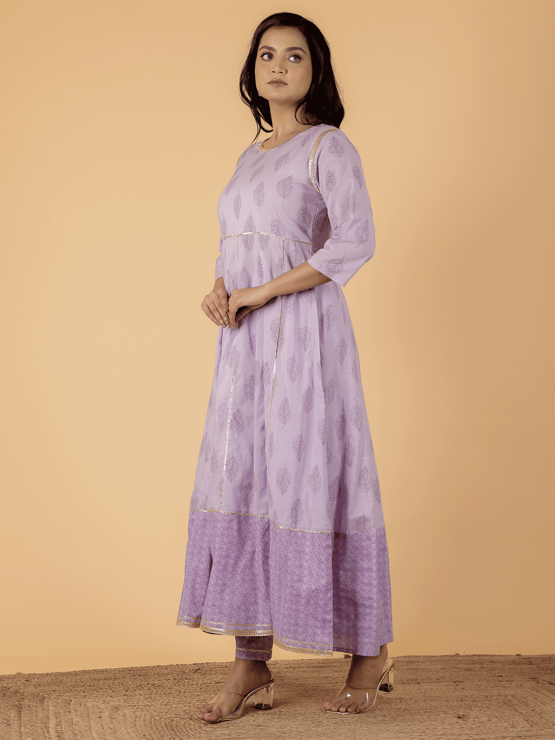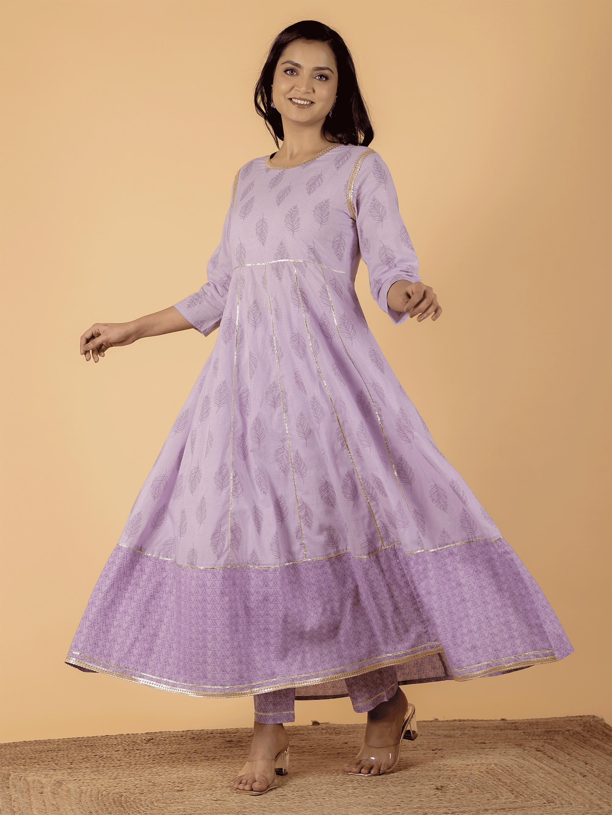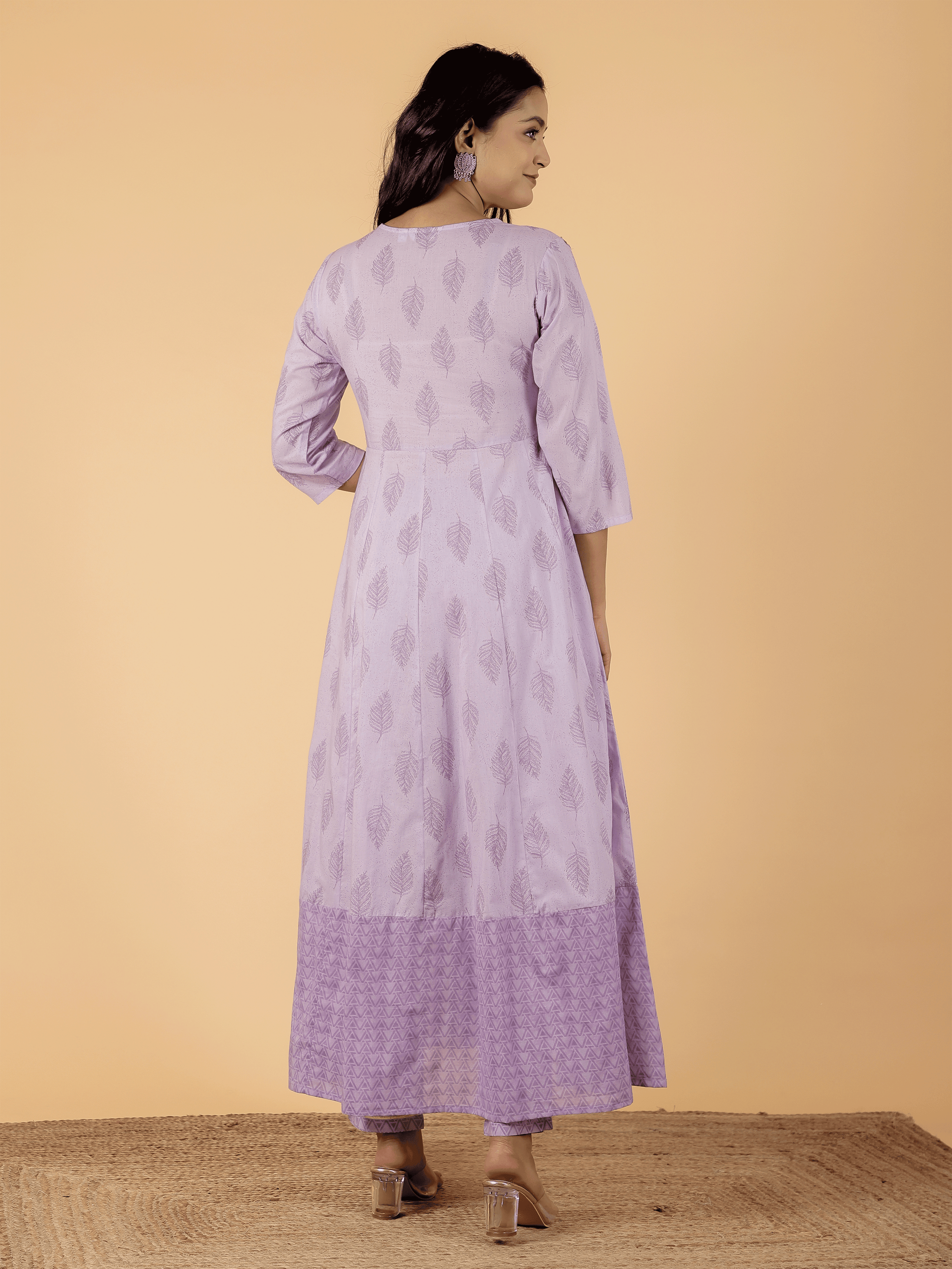 Elevate your ethnic wardrobe with this Soft Cotton kurta in a stunning Purple hue. Featuring an elegant Anarkali fit and striking Foliage accents, it’s perfect for festive celebrations or family gatherings. The Round neckline and 3/4 Sleeve provide all-day comfort. Team with gold-toned accessories for an effortlessly chic vibe. Maintain its charm by following proper care instructions.