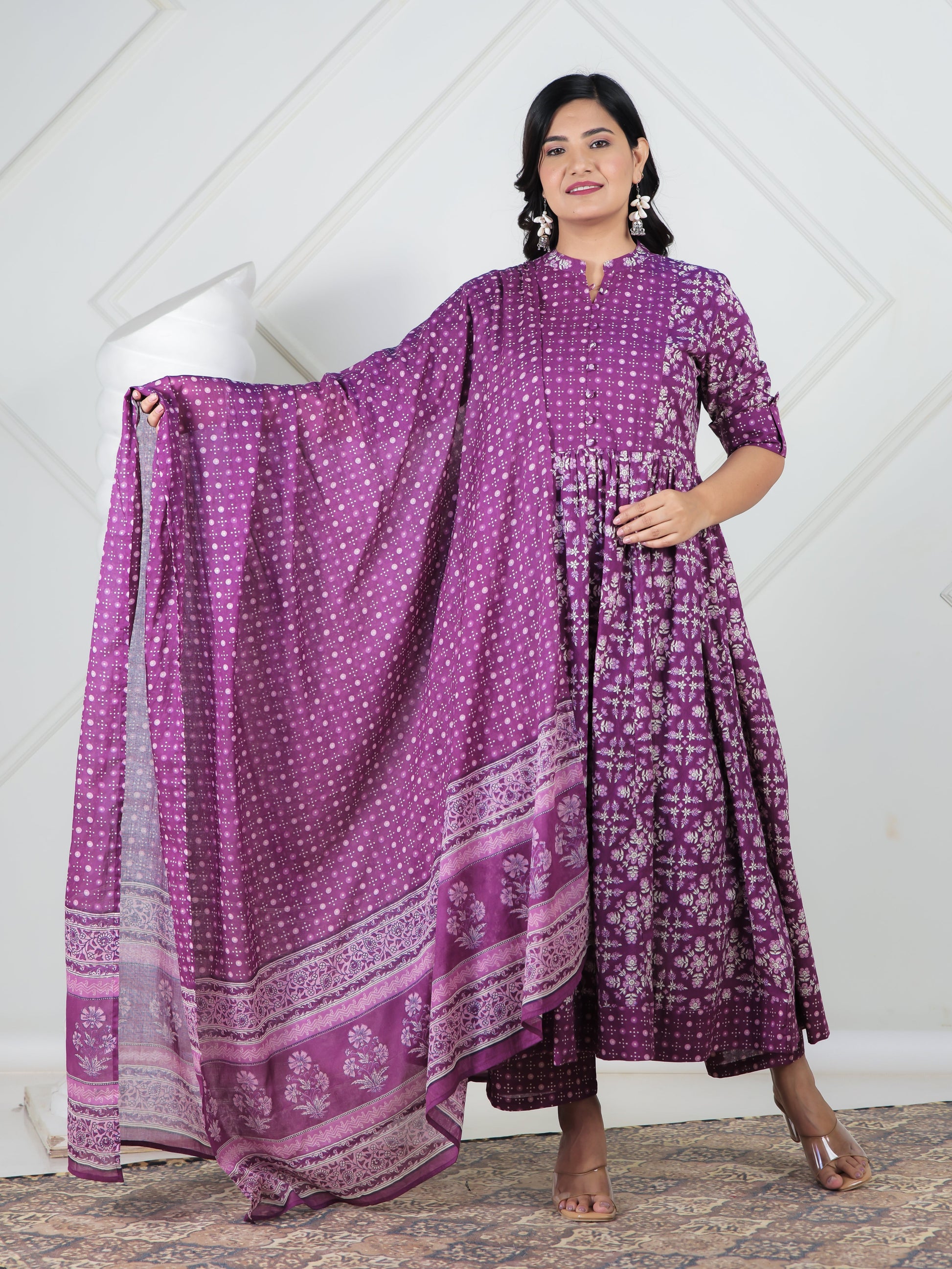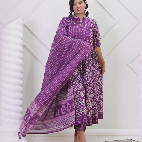 This purple floral kurta & trousers offers the perfect blend of comfort and style. Featuring a sophisticated mandarin collar neck and eye-catching floral design. Complemented by sleek trousers that provide a modern alternative to traditional bottoms. The decorative button loops-patch work adds functional elegance to the design. The panelled silhouette ensures a flattering fit for all body types. The calf length paired with half sleeves creates a proportioned silhouette.
