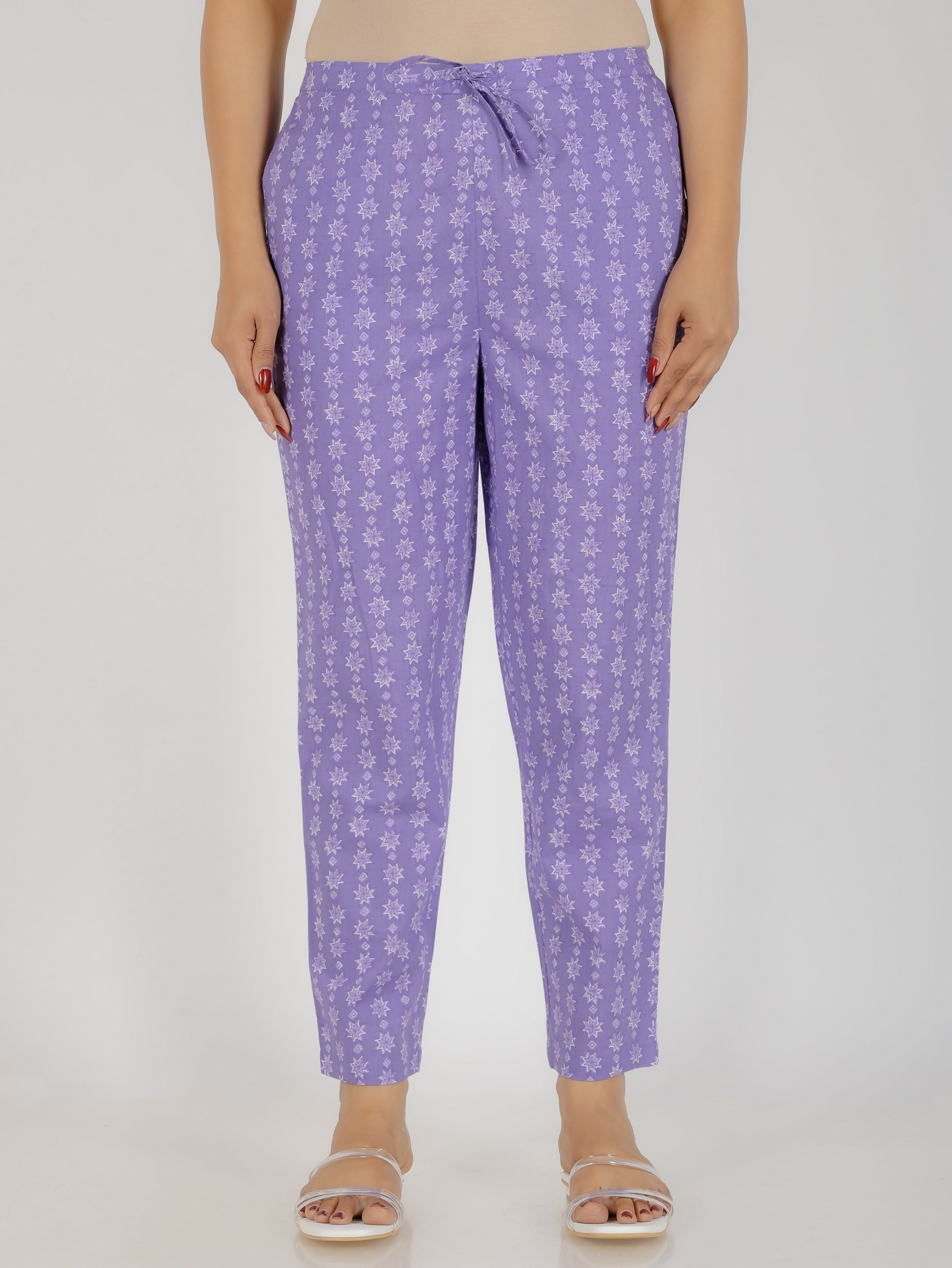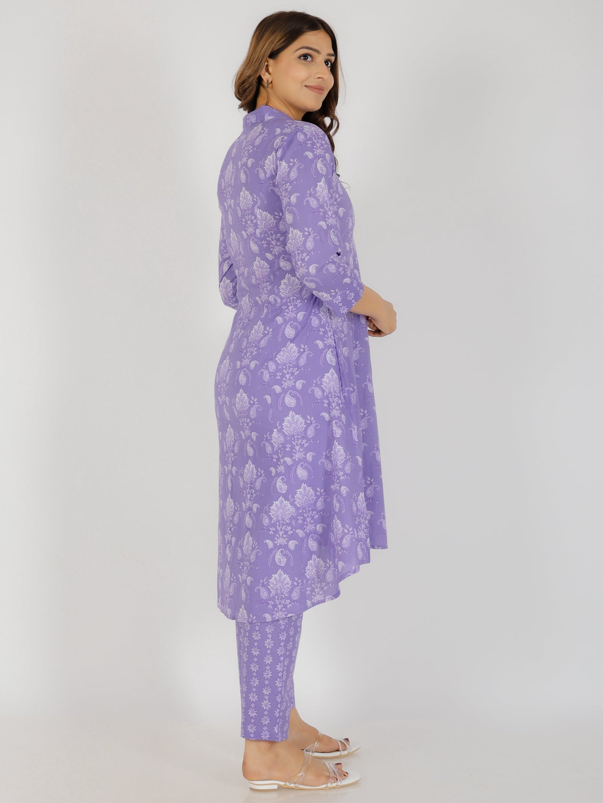 Elevate your ethnic wardrobe with this purple soft cotton kurta. The beautiful floral pattern complements the elegant collared neckline. The statement button work serves as both closures and stylish accents. The contemporary high low hem adds visual interest and creates a modern, dynamic profile. Perfectly tailored with 3/4 sleeve and a calf length for versatile styling. Perfect for everyday elegance or casual settings, with simple machine wash requirements.