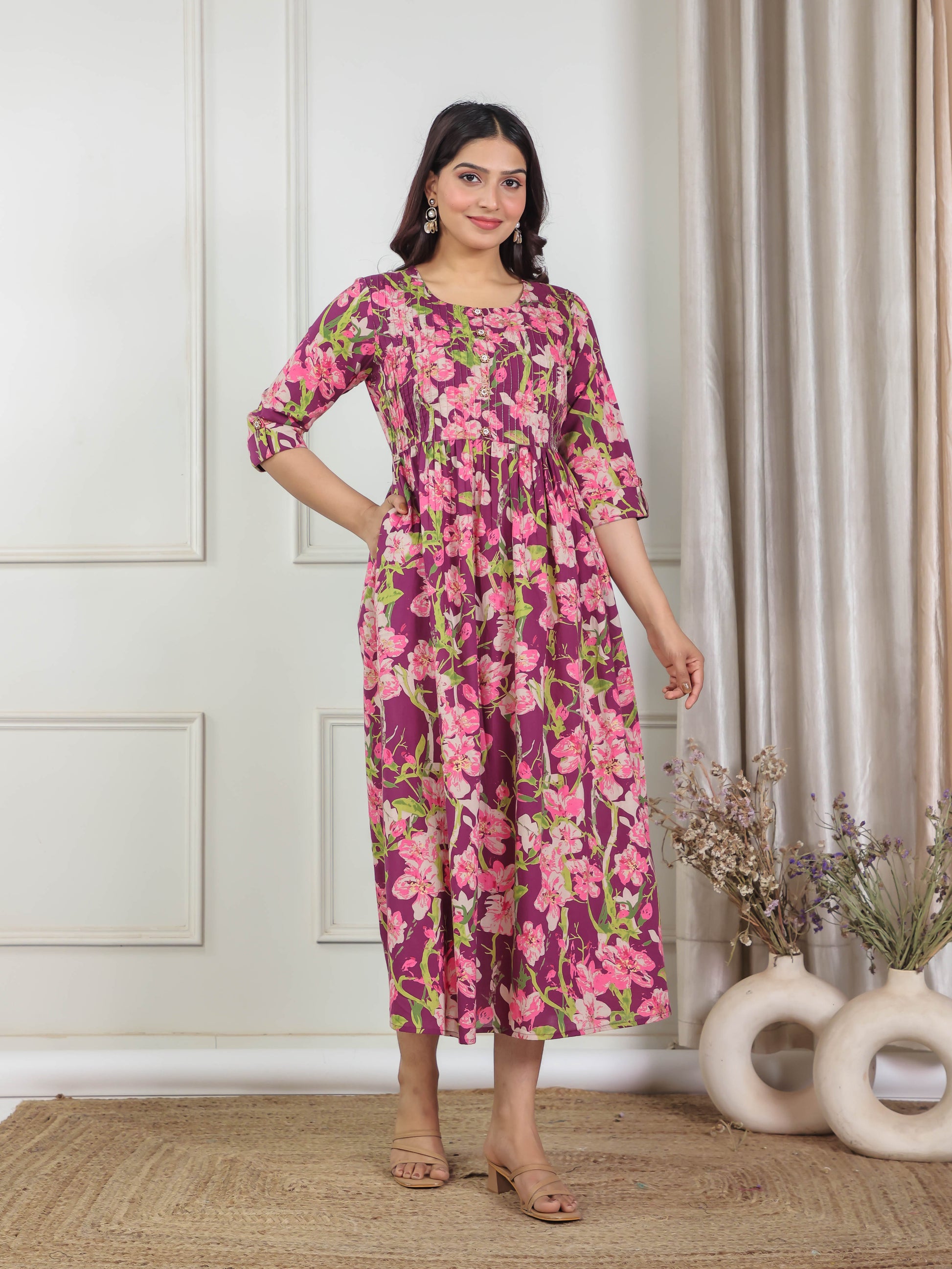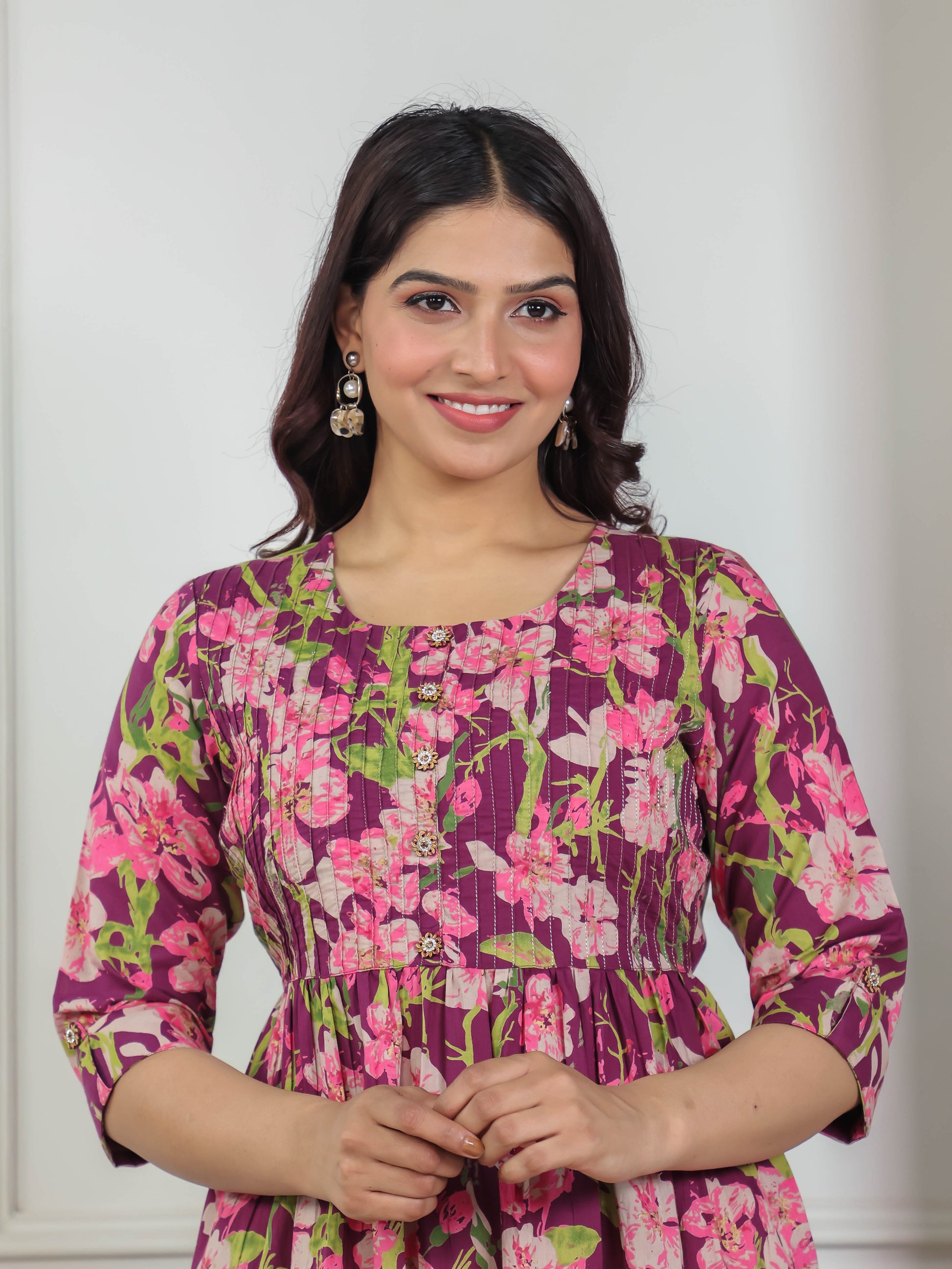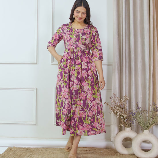 Soft Cotton Floral Flared Purple Kurta