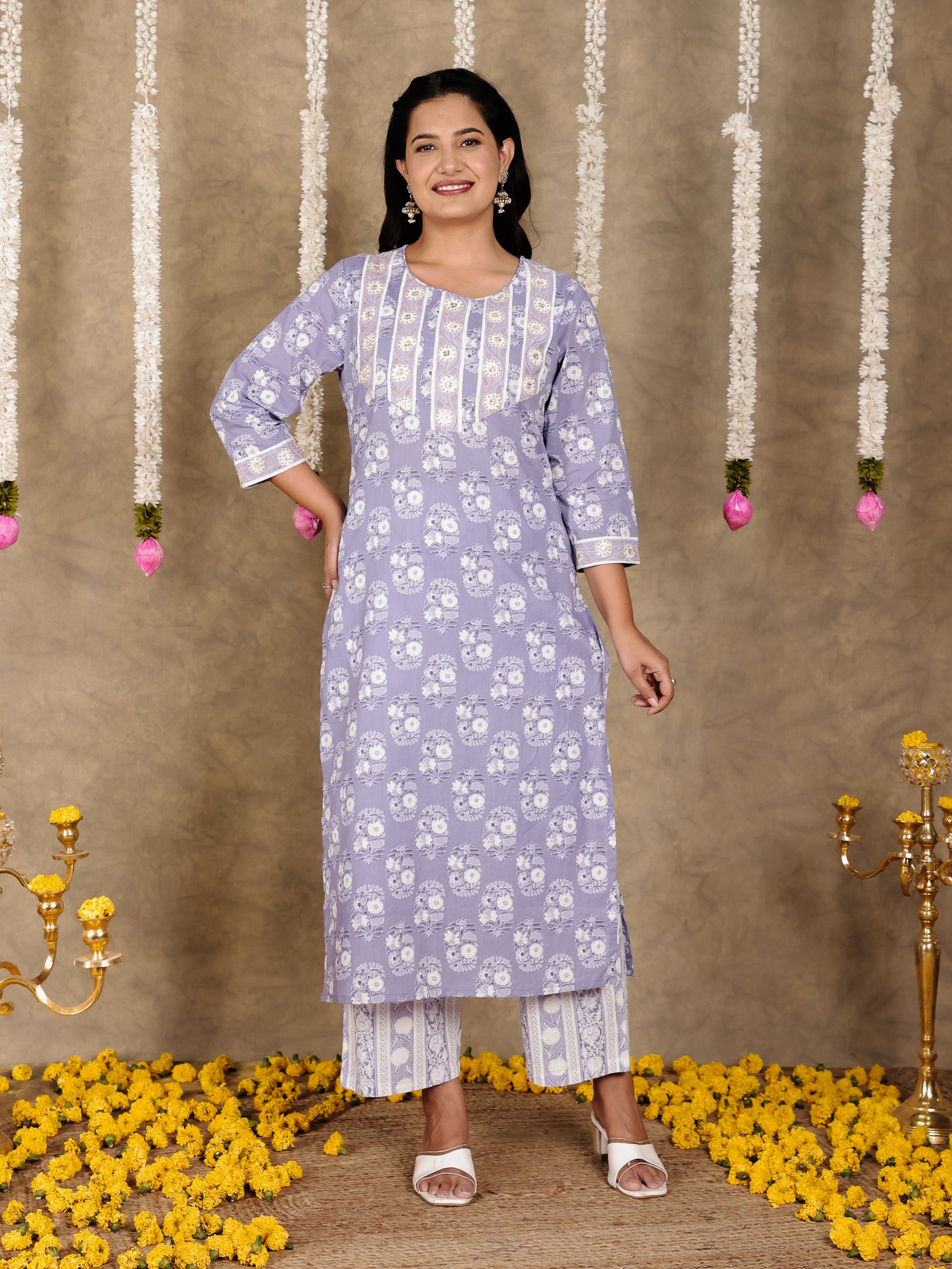 This Purple Soft Cotton kurta with a Straight flare is designed for comfort and style. Featuring a Round neckline, 3/4 Sleeve sleeves, and a graceful Calf Length hemline, it’s perfect for festive wear or semi-formal gatherings. The Floral highlights add depth and texture, making it a standout piece. Accessorise with a contrasting dupatta and keep it pristine by following proper care instructions.