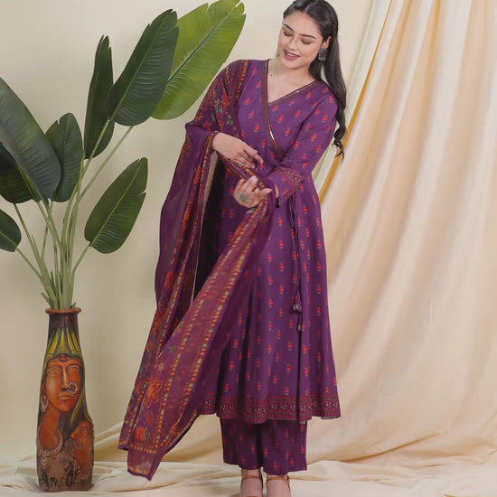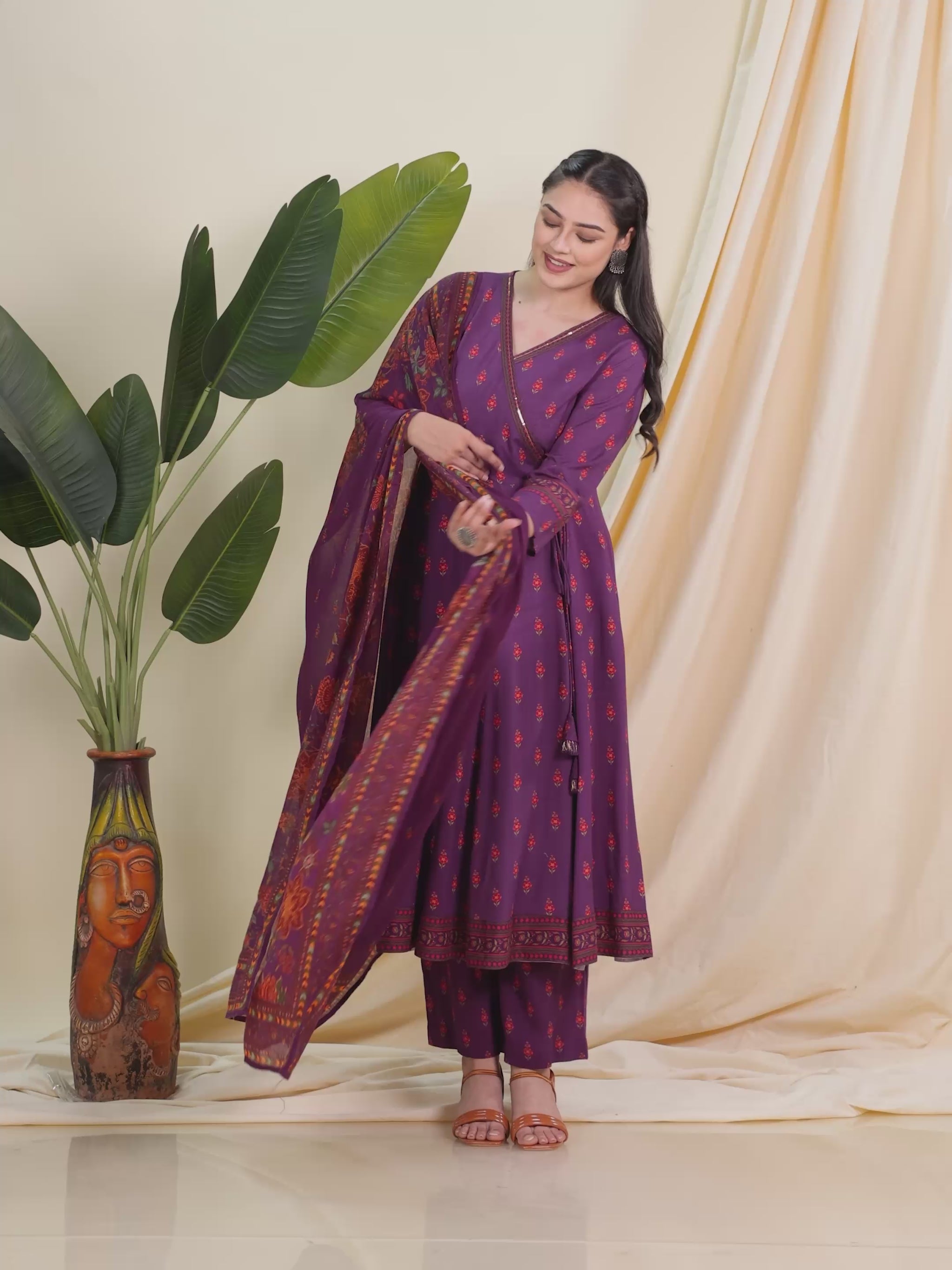 Embroidered Viscose Floral Angrakha Purple Kurta