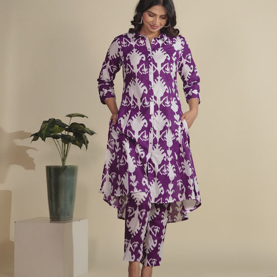 This Purple High Low kurta in soft Soft Cotton is a timeless pick for festive and casual wear. Designed with a Collared neckline and 3/4 Sleeve sleeves, its graceful Calf Length cut flatters all body types. The delicate Ikat detailing adds a touch of sophistication. Pair it with statement earrings and juttis for a polished look. Maintain its pristine look by following proper care instructions.