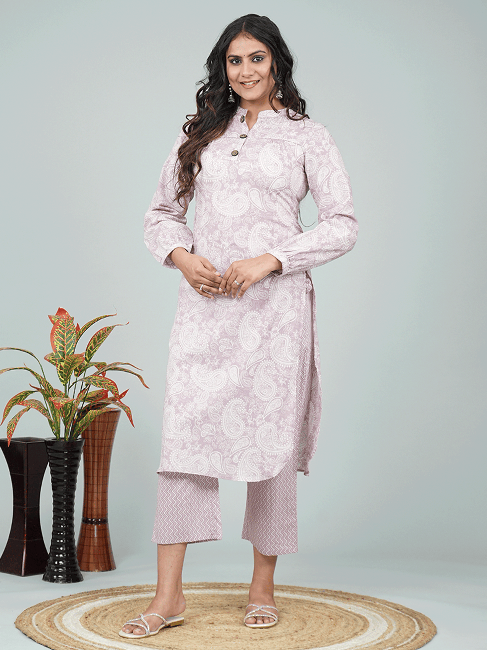 This Purple Straight kurta in soft Soft Cotton is a timeless pick for festive and casual wear. Designed with a Mandarin Collar neckline and Full Sleeves sleeves, its graceful Calf Length cut flatters all body types. The delicate Paisley detailing adds a touch of sophistication. Pair it with statement earrings and juttis for a polished look. Maintain its pristine look by following proper care instructions.