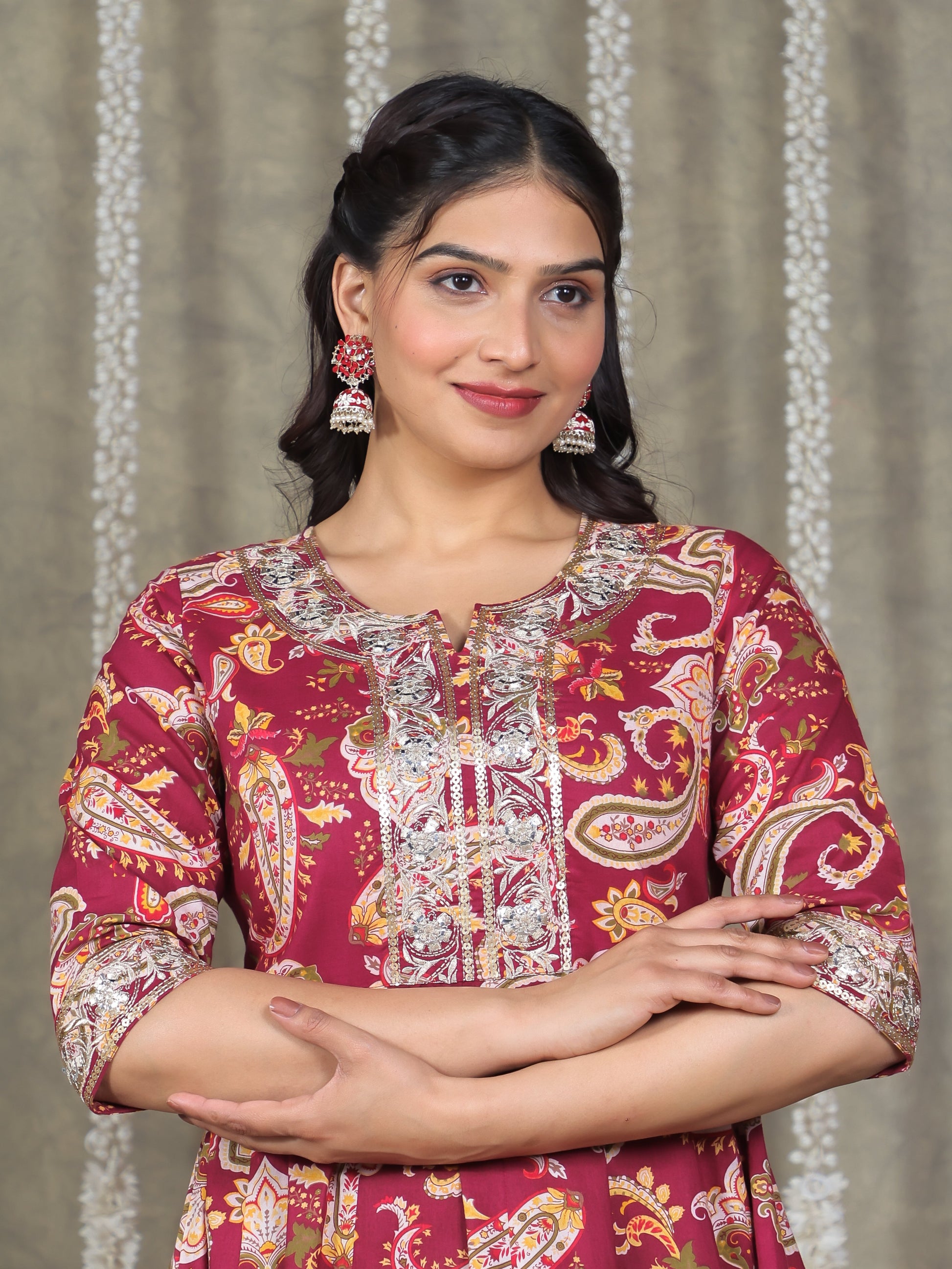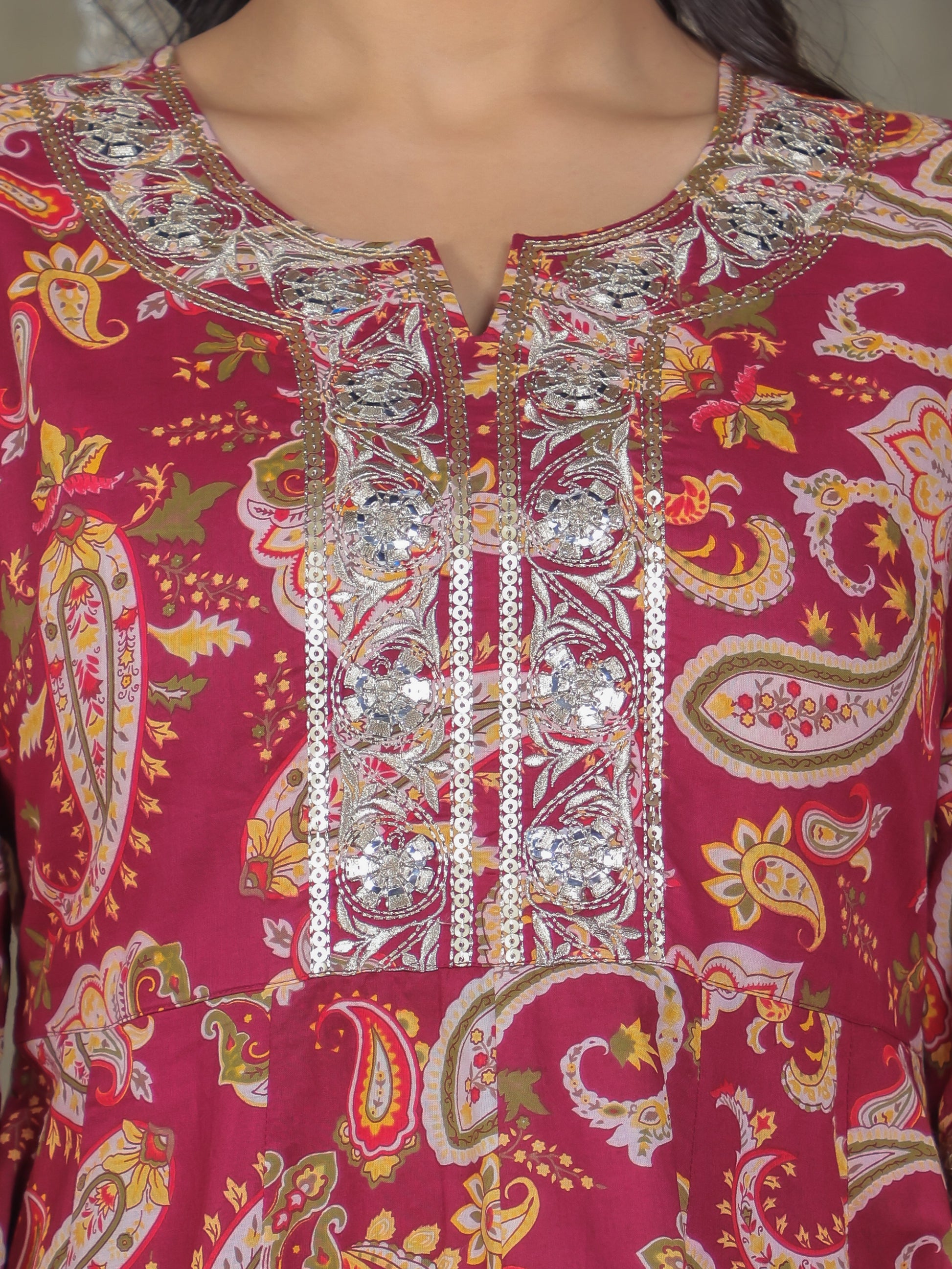 Crafted from breathable Soft Cotton, this Anarkali kurta in Purple blends traditional design with everyday comfort. The Paisley finish adds artisanal charm, while the Calf Length silhouette ensures effortless elegance. Style with palazzos or leggings for versatile looks, from workdays to weekend outings. Designed for easy care, this kurta stays beautiful with simple care instructions.