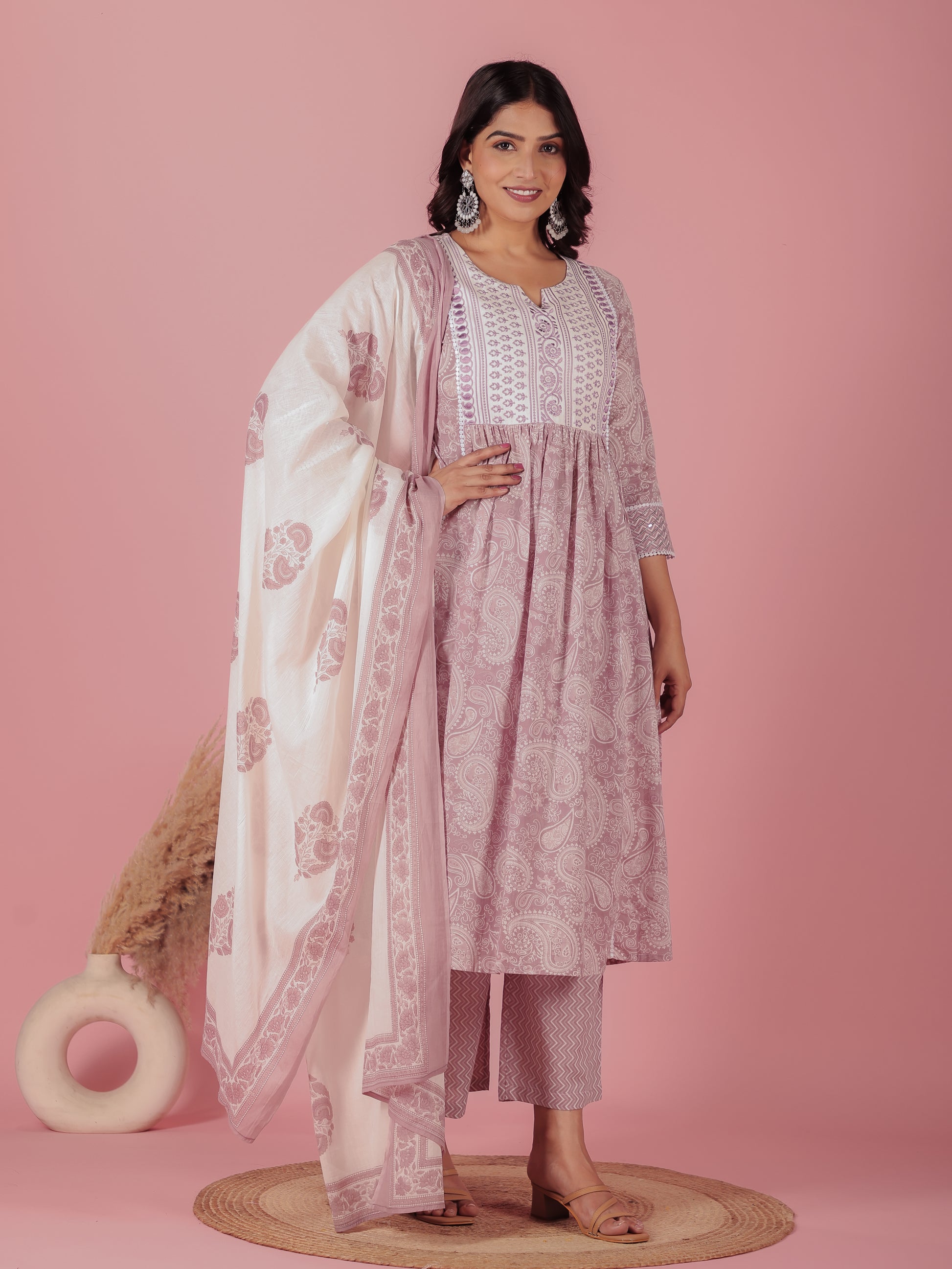 Embroidered Soft Cotton Paisley Flared Mauve Kurta