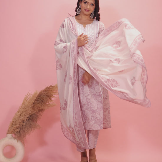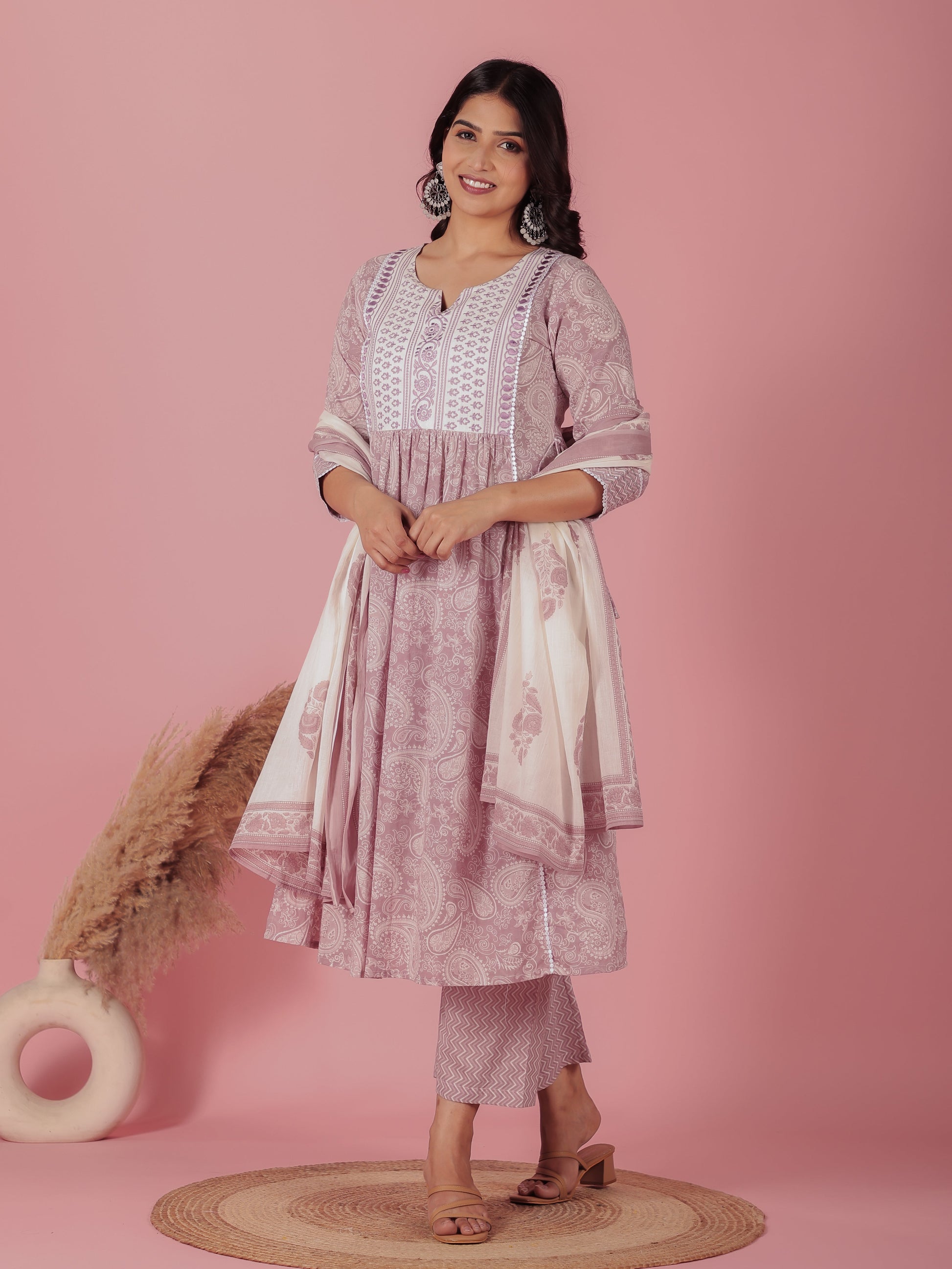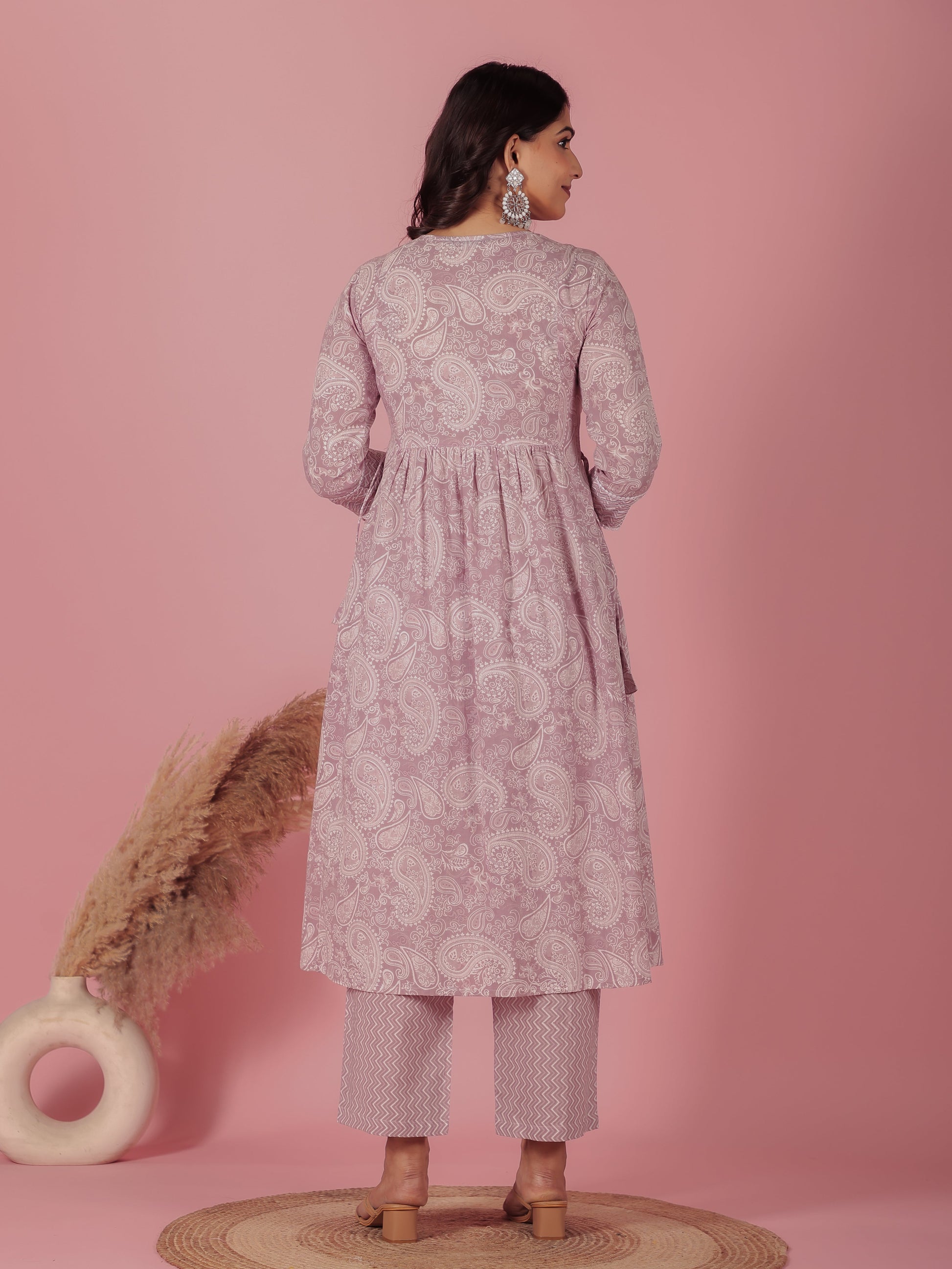 Embroidered Soft Cotton Paisley A-line Mauve Kurta