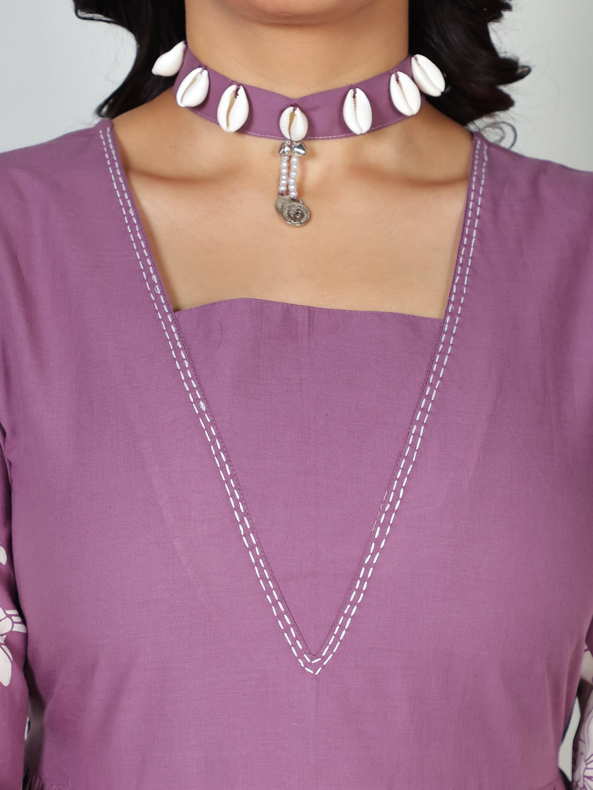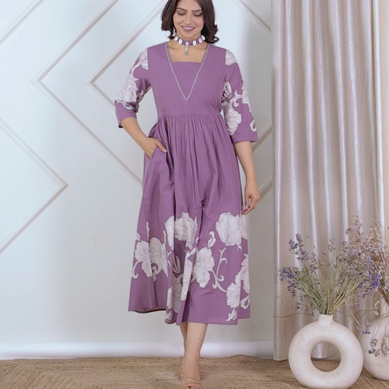 Embroidered Soft Cotton Placement Print Flared Purple Dress