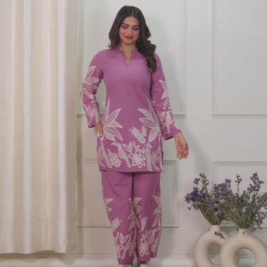Soft Cotton Placement Print Straight Purple Co-Ord