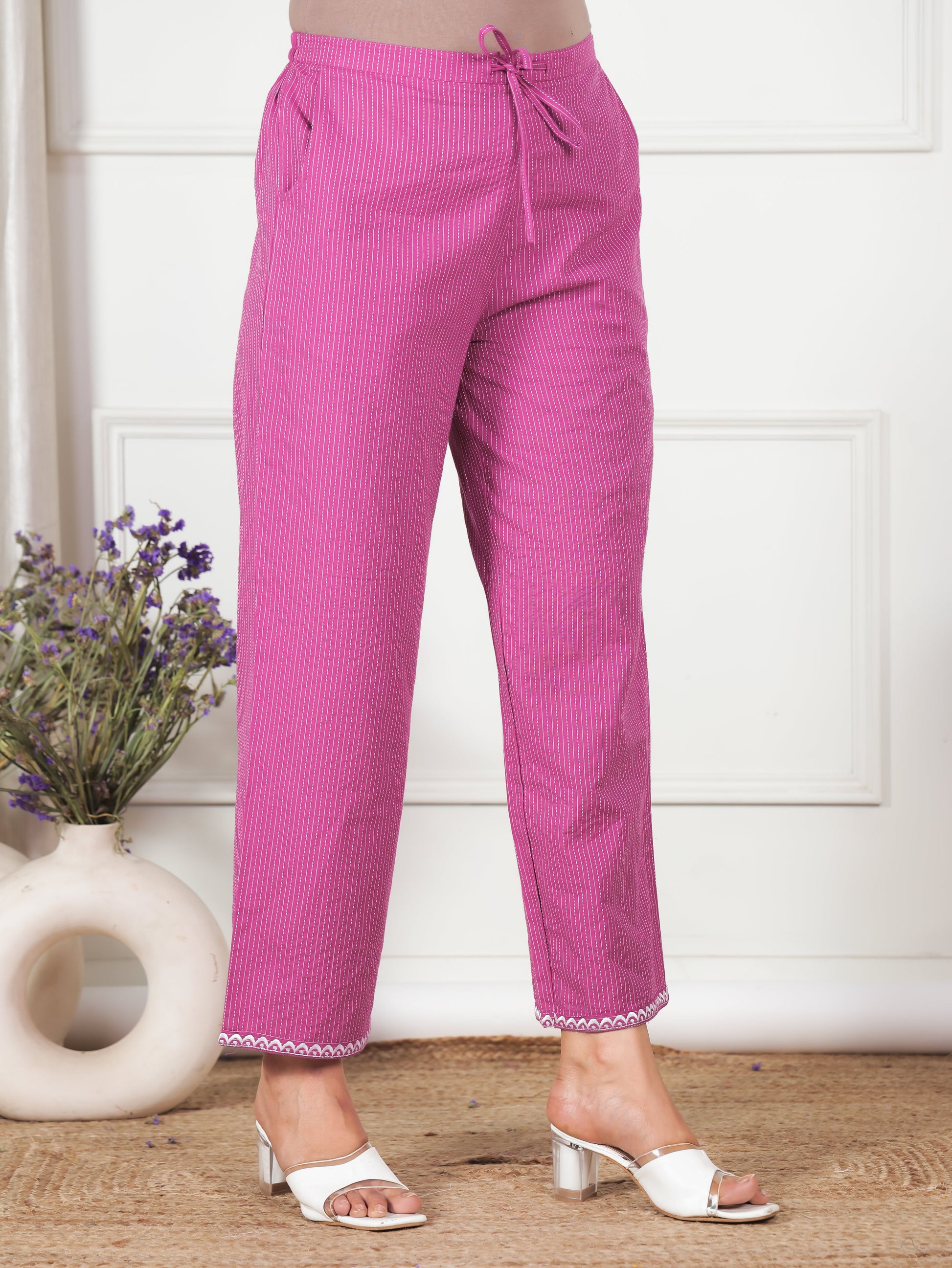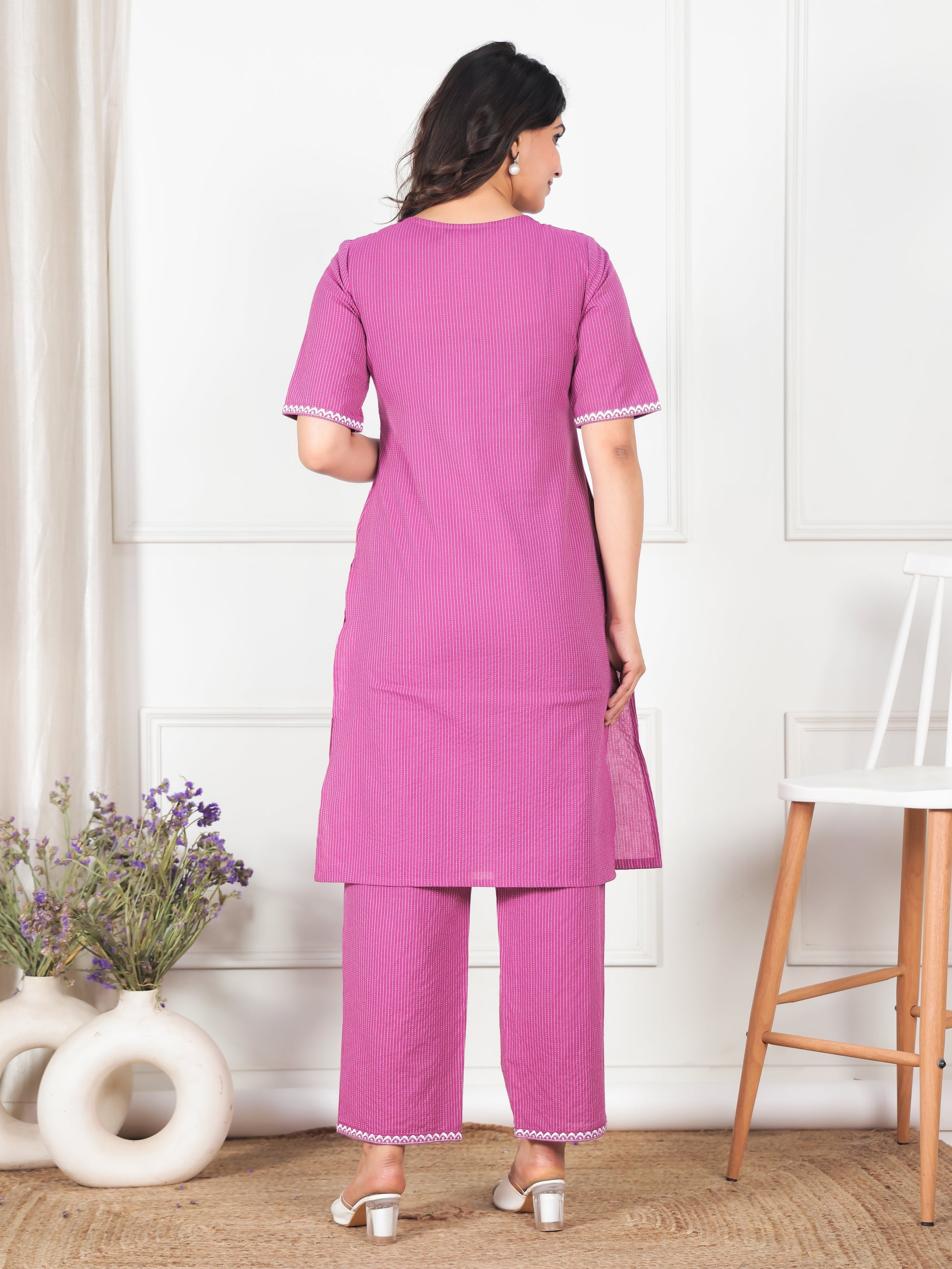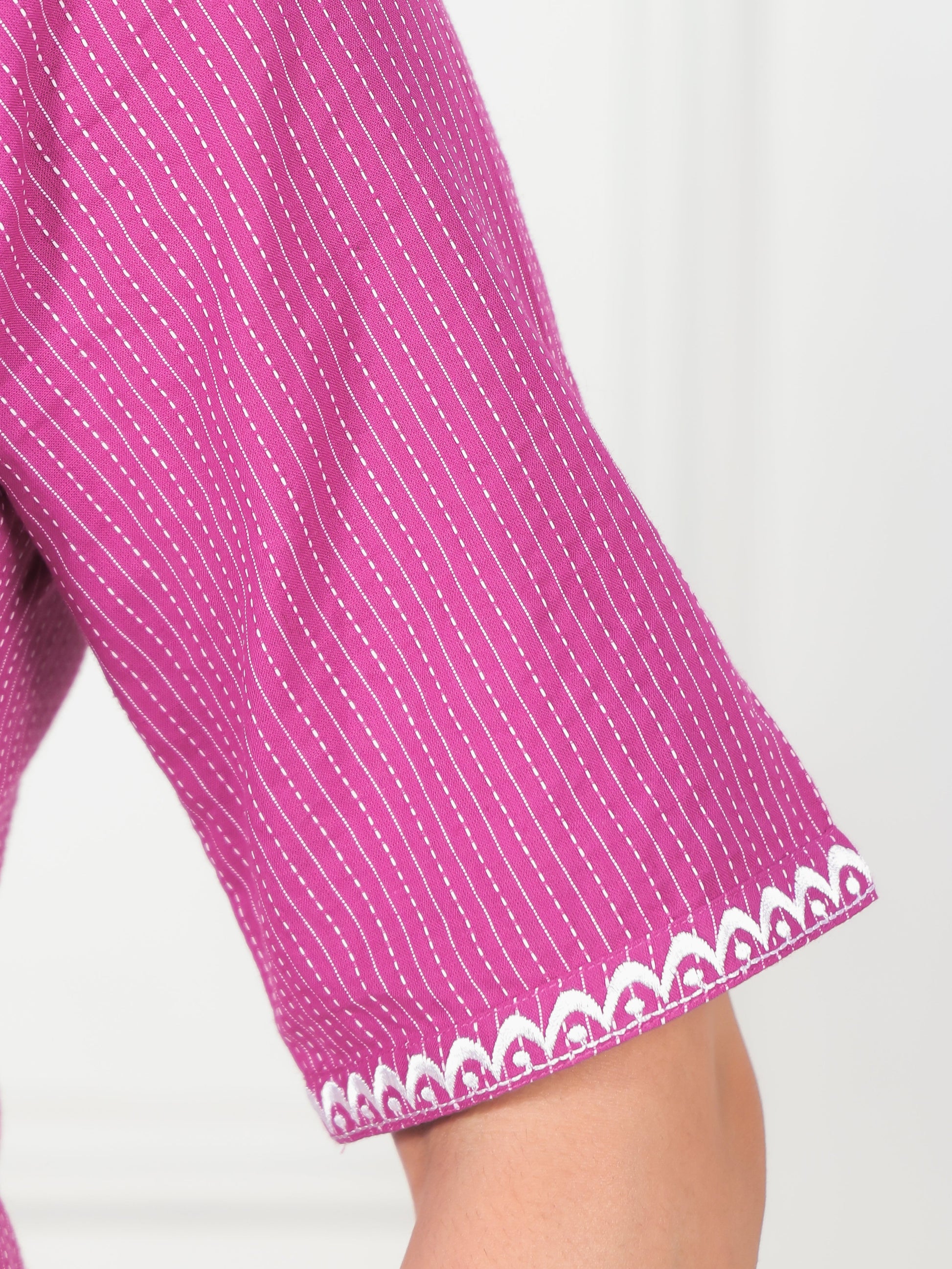This Purple Straight kurta in soft Kantha Cotton is a timeless pick for festive and casual wear. Designed with a Keyhole neckline and Half Sleeves sleeves, its graceful Knee Length cut flatters all body types. The delicate Solid detailing adds a touch of sophistication. Pair it with statement earrings and juttis for a polished look. Maintain its pristine look by following proper care instructions.