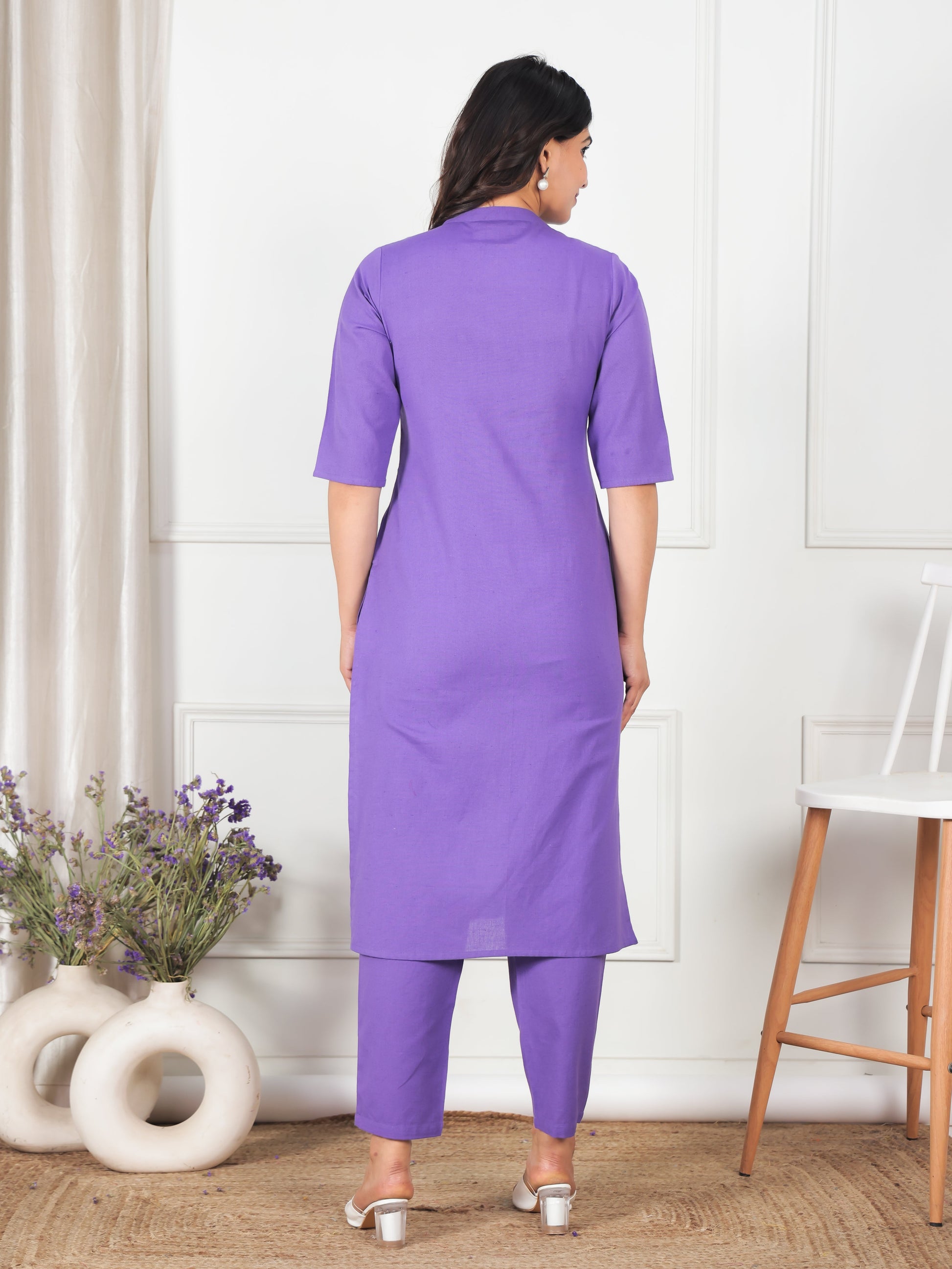 Crafted from breathable Linen Cotton, this Straight kurta in Purple blends traditional design with everyday comfort. The Solid finish adds artisanal charm, while the Calf Length silhouette ensures effortless elegance. Style with palazzos or leggings for versatile looks, from workdays to weekend outings. Designed for easy care, this kurta stays beautiful with simple care instructions.