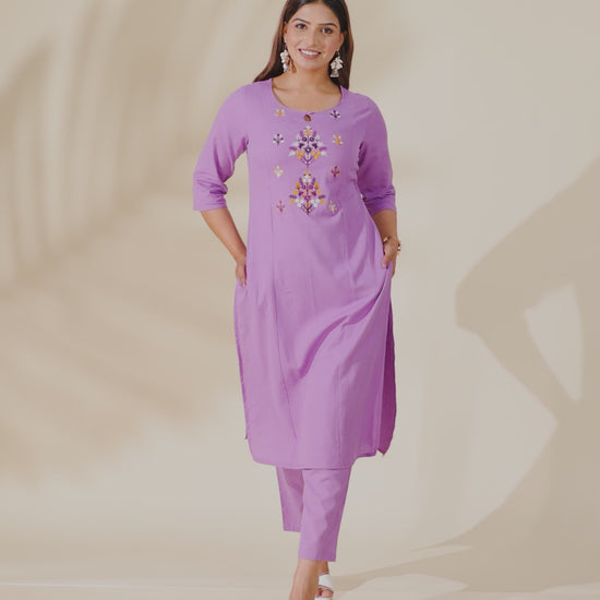 Embroidered Linen Cotton Solid Panelled Purple Kurta