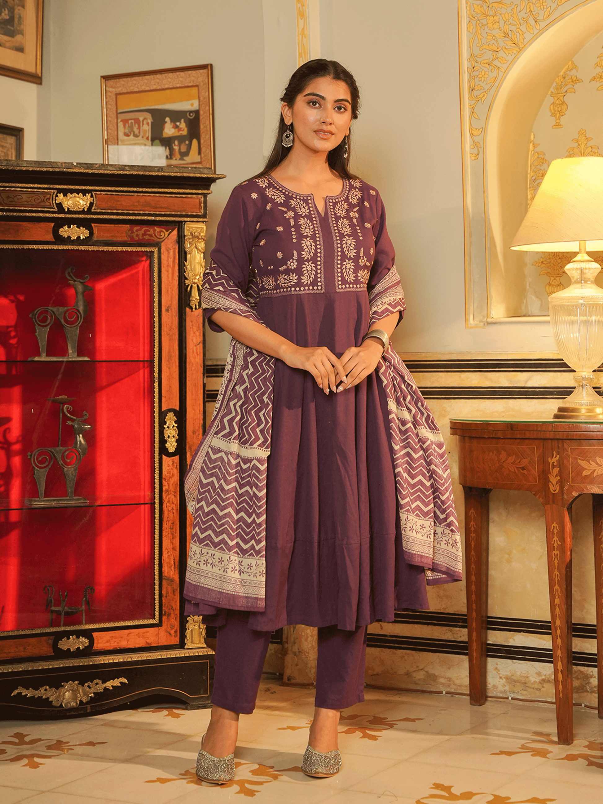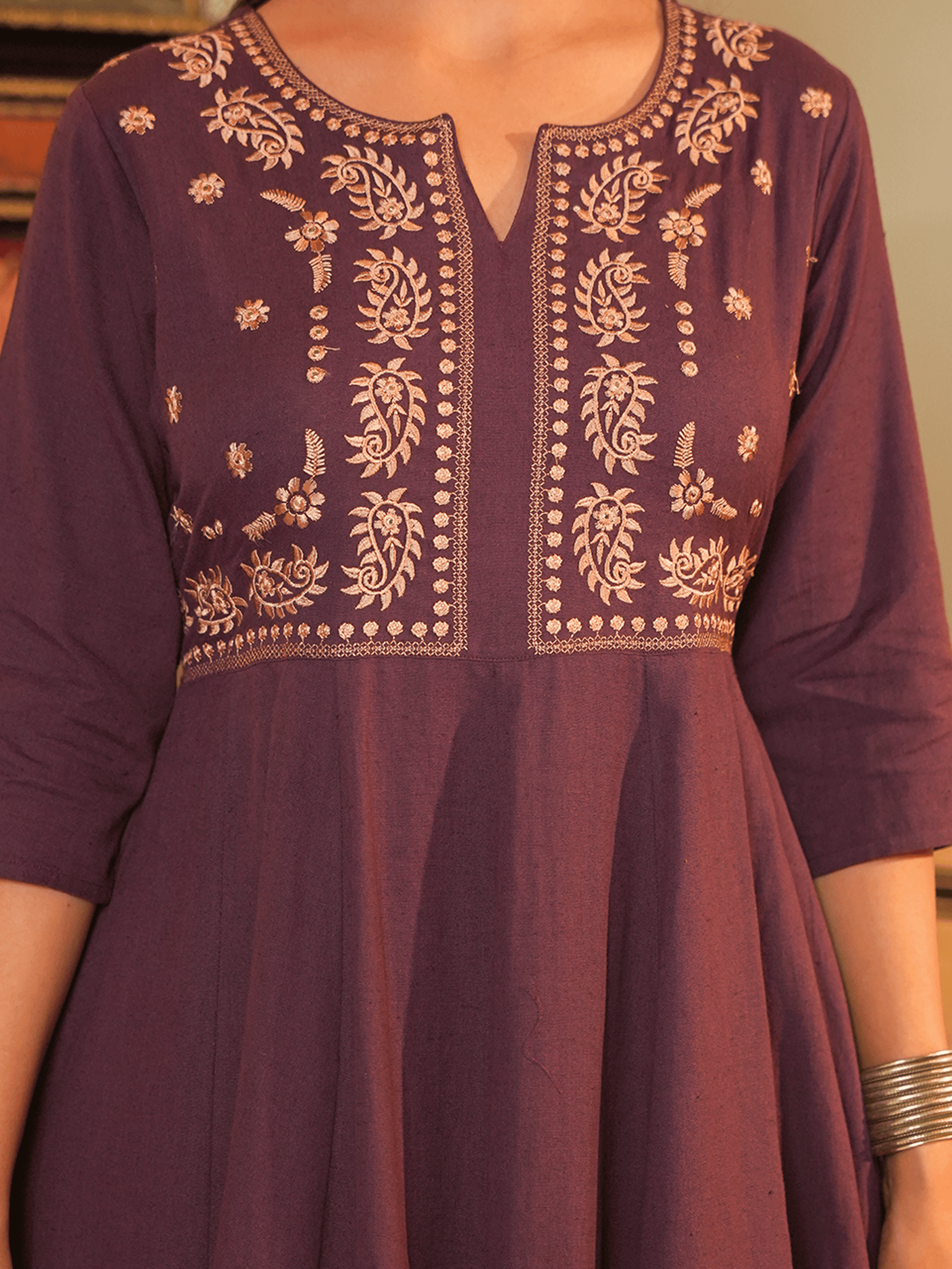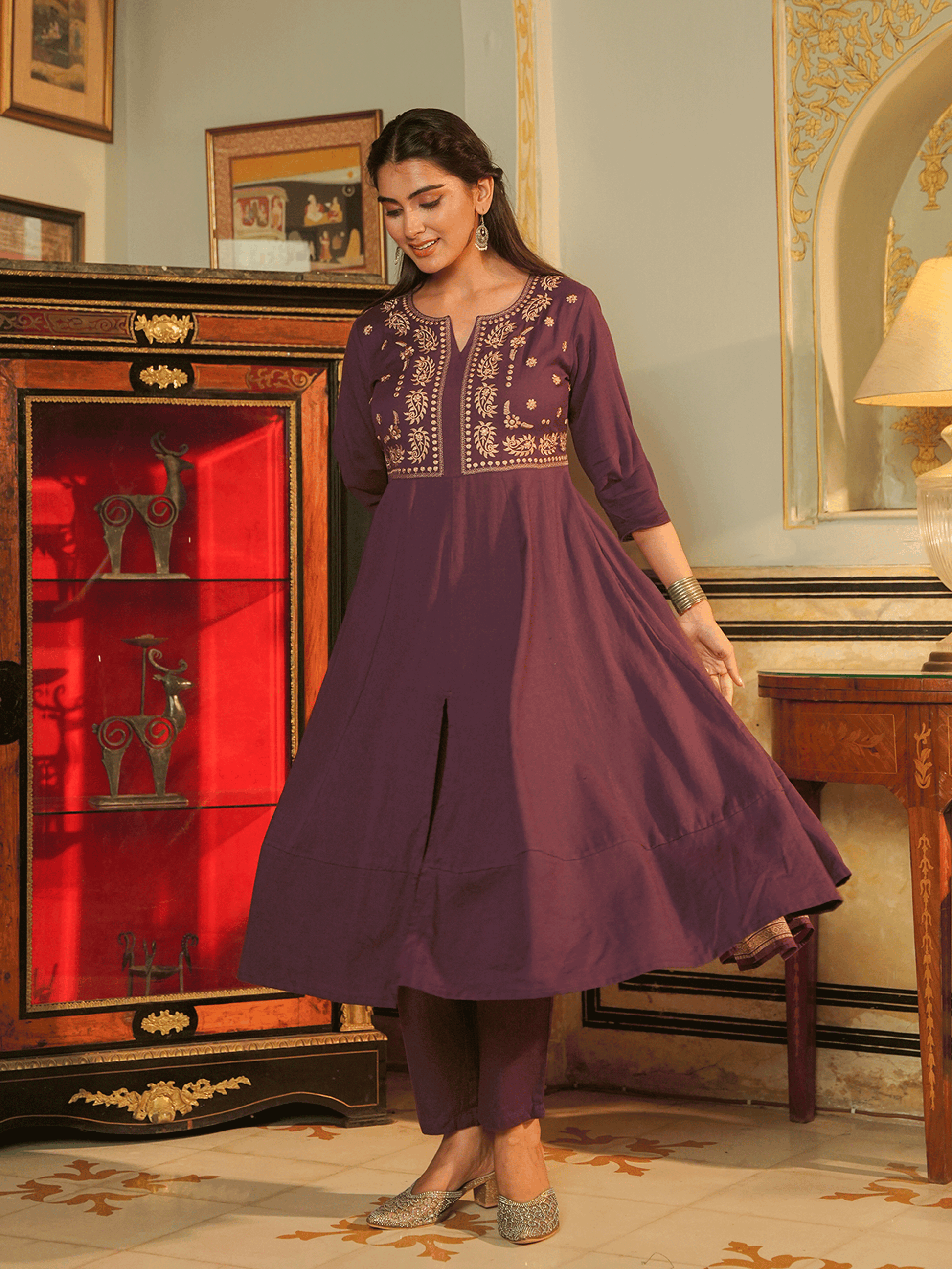 Embroidered Linen Cotton Solid Anarkali Purple Kurta