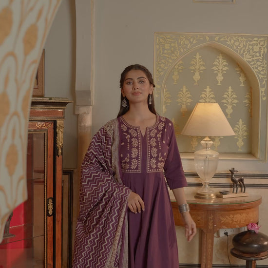 Elevate your ethnic wardrobe with this purple linen cotton kurta. This round neckline creates a soft, feminine finish to the design. The intricate embroidered work showcases exceptional craftsmanship. This magnificent anarkali style kurta creates a statement-making silhouette that commands attention. The calf length paired with 3/4 sleeve creates a proportioned silhouette. Perfect for everyday elegance or casual settings, with simple machine wash requirements.