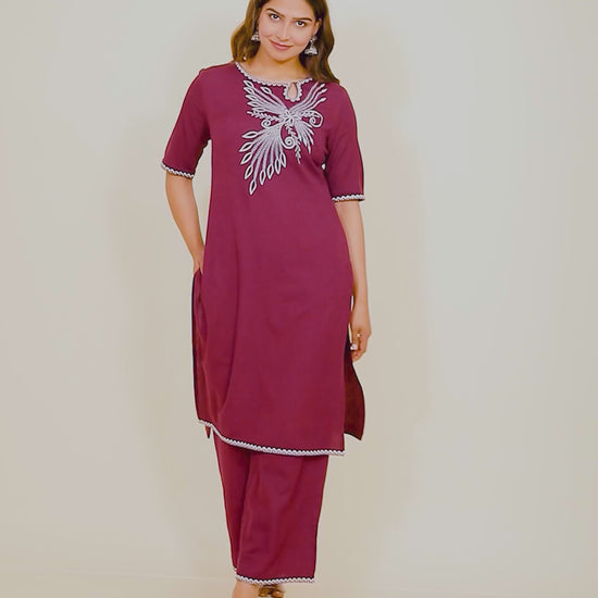 Embroidered Linen Cotton Solid Straight Maroon Kurta