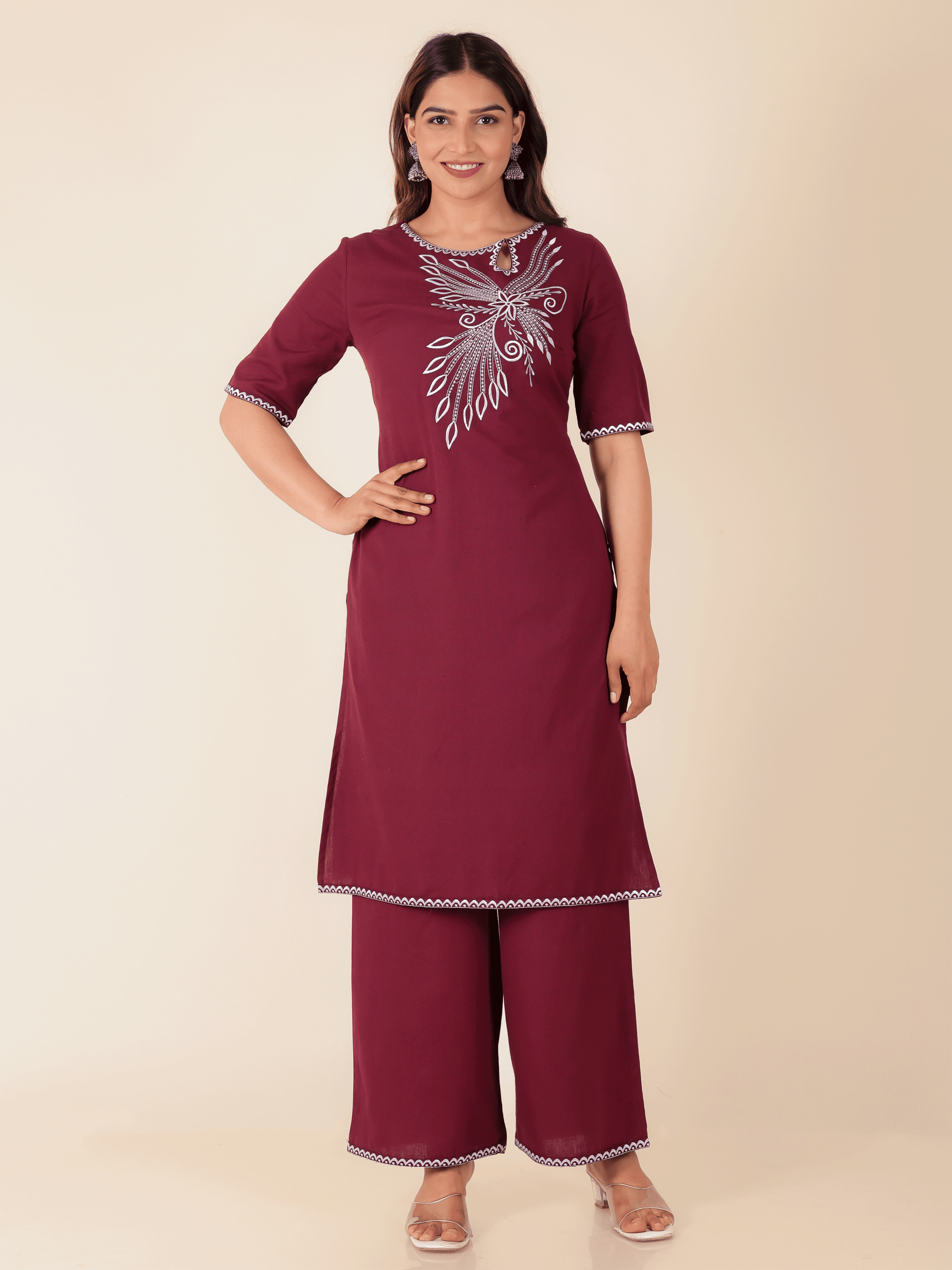 This Maroon Linen Cotton kurta with a Straight flare is designed for comfort and style. Featuring a Keyhole neckline, Short Sleeve sleeves, and a graceful Knee Length hemline, it’s perfect for festive wear or semi-formal gatherings. The Solid highlights add depth and texture, making it a standout piece. Accessorise with a contrasting dupatta and keep it pristine by following proper care instructions.